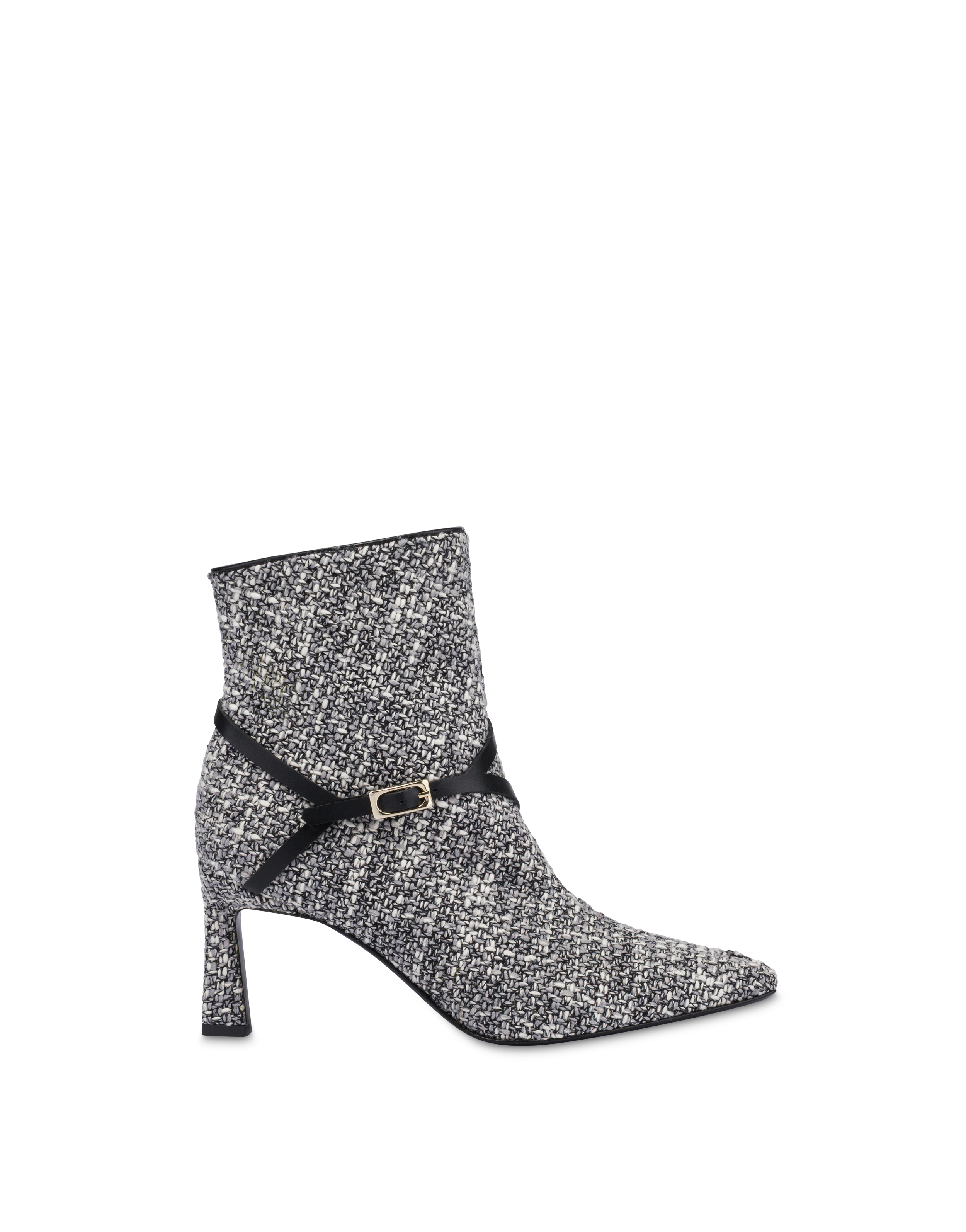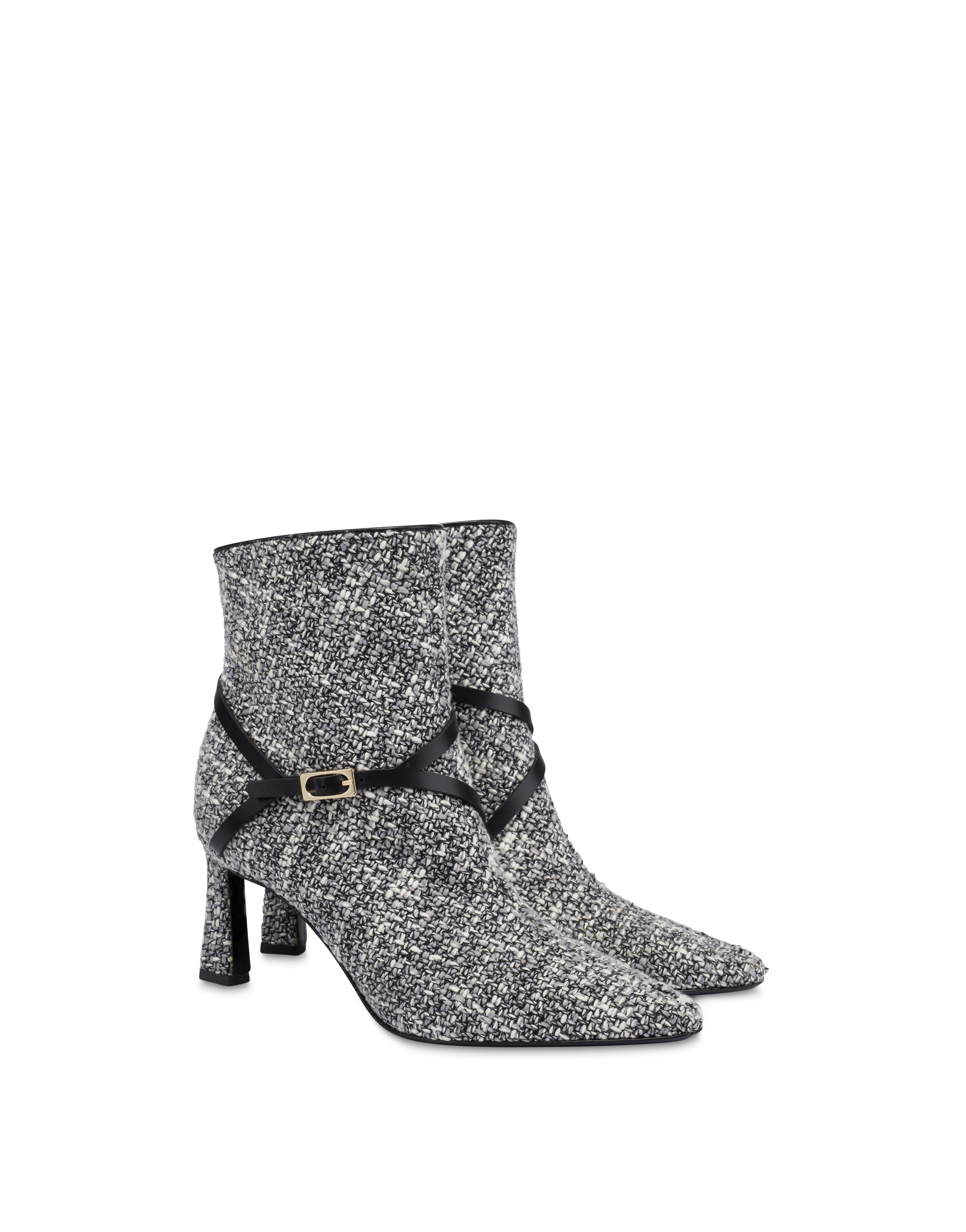 Der Bootie Double U ist ein Modell, das sich durch eine raffinierte Kombination von Materialien auszeichnet, mit Einsätzen aus roh geschnittenem Kalbsleder, die sich harmonisch mit dem Tweed-Stoff verbinden. Dieser Bootie ist die perfekte Wahl für alle, die einen eleganten, aber auch praktischen und vielseitigen Schuh suchen. Die dekorative Schnalle in hell vergoldeter Galvanik rundet das Design mit einem leuchtenden und raffinierten Akzent ab.