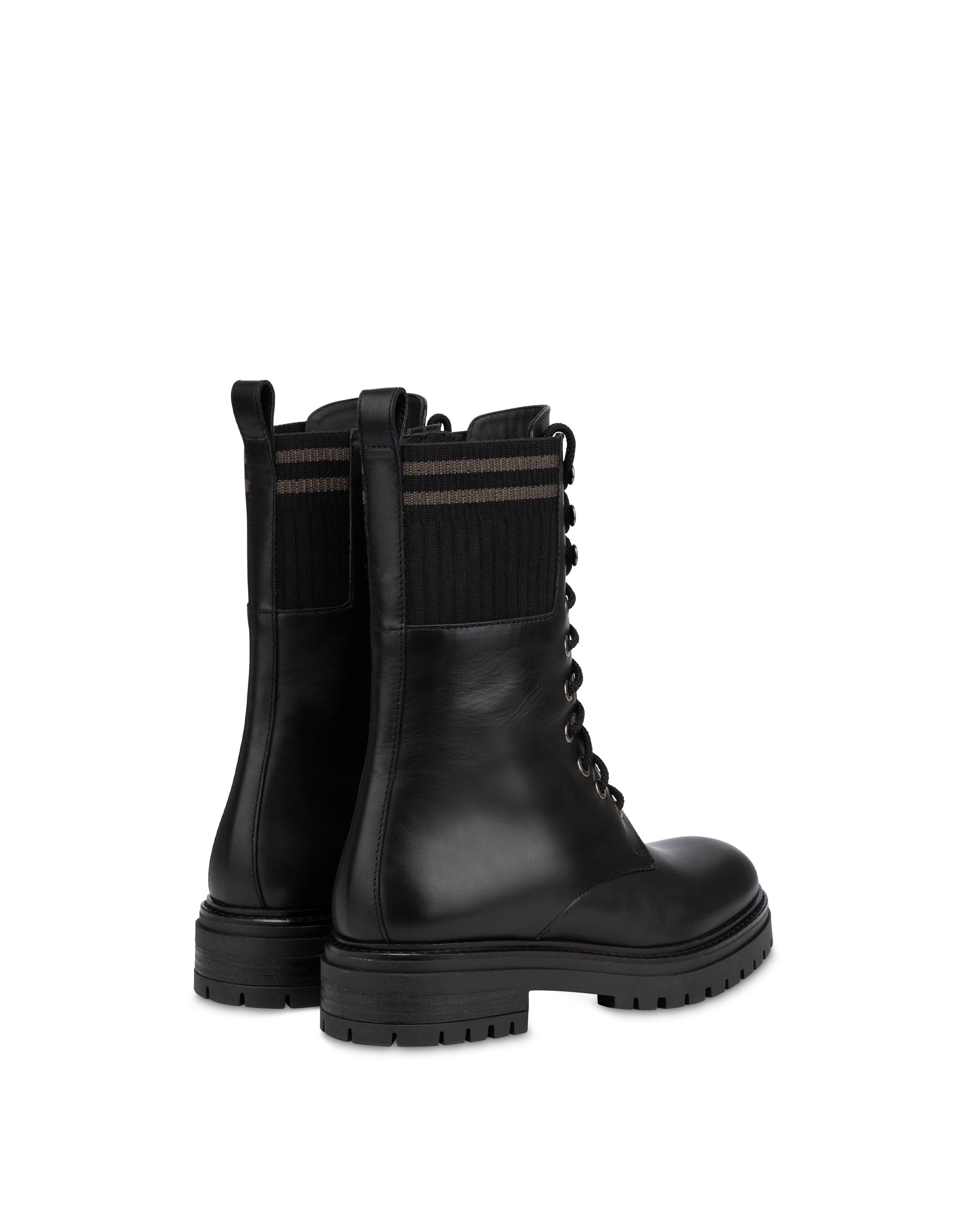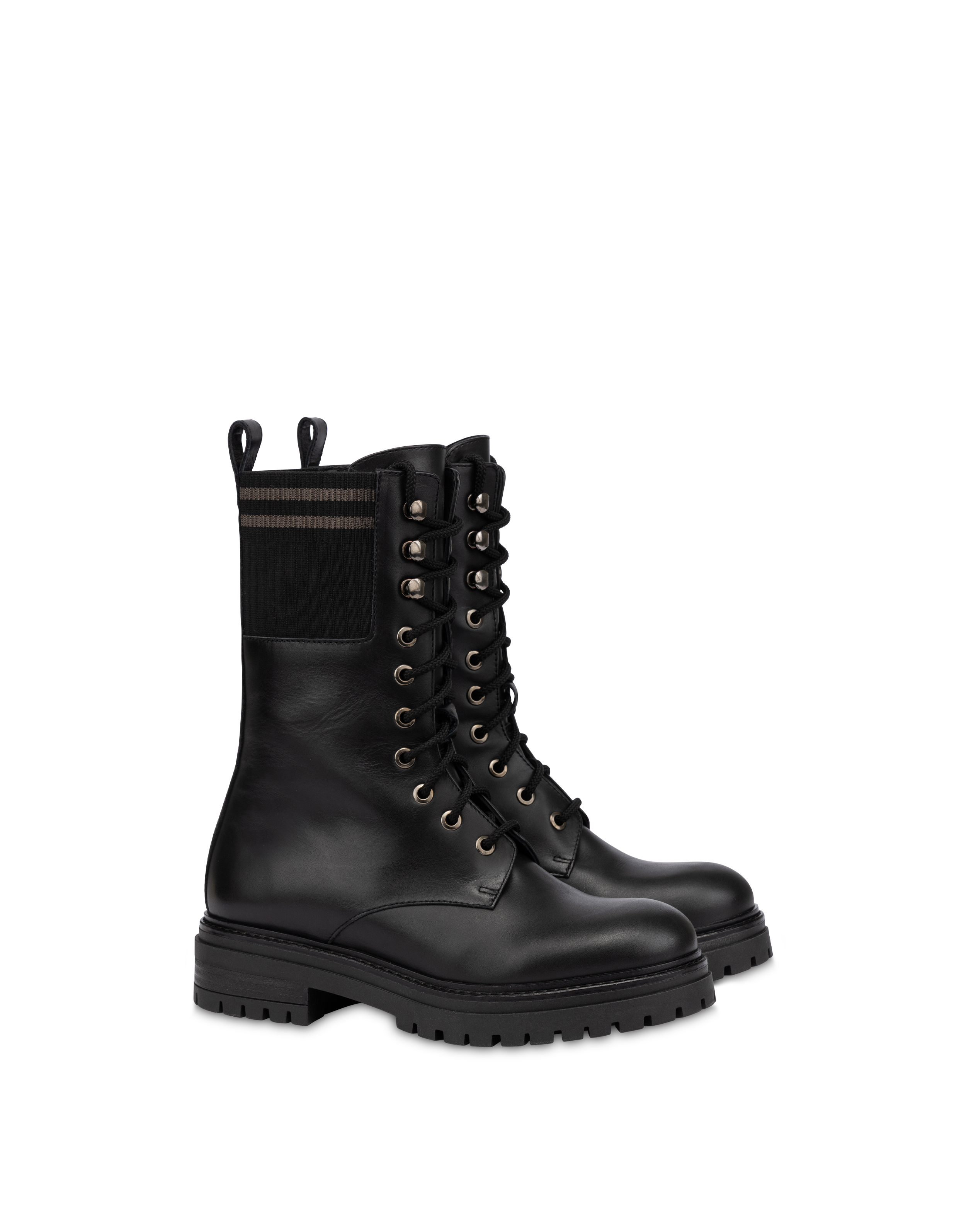 Der Combat-Boot kombiniert Charakter und Funktionalität in einem modernen Design. Er ist aus edlem Kalbsleder gefertigt und zeichnet sich durch seine markante, zeitgemäße Linie aus. Das Lederfutter sorgt für Komfort und Atmungsaktivität, während die Gummisohle mit Stollenprofil Grip und Widerstandsfähigkeit gewährleistet. Der Elastikschaft mit Socken-Effekt sorgt für eine perfekte Passform und einen Hauch von Modernität. Ein vielseitiges und unverwechselbares Modell, perfekt, um der Saison stilvoll zu begegnen.