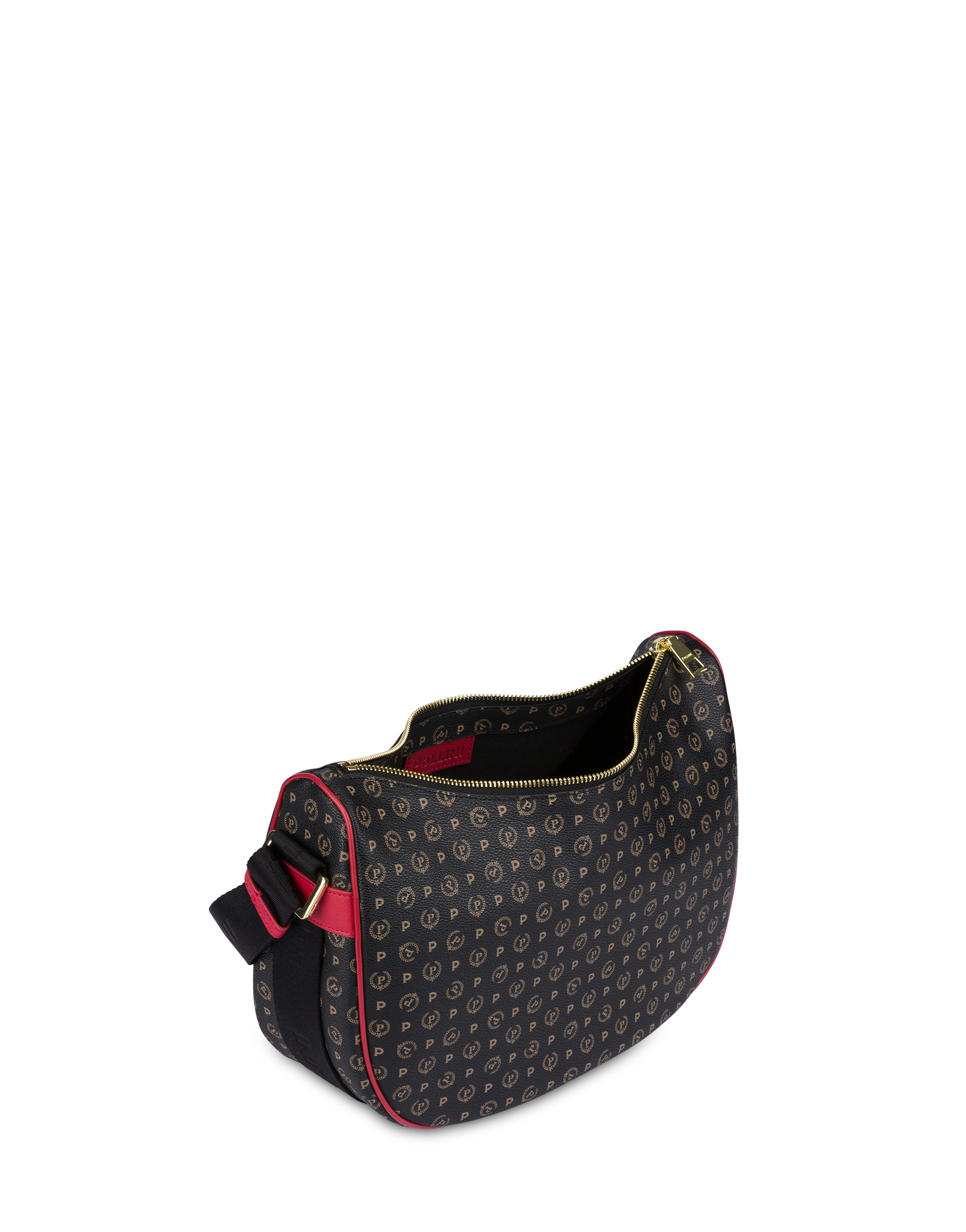 Hobo Bag Heritage PVC-Kollektion. Das ikonische Allover-Muster verleiht einen eleganten und zeitlosen Look. Das Pollini-Logo-Band verläuft entlang der Seite der Tasche und verwandelt sich in einen Schulterriemen.