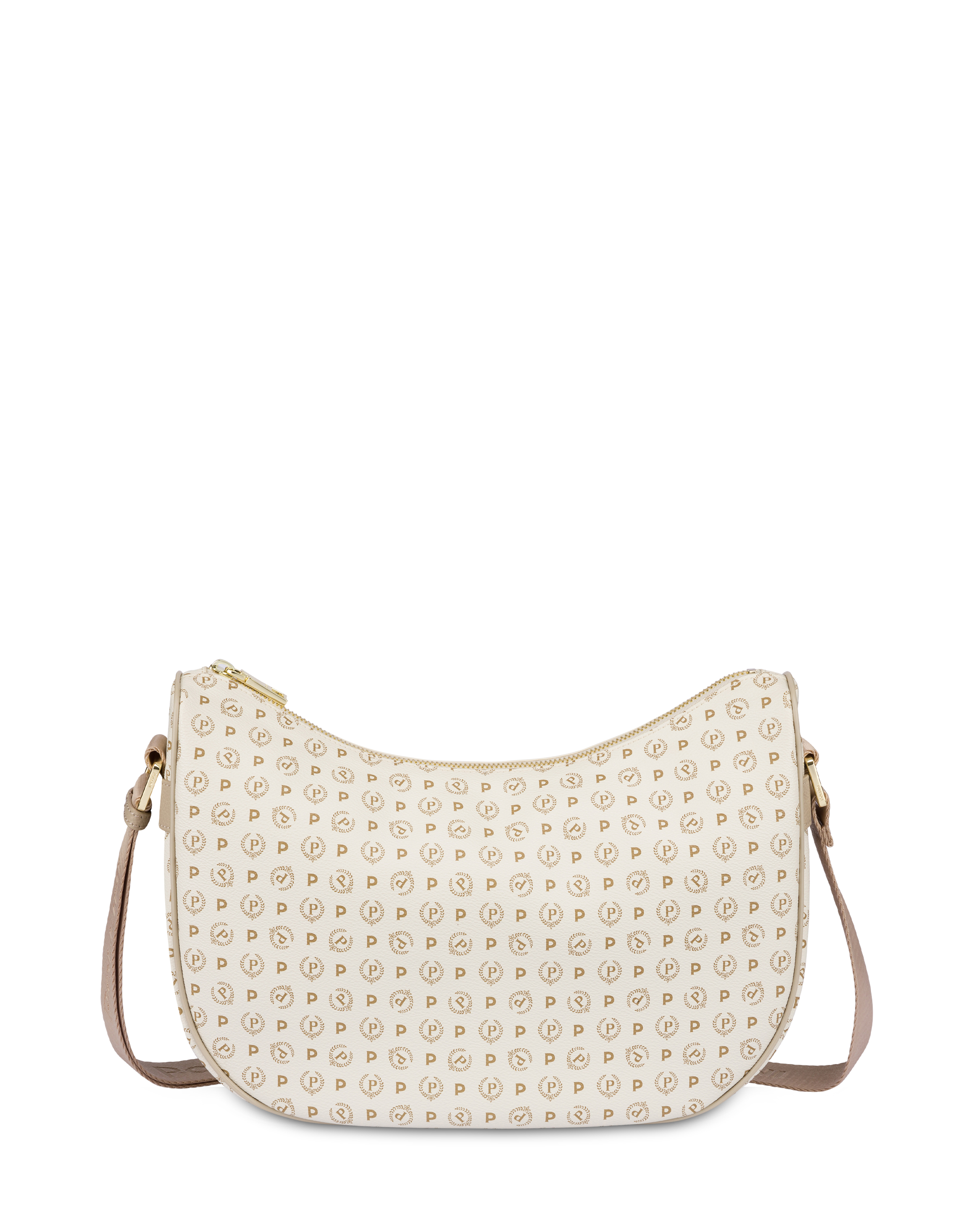 Hobo Bag Heritage PVC-Kollektion. Das ikonische Allover-Muster verleiht einen eleganten und zeitlosen Look. Das Pollini-Logo-Band verläuft entlang der Seite der Tasche und verwandelt sich in einen Schulterriemen.
