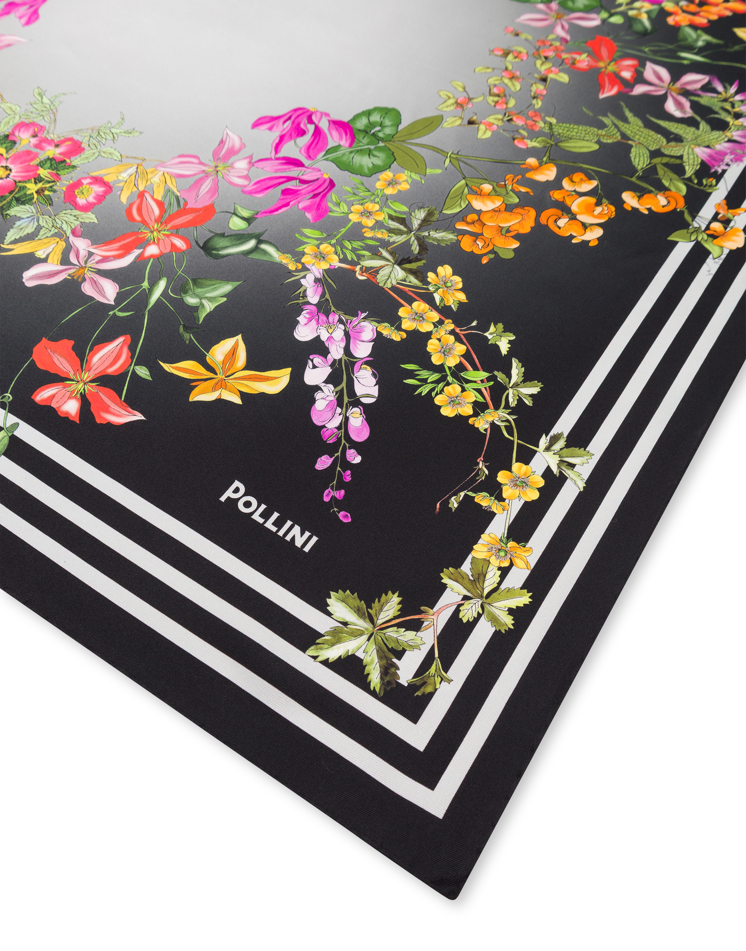 Schal aus Seidentwill mit malerischem Druck mit kreisförmigen Blumen. Der dreifache Kontrastrahmen schafft ein geometrisches Detail.