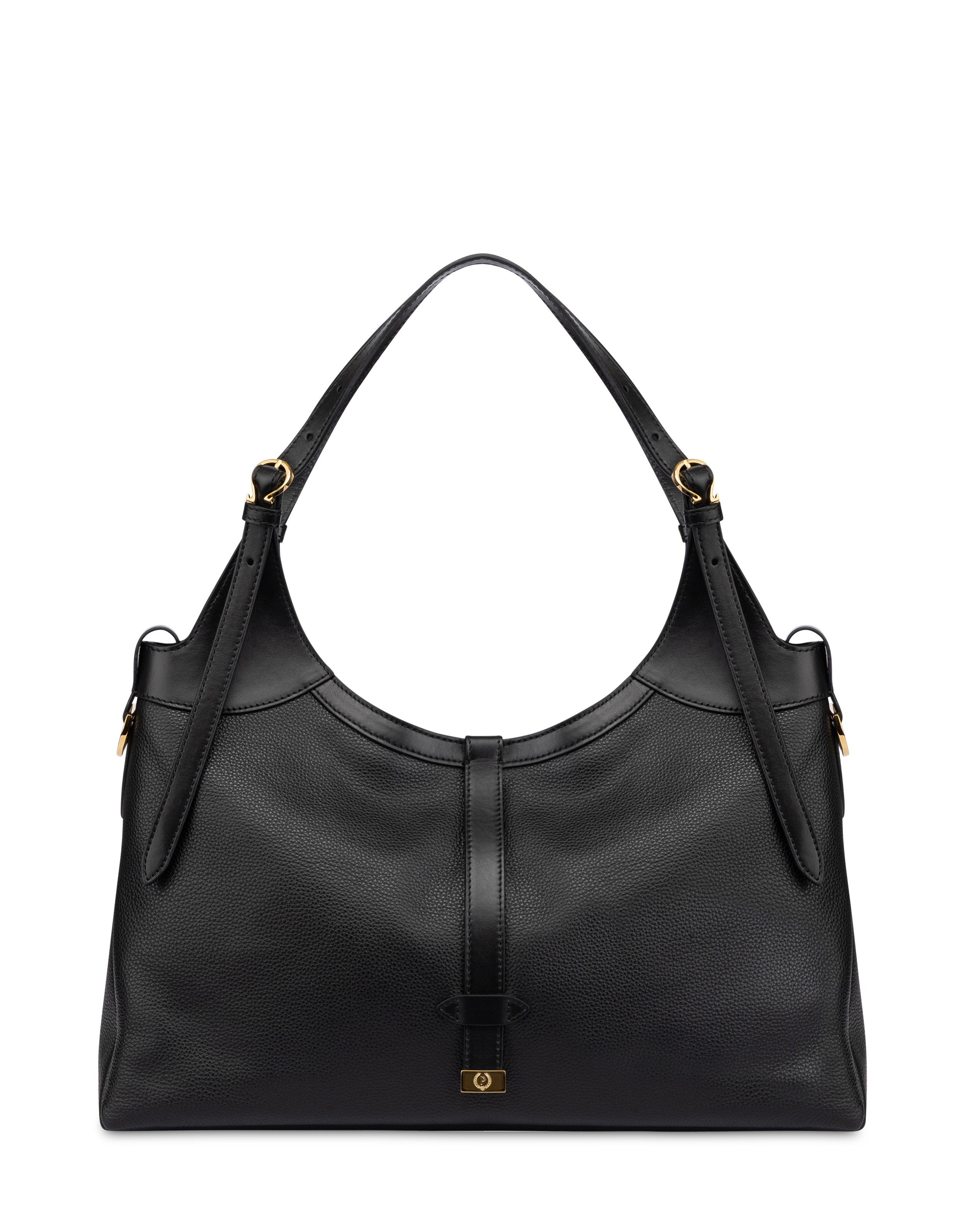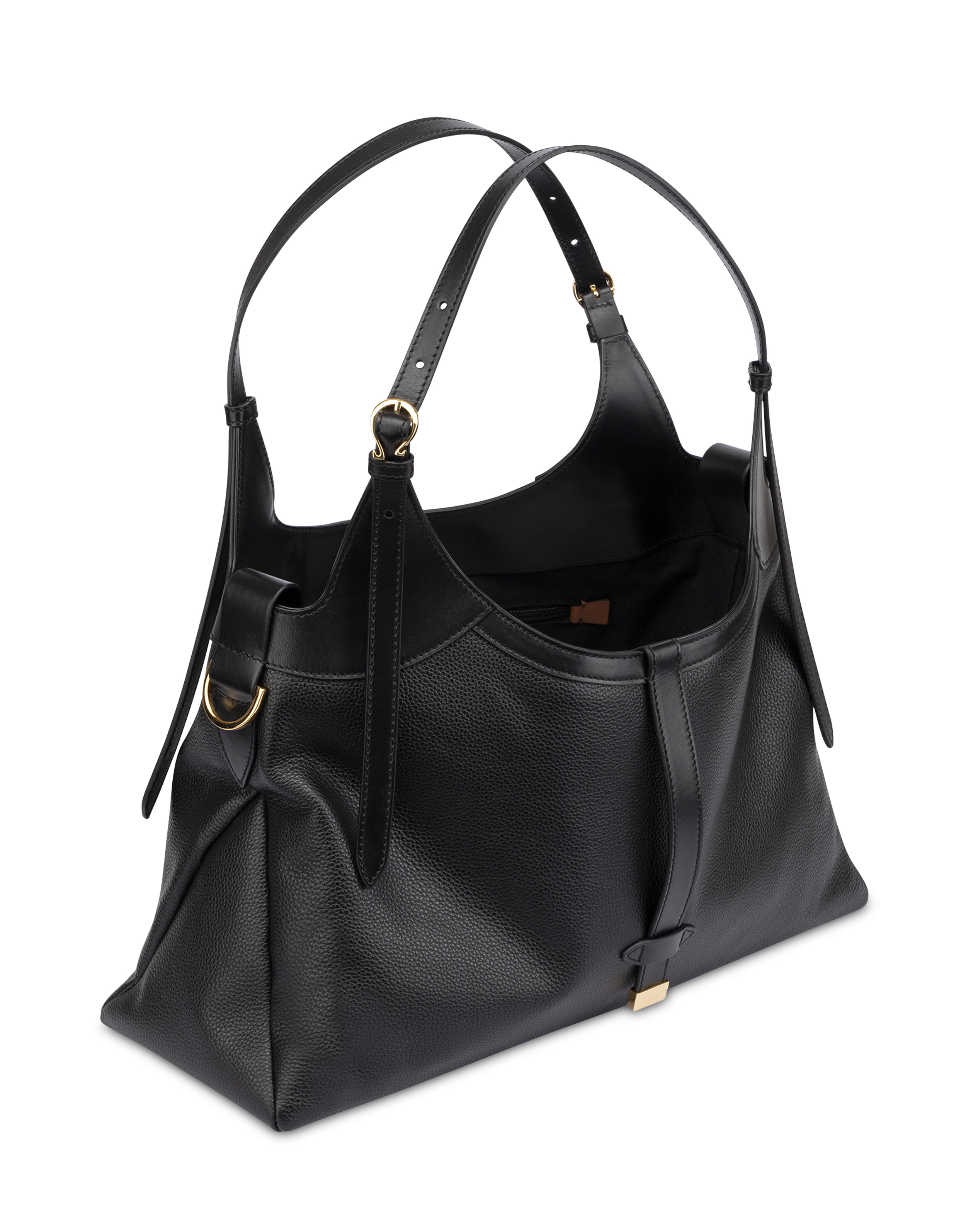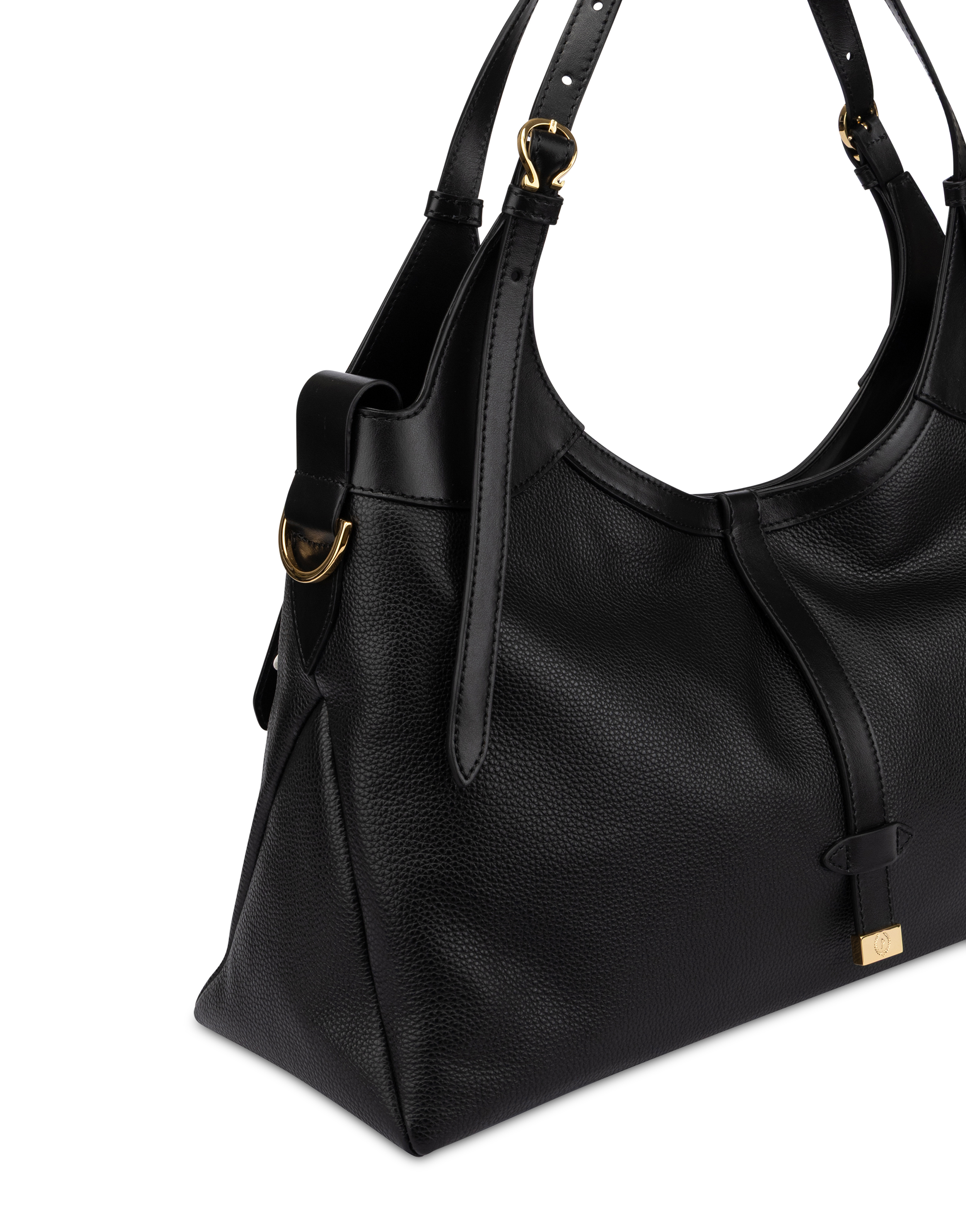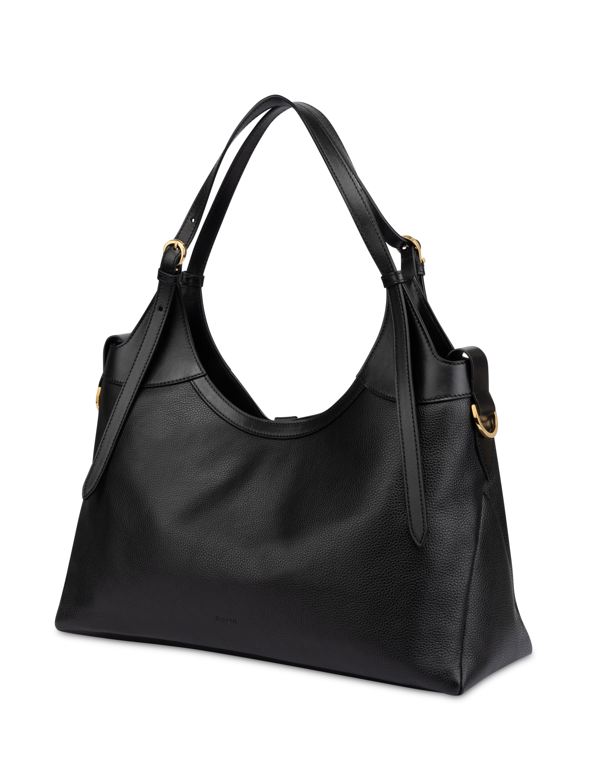 Spacious, structured, and naturally elegant. Made of grained calfskin with smooth leather inserts, this bag combines functionality and style with a double adjustable handle and magnetic closure. The lined interior features a zip pocket and a leather logo label. The metal tip with engraved 'P laurel' logo and gold plating add a sophisticated signature to a design created for everyday use.
