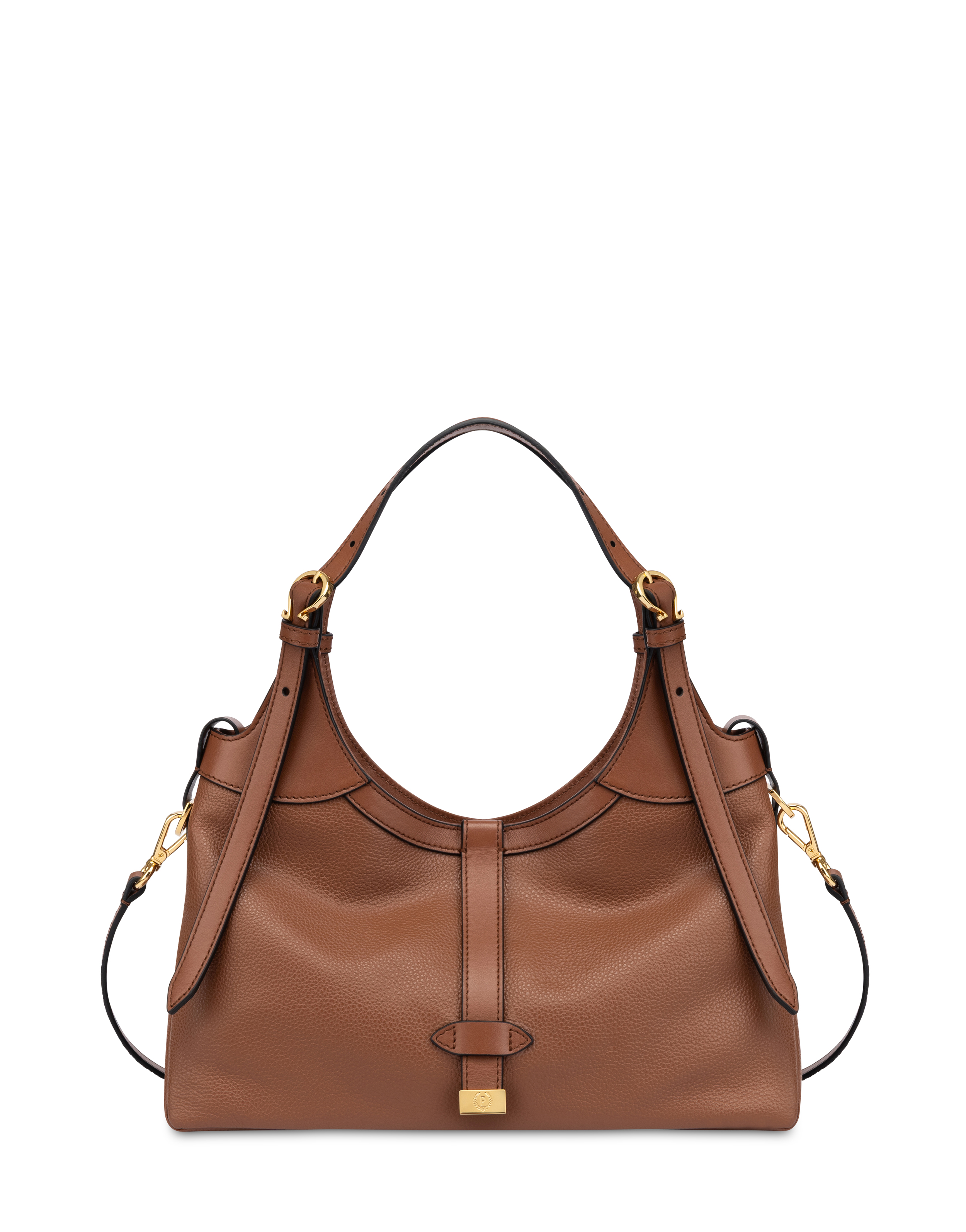 Compact in size, yet bold in style. The small version of the Mia Double Handle Bag is made of grained calfskin with smooth leather inserts and embellished with gold details. The adjustable double handle ensures versatile portability, while the lined interior features a zip pocket and a leather logo label. The metal tip with engraved 'P-Alloro' logo completes the design with an iconic and refined accent.