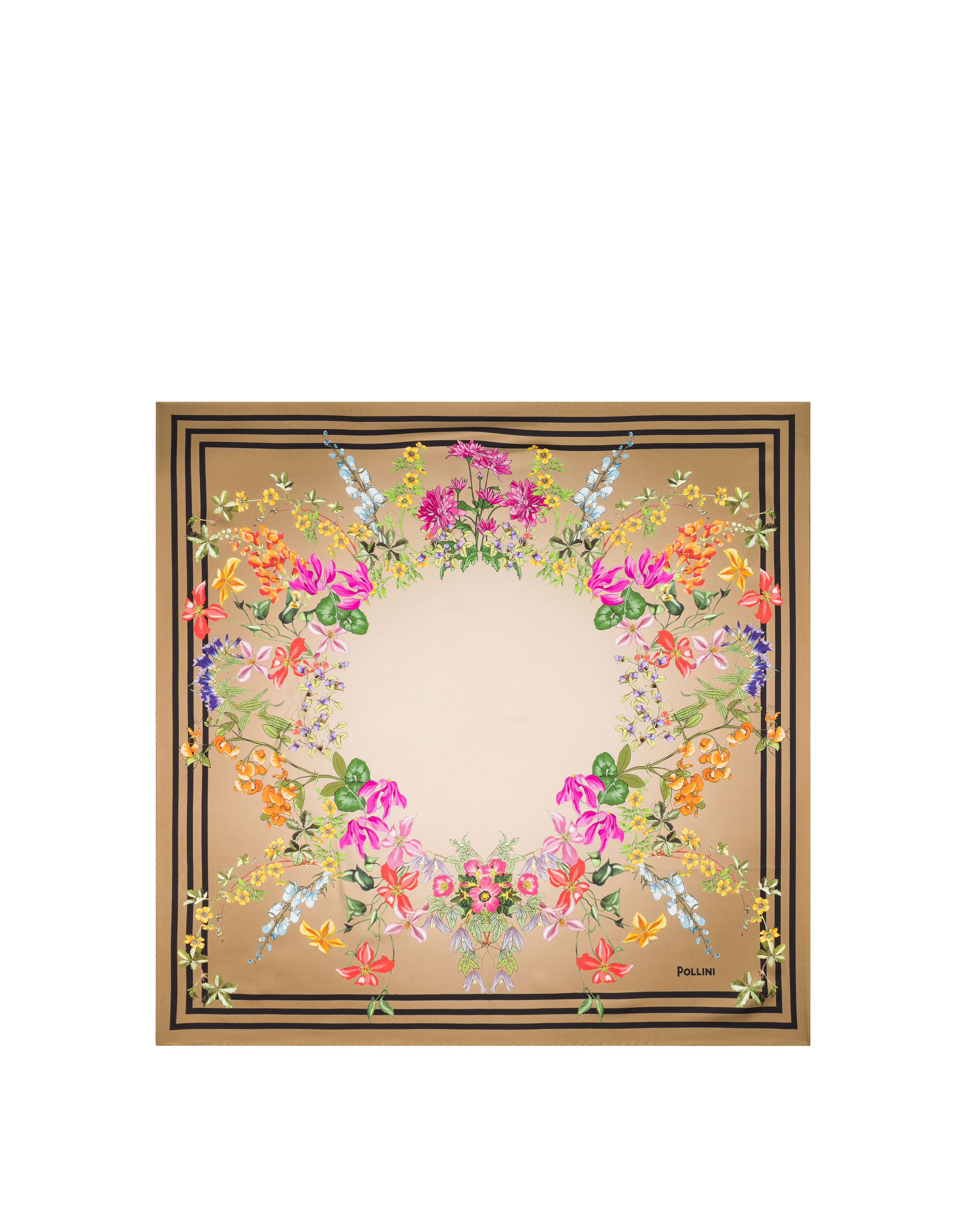 Silk twill scarf with circular floral print featuring a painted effect. The contrasting triple border creates a geometric detail.