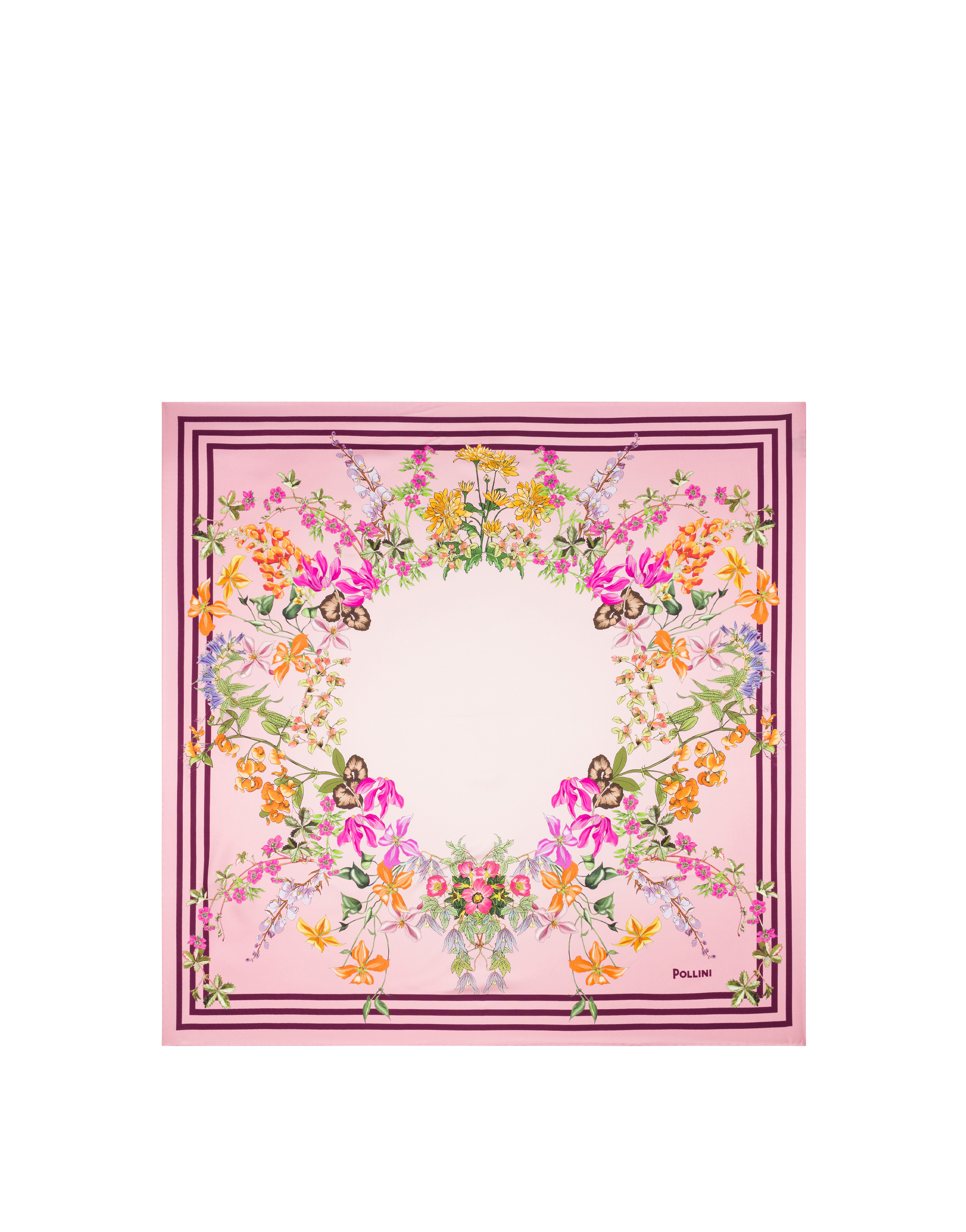 Silk twill scarf with circular floral print featuring a painted effect. The contrasting triple border creates a geometric detail.
