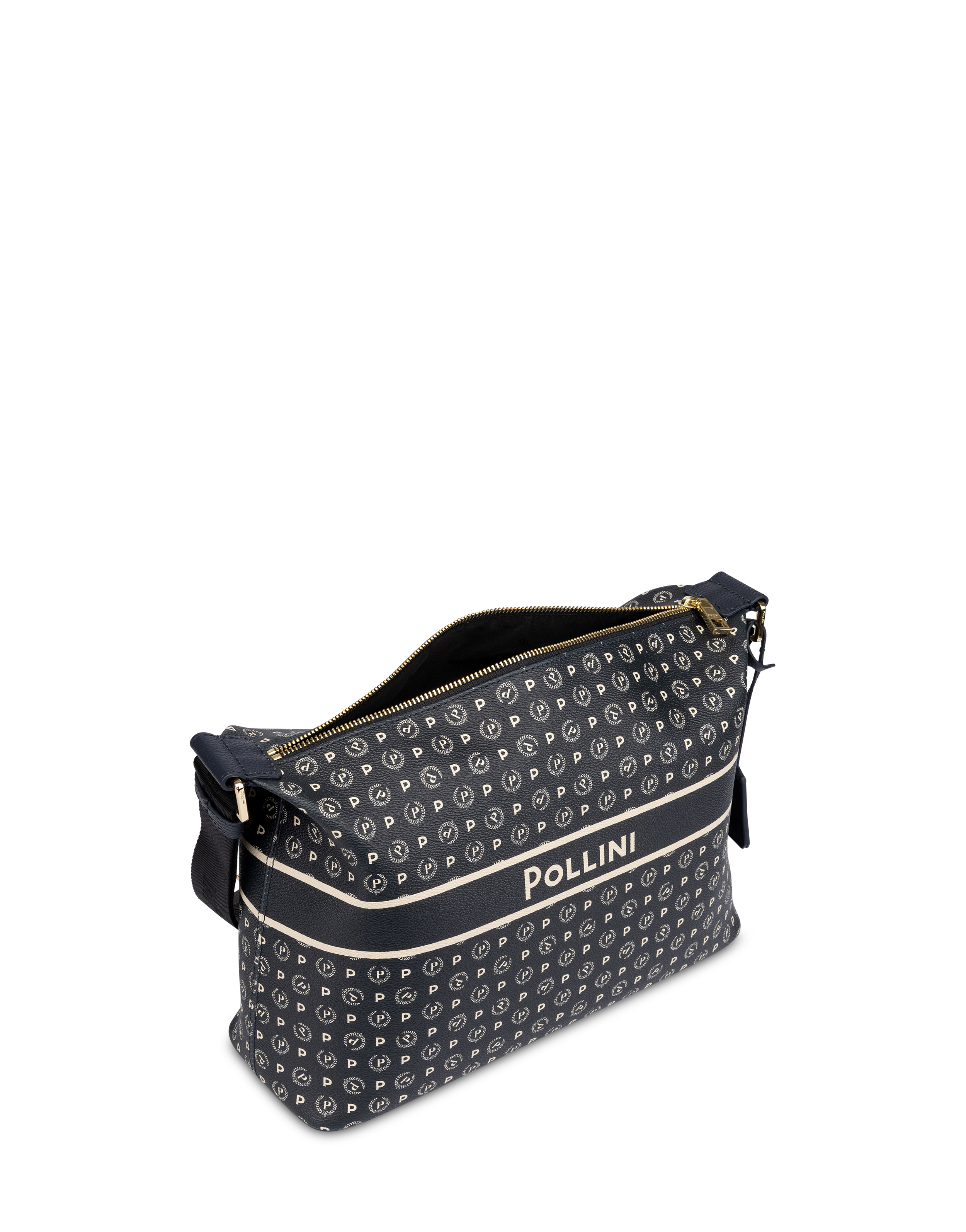 Borsa a spalla realizzata per l'esclusiva capsule collection Heritage Marina, ispirata alle atmosfere estive marine. L’Heritage Pvc assume un nuovo colore dato dalla combinazione dell’avorio con pattern blu mare. La borsa si caratterizza per il logo Pollini lettering posto sul quadrante frontale. Tracolla in nylon jacquard logato per doppia portabilità: a spalla e bandoliera.