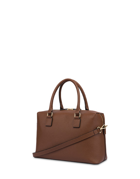 Double handle bag con targhetta logata smaltata e manico intrecciato. La doppia cucitura écru a filo grosso, posta sia sul quadrante frontale che sulla patta, sottolinea la qualità e l'attenzione ai dettagli tipici di Pollini.