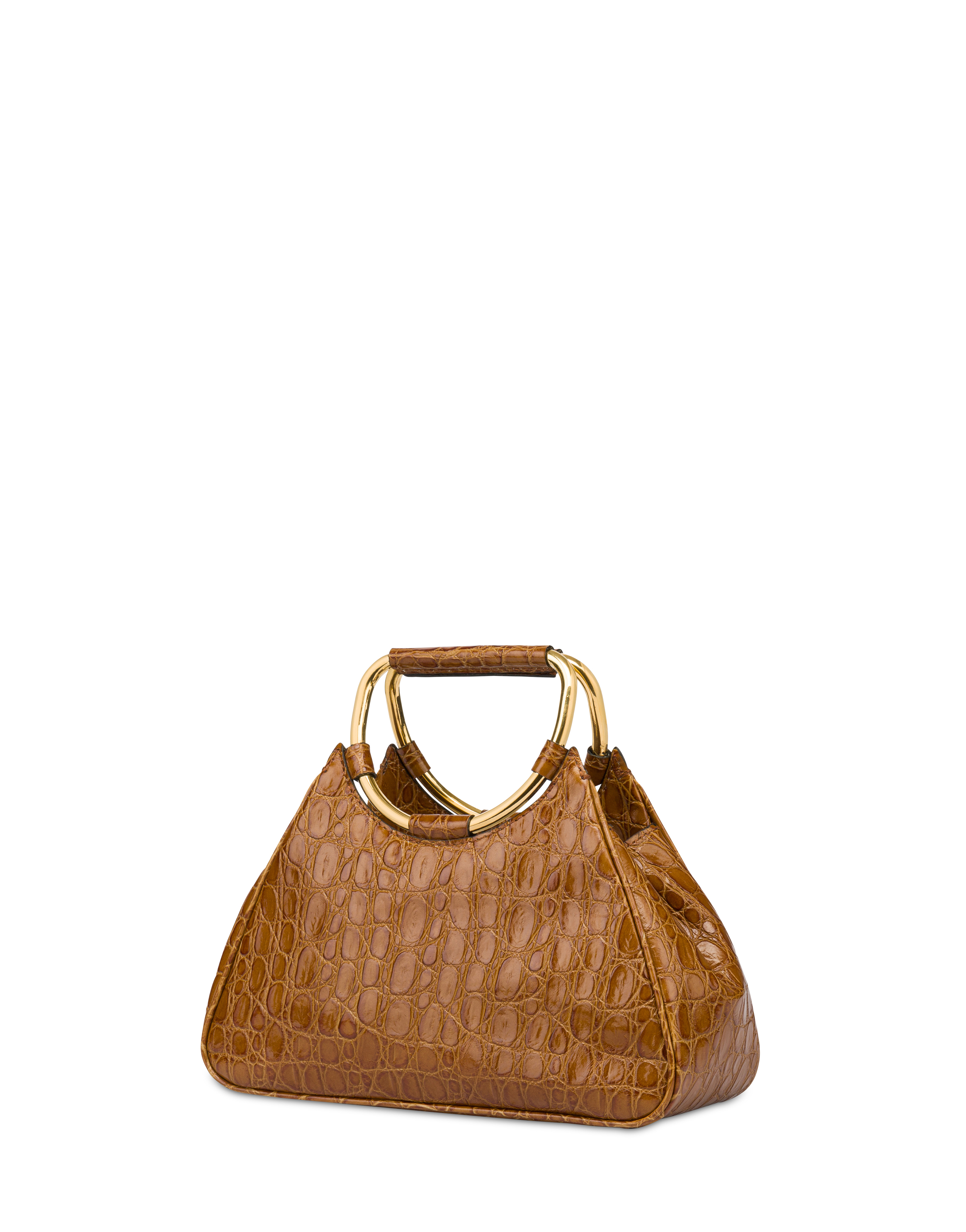 Clutch in vitello stampa cocco, dalle linee trapezoidali. Il doppio manico in metallo con impugnatura ricoperta in pelle evoca un'eleganza intramontabile reinterpretata in chiave contemporanea.