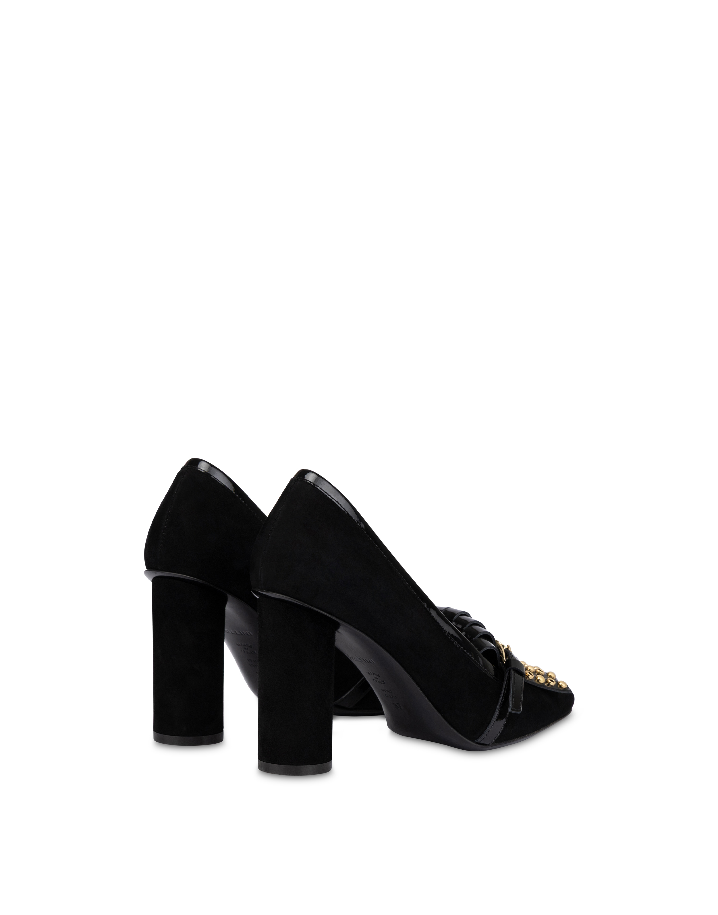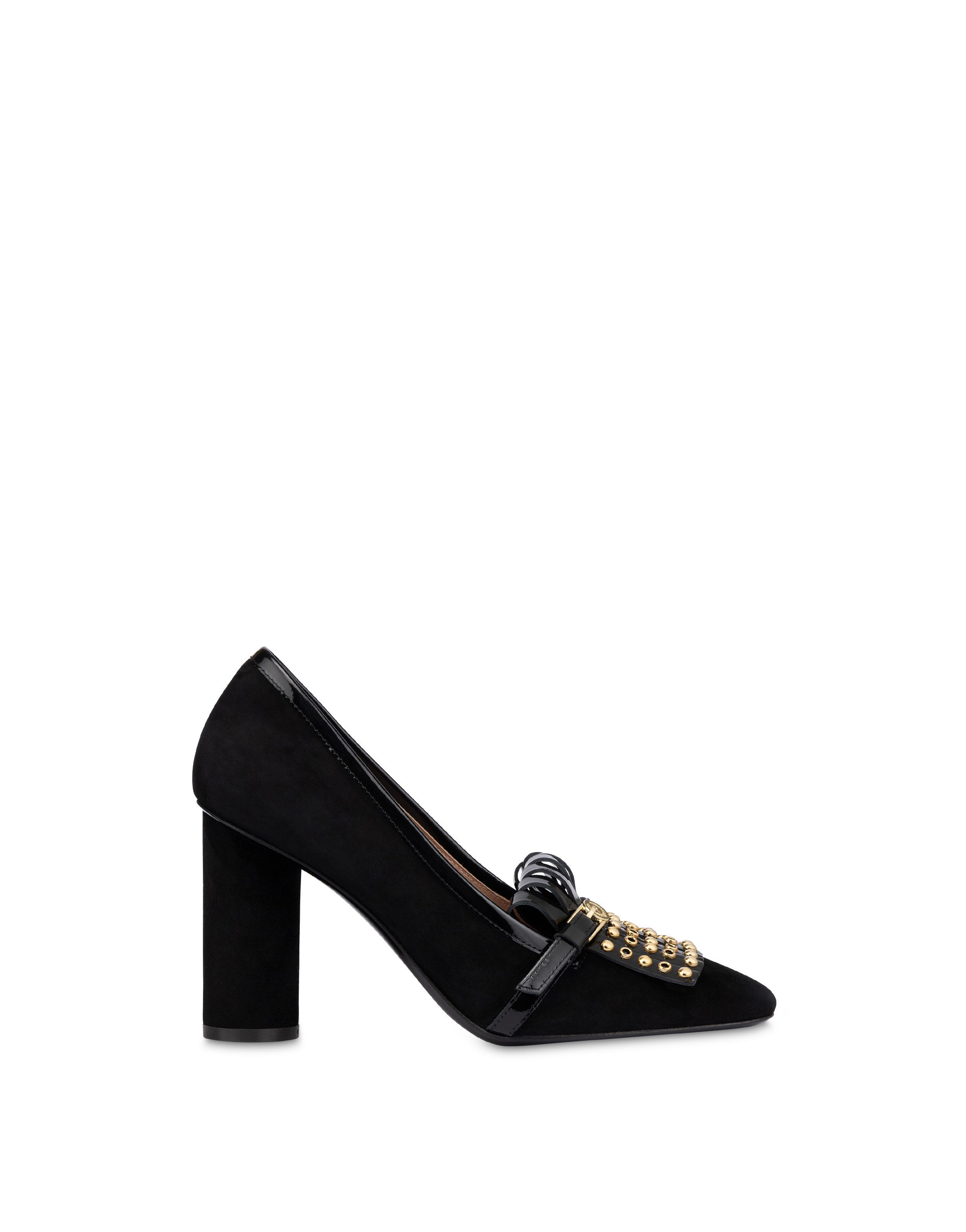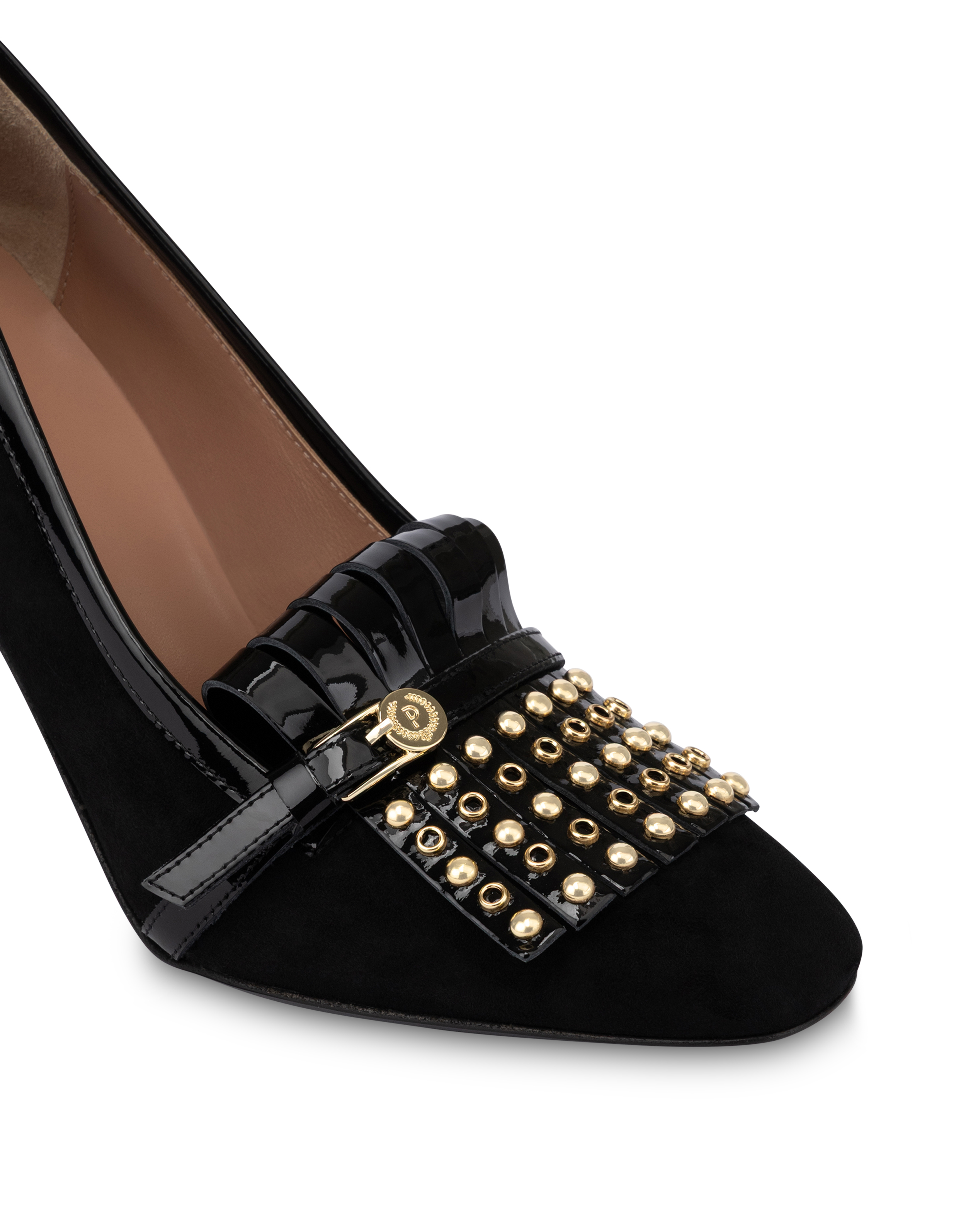 Un’interpretazione contemporanea di un’icona classica. La décolleté Dome gioca con i contrasti tra la morbidezza del camoscio e la lucentezza della vernice, valorizzata da una raffinata decorazione con frangia borchiata e una fibbia in metallo dal gusto rétro. La fodera in pelle assicura comfort e traspirabilità, mentre la suola in cuoio con isola in gomma garantisce una camminata stabile ed elegante.