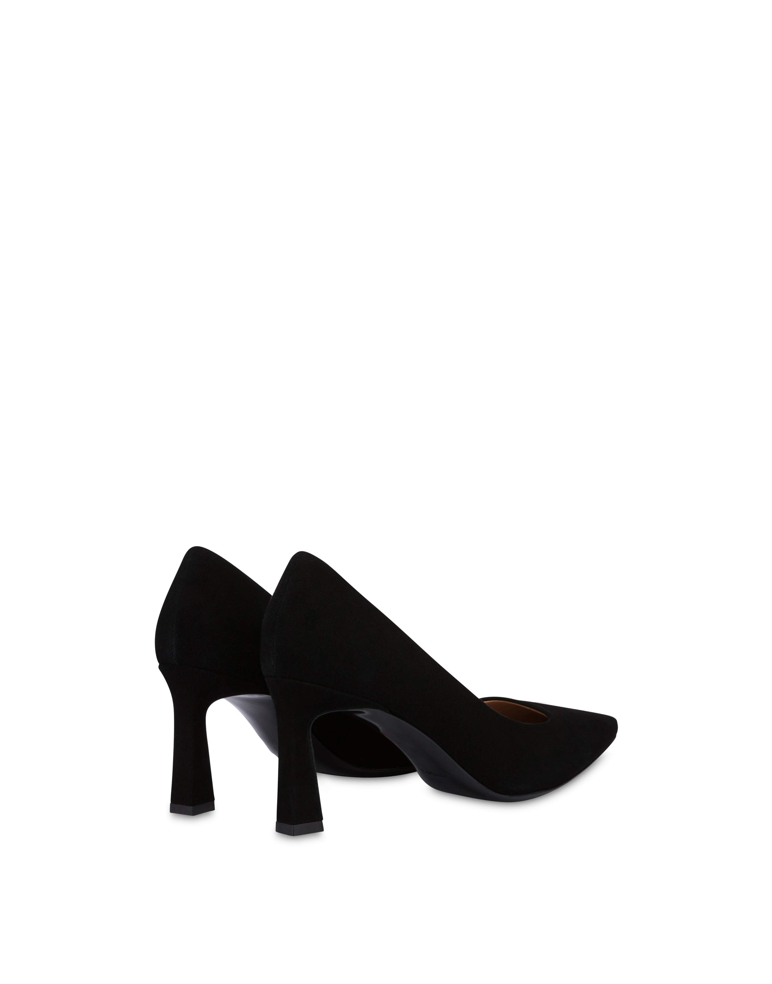 Pump in camoscio dalla silhouette moderna dal velato gusto retrò. Punta a scalpello ed elegante tacco a colonna dalle linee geometriche.