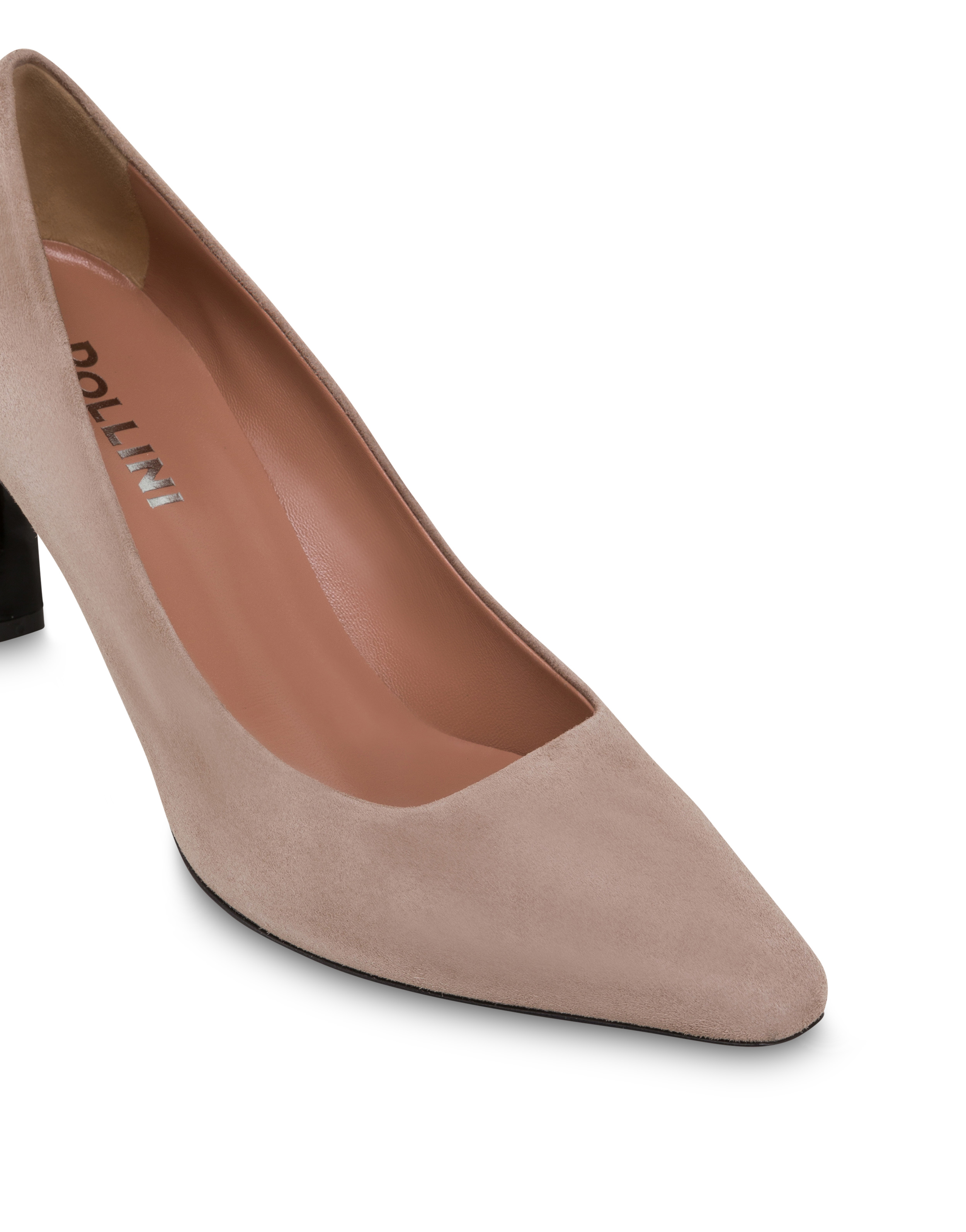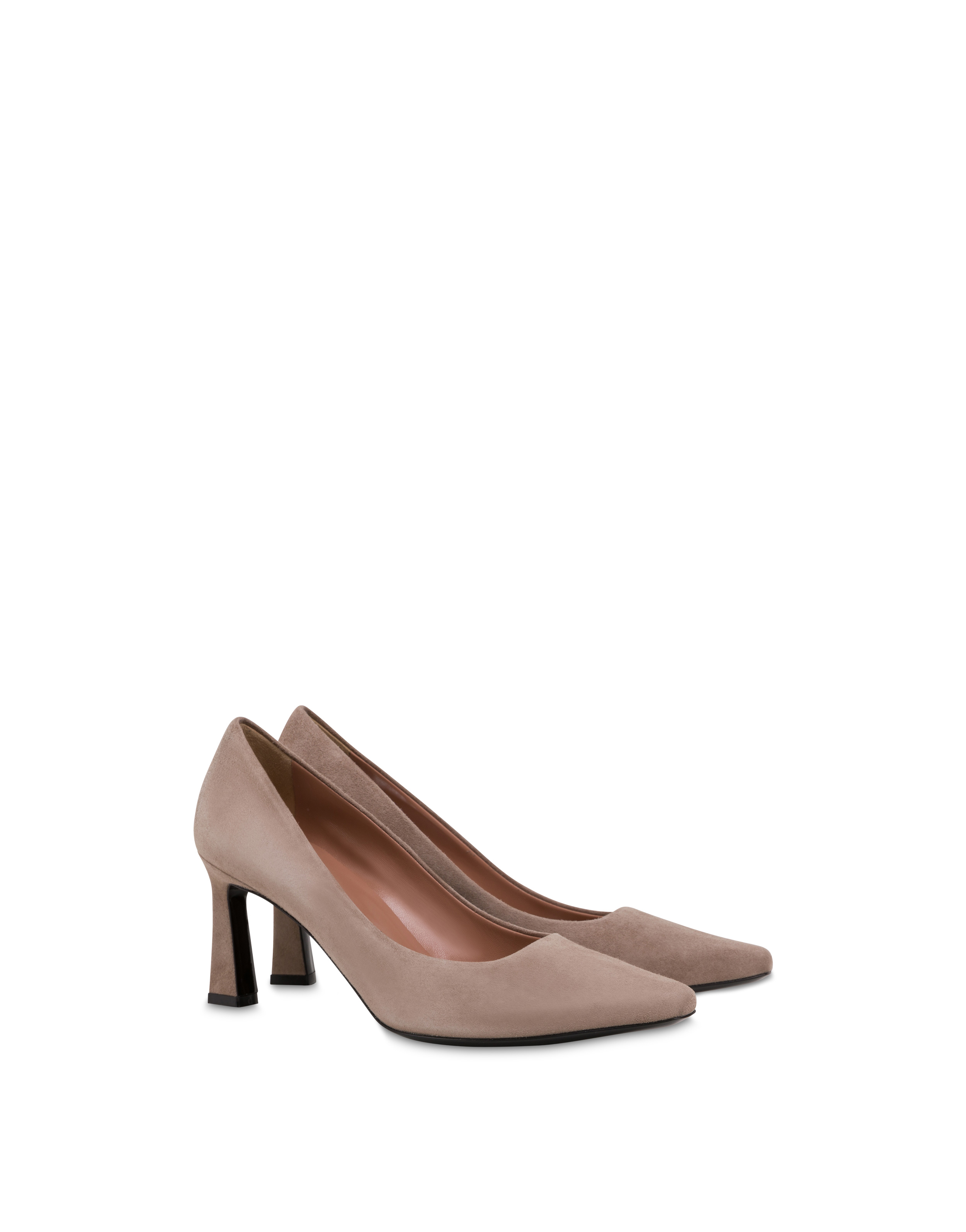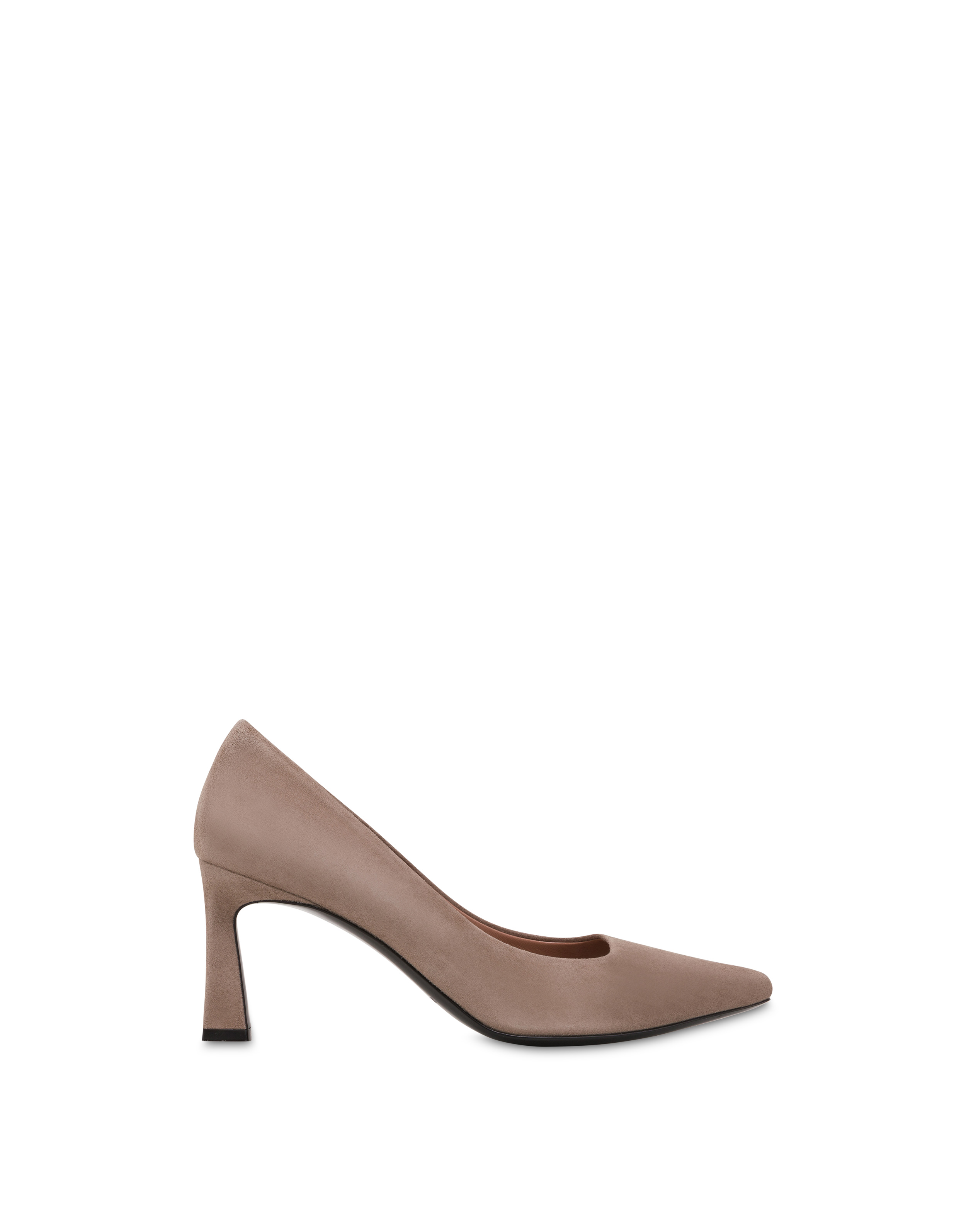 Pump in camoscio dalla silhouette moderna dal velato gusto retrò. Punta a scalpello ed elegante tacco a colonna dalle linee geometriche.