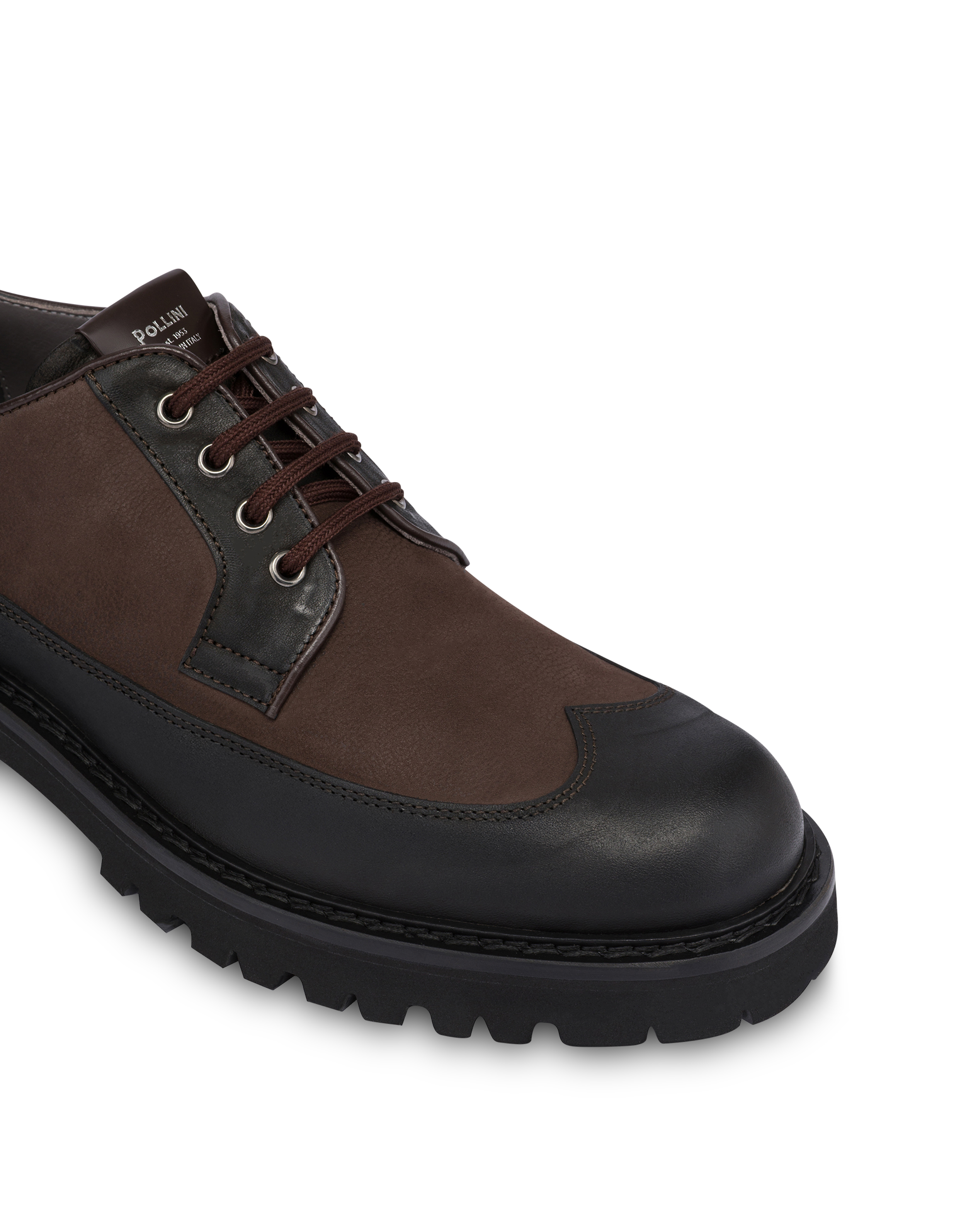 Derby realizzata in nabuk idro e vitello cerato, perfetta per ogni occasione formale e casual. Questo modello presenta un raffinato puntale a coda di rondine che aggiunge un tocco di classe ed eleganza. Il fondo carrarmato garantisce aderenza. Con un design che unisce comfort e stile queste scarpe sono l'alleato perfetto sia in ufficio che nel tempo libero.