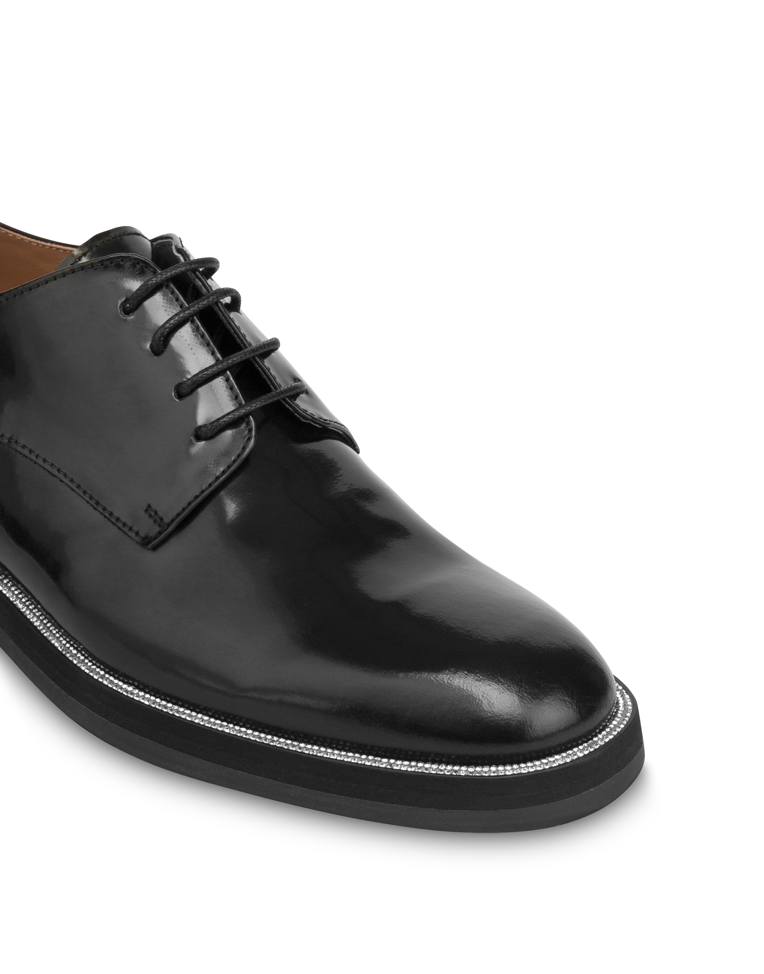 Stringata d'ispirazione maschile dal nuovo design, che reinterpreta lo stile mannish in chiave elegante. Lo spiccato gusto maschile Pollini si veste da sera e si illumina con una nuova suola, con guardolo ricoperto di strass.