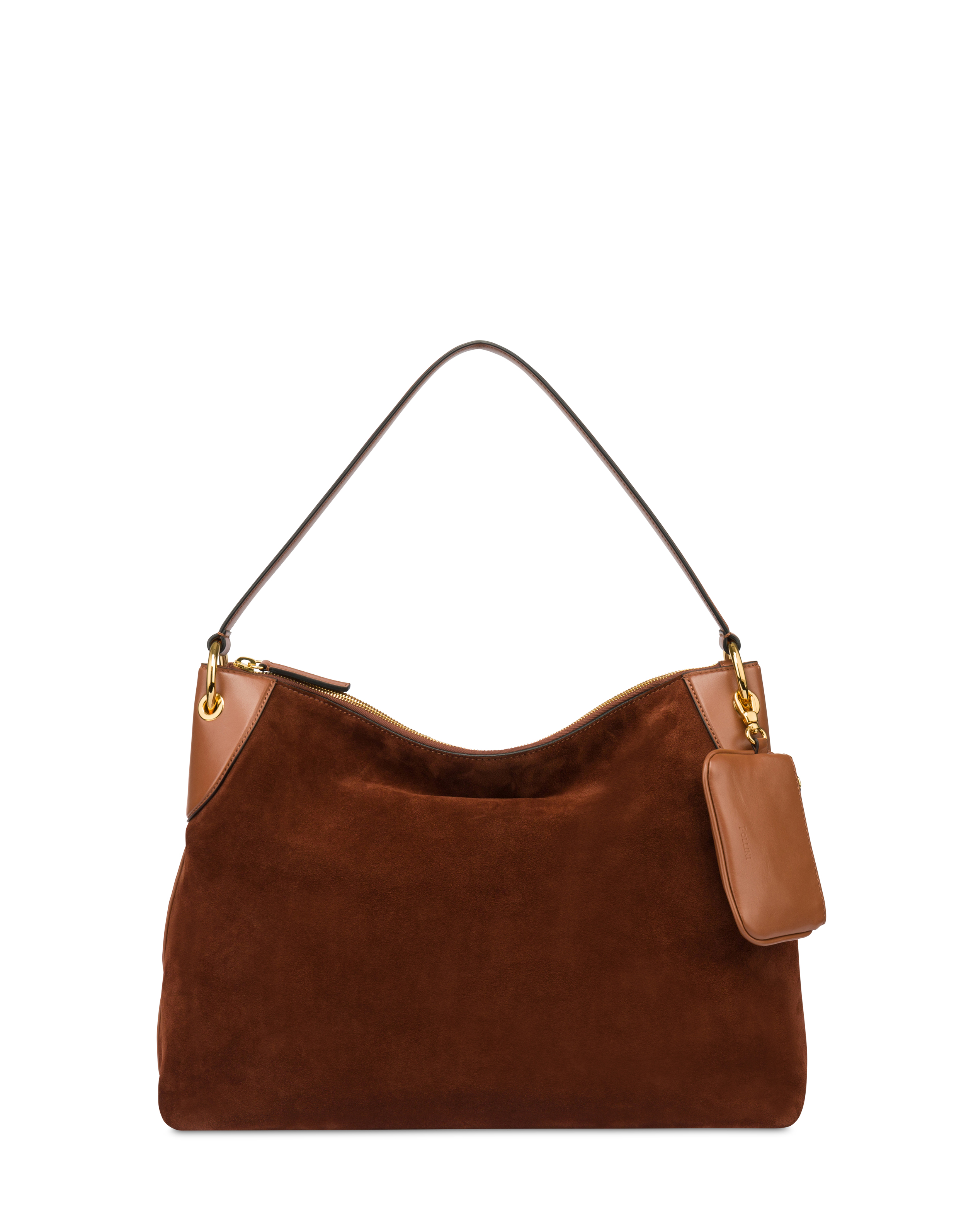 Borsa hobo in crosta con dettagli in vitello liscio. Manico impreziosito con grandi anelli moschettone. Riporti con forma a goccia a effetto bombato. Definisce il look una mini pouch amovibile.