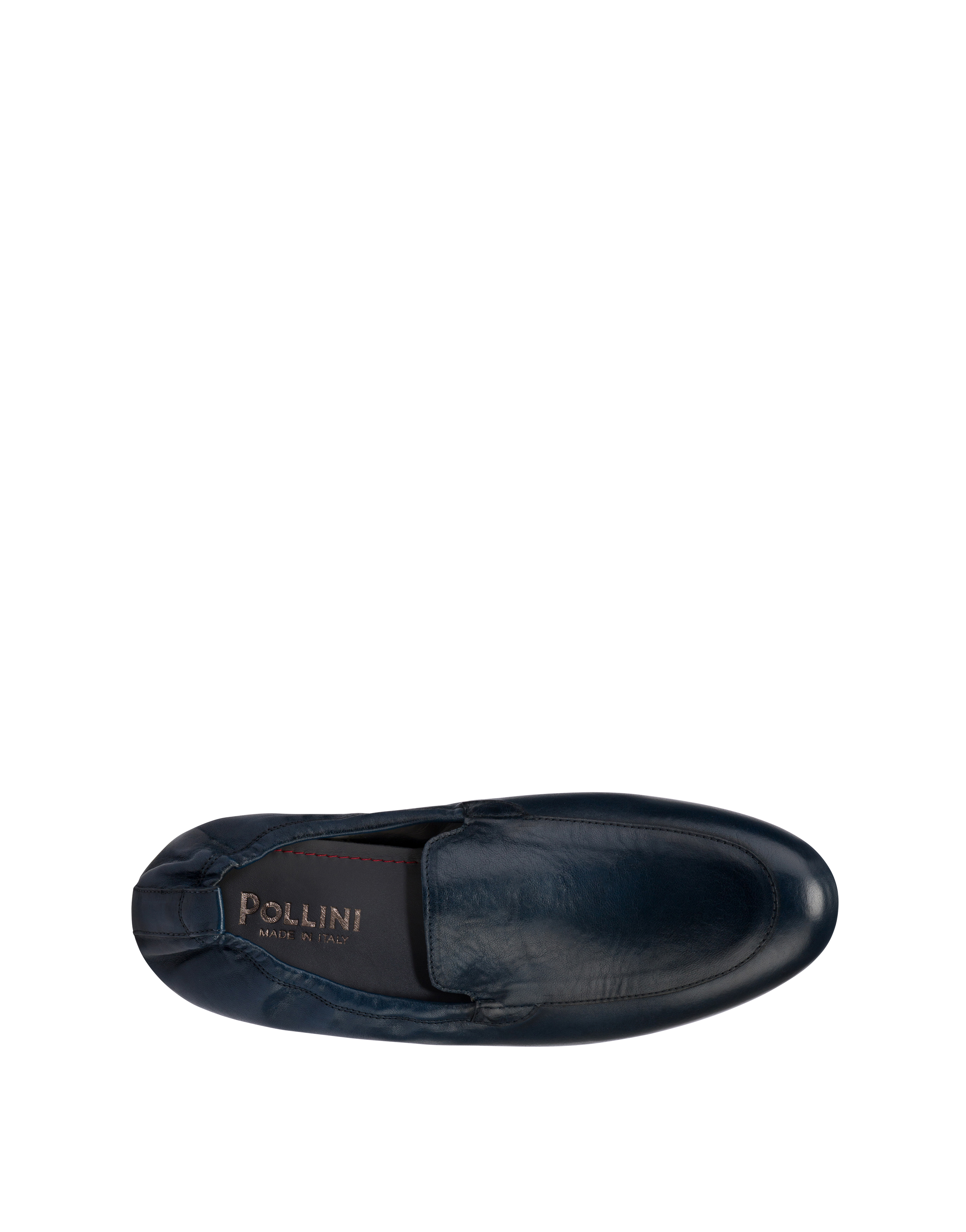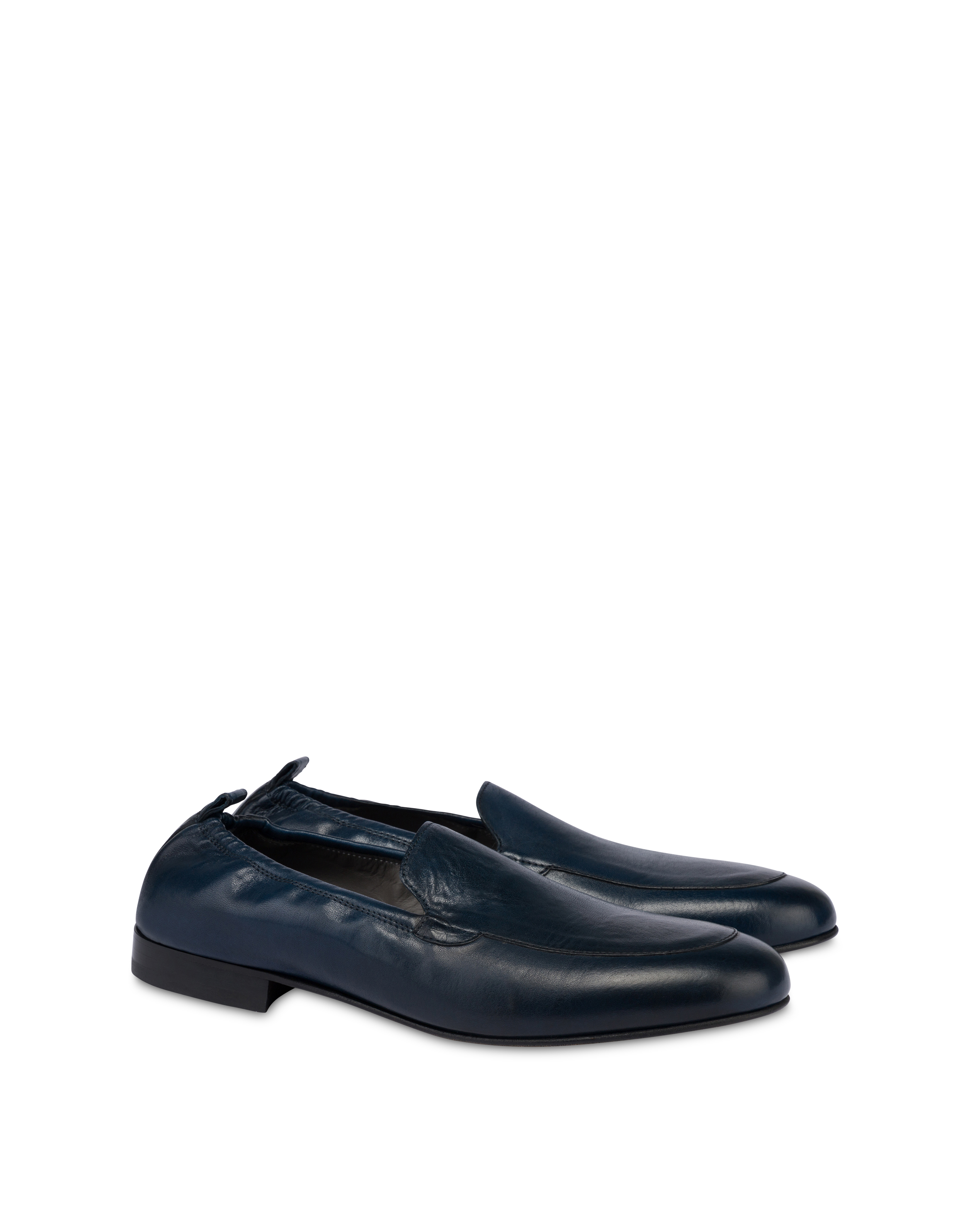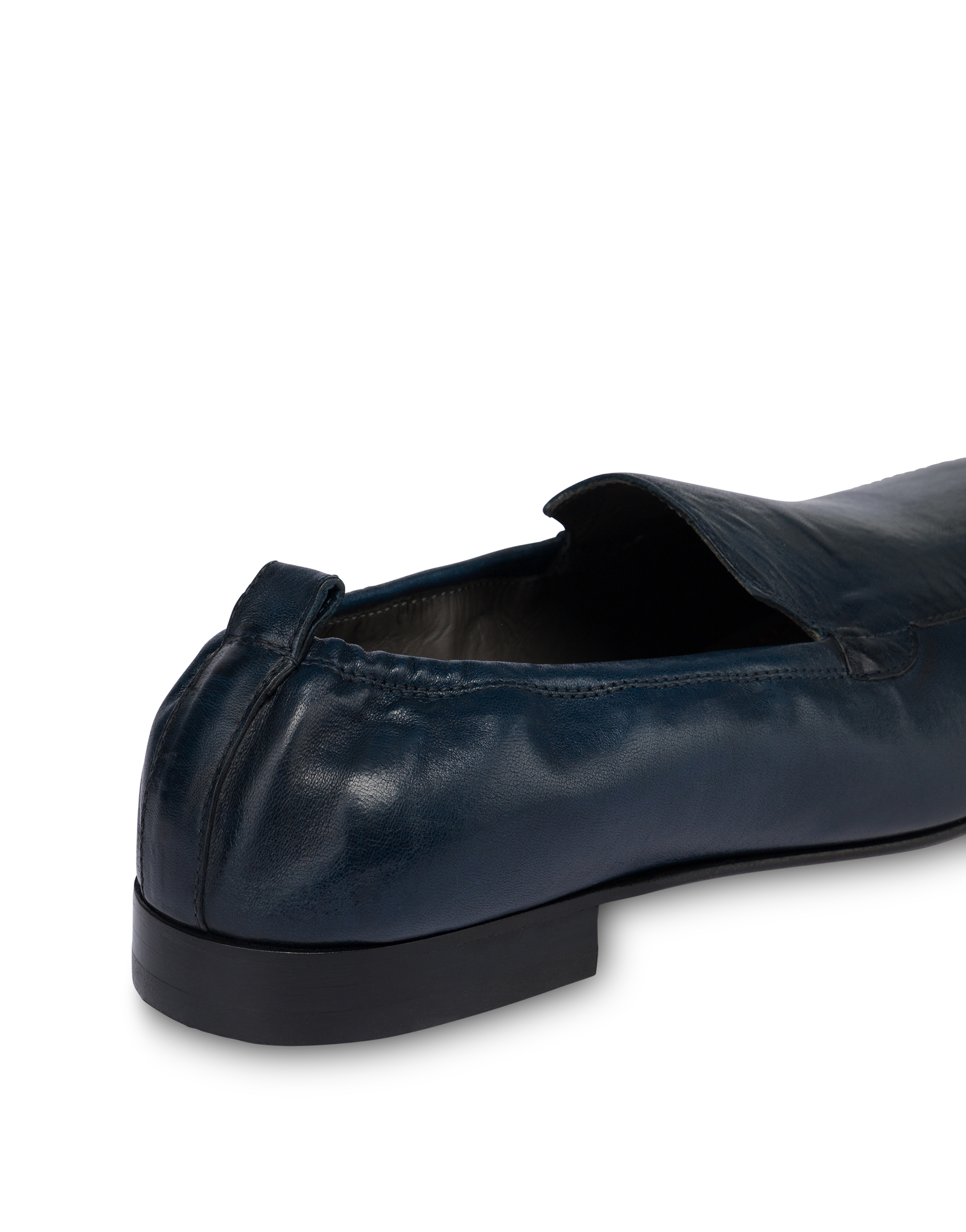 Mocassino in morbida capra, dalla tradizionale costruzione 'a sacchetto', caratterizzato da una arricciatura sul tallone data dall'inserimento di un elastico ricoperto. Fondo in cuoio flessibile, per un comfort estremo.