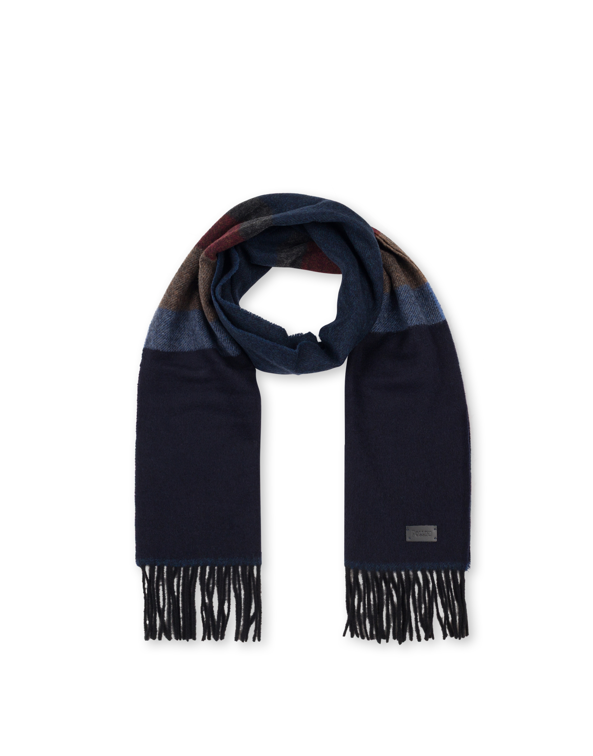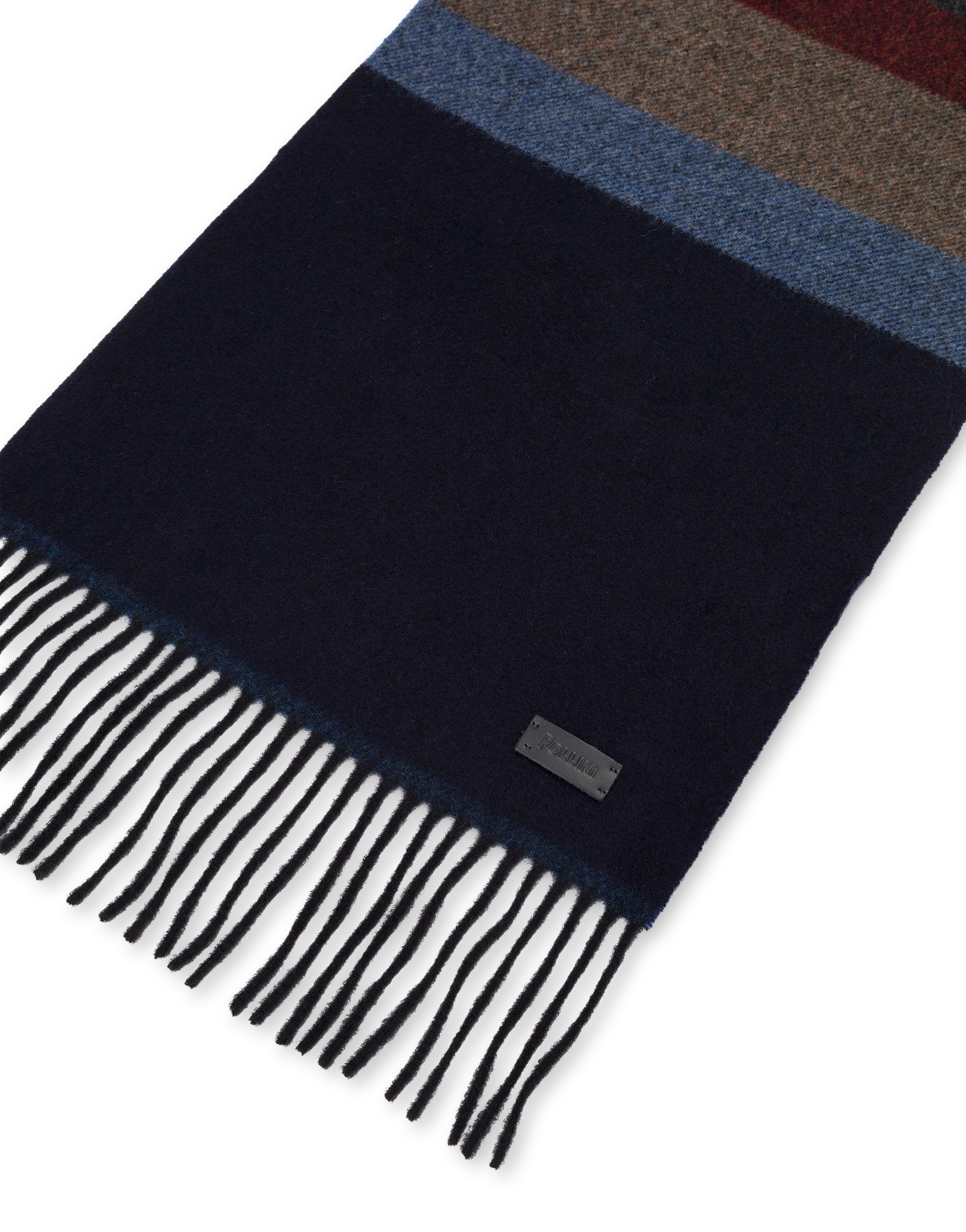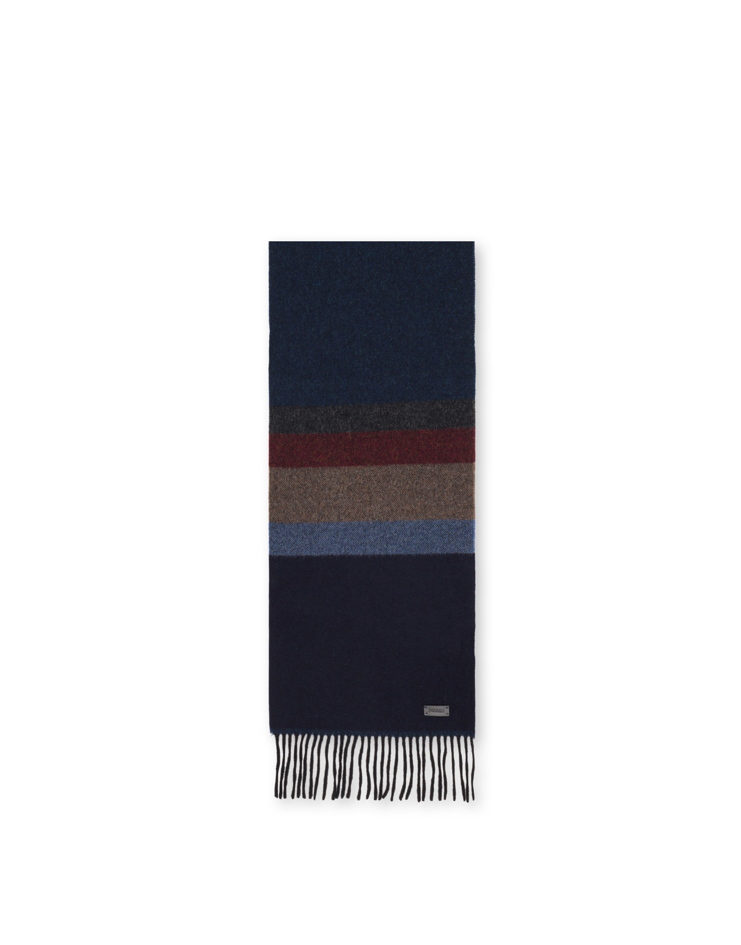 Sciarpa unisex in lana con righe a contrasto. Bordi sfrangiati. Etichetta logata in pelle sul bordo.