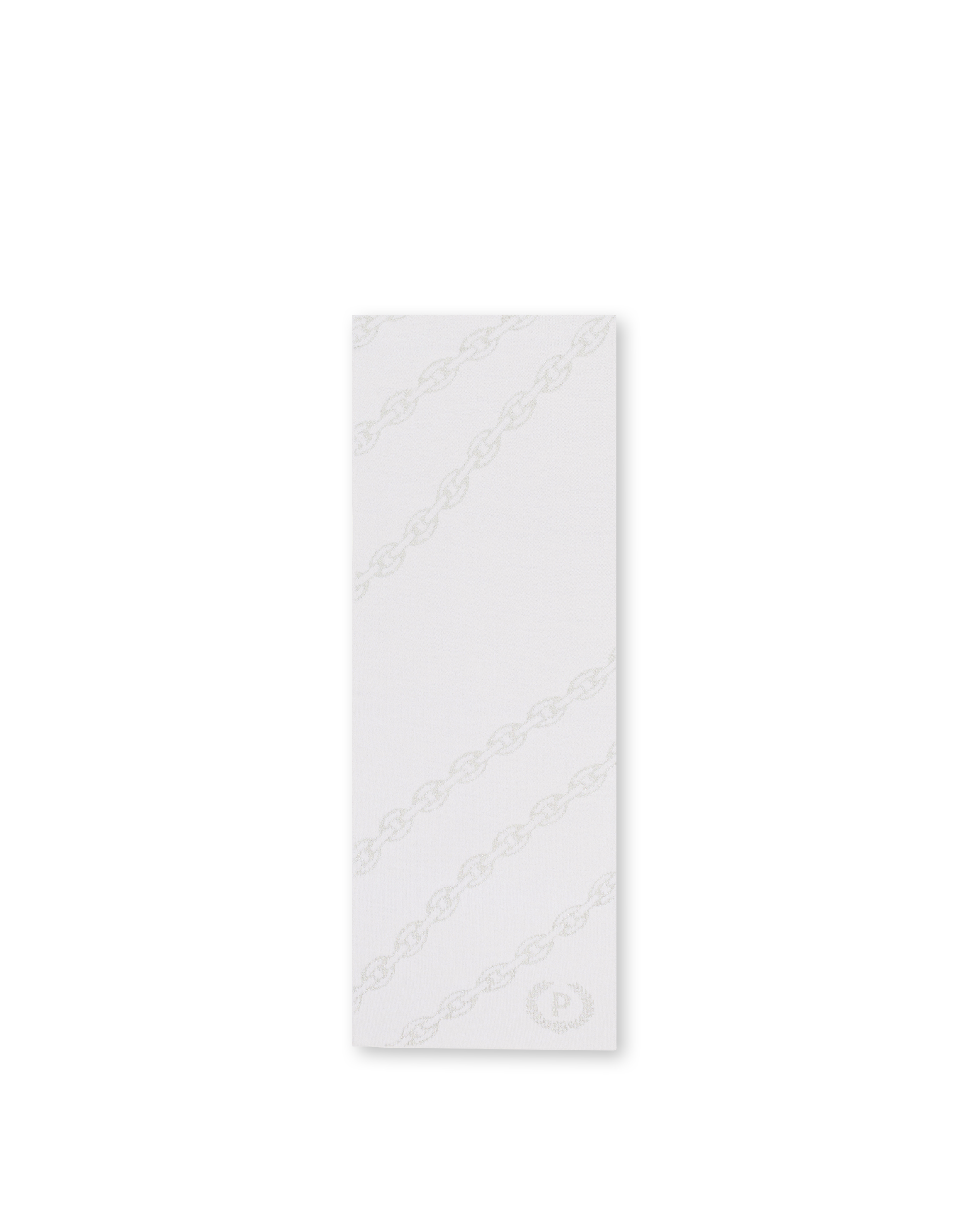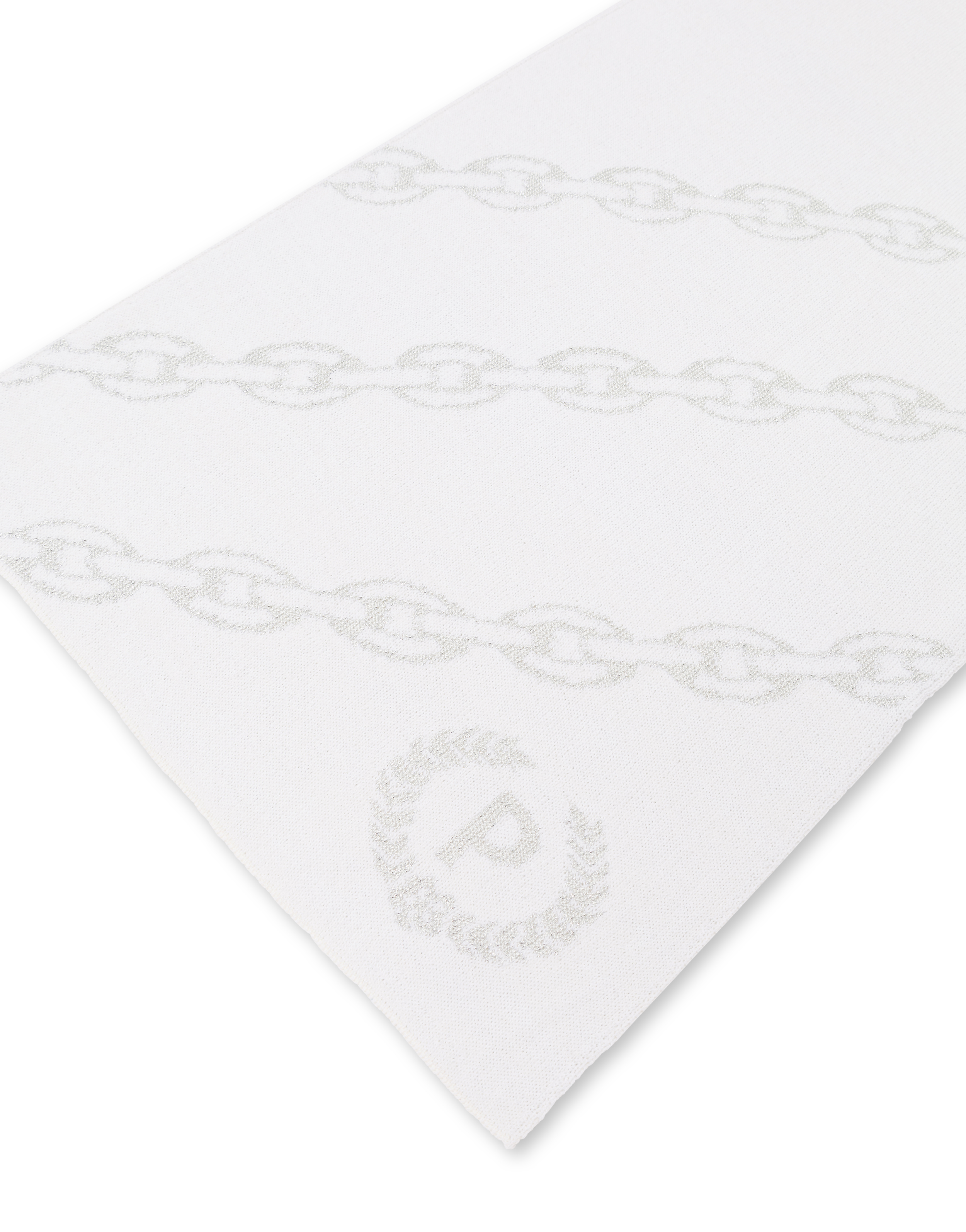Sciarpa in misto lana con stampa catene che richiama la metalleria della pelletteria Pollini. Il macro logo sul bordo personalizza la stampa.