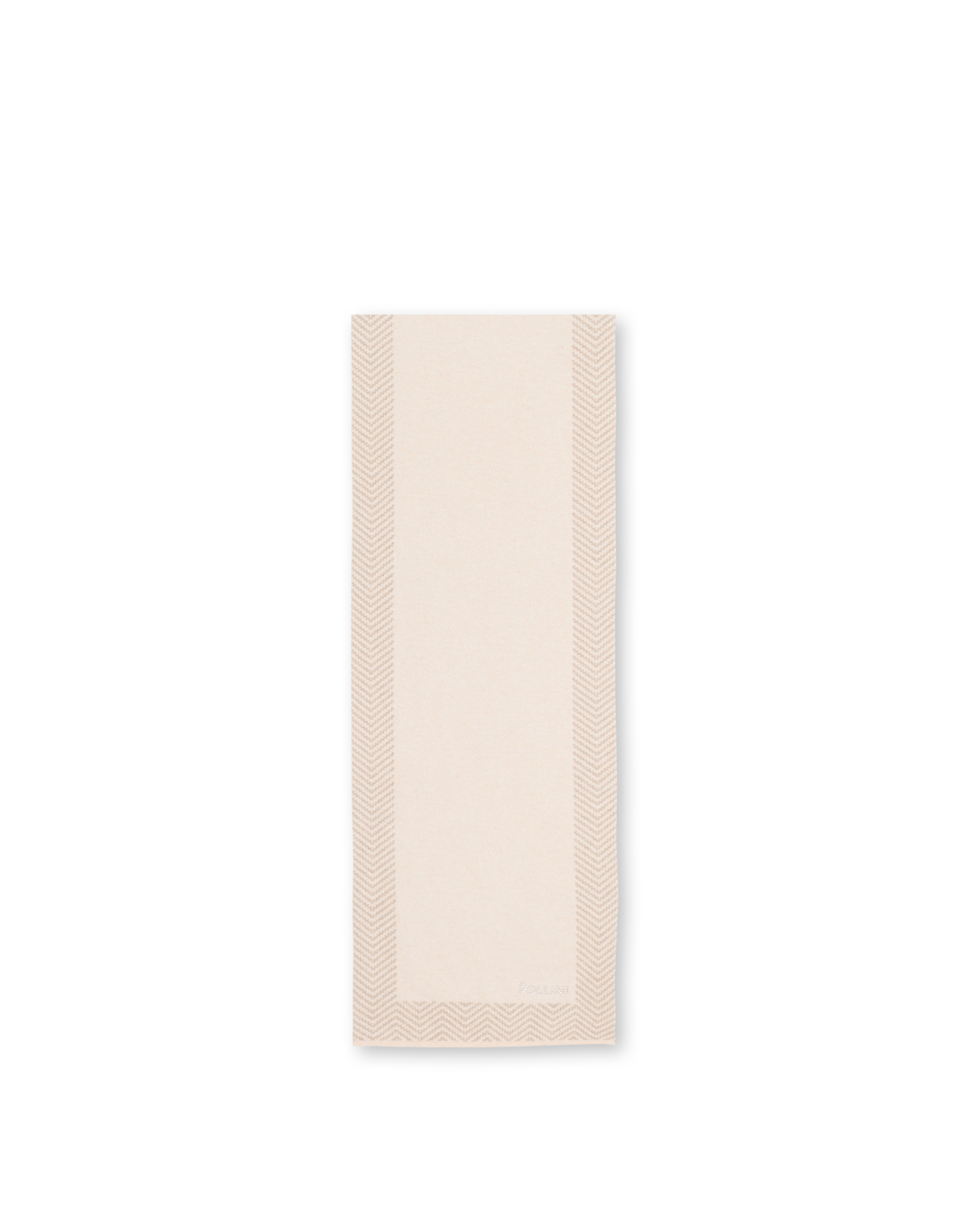 Sciarpa in misto lana tinta unita con bordi stampa chevron a contrasto. La stampa richiama i dettagli iconici della pelletteria Pollini. Il logo lettering formato da brillantini personalizza la stampa.
