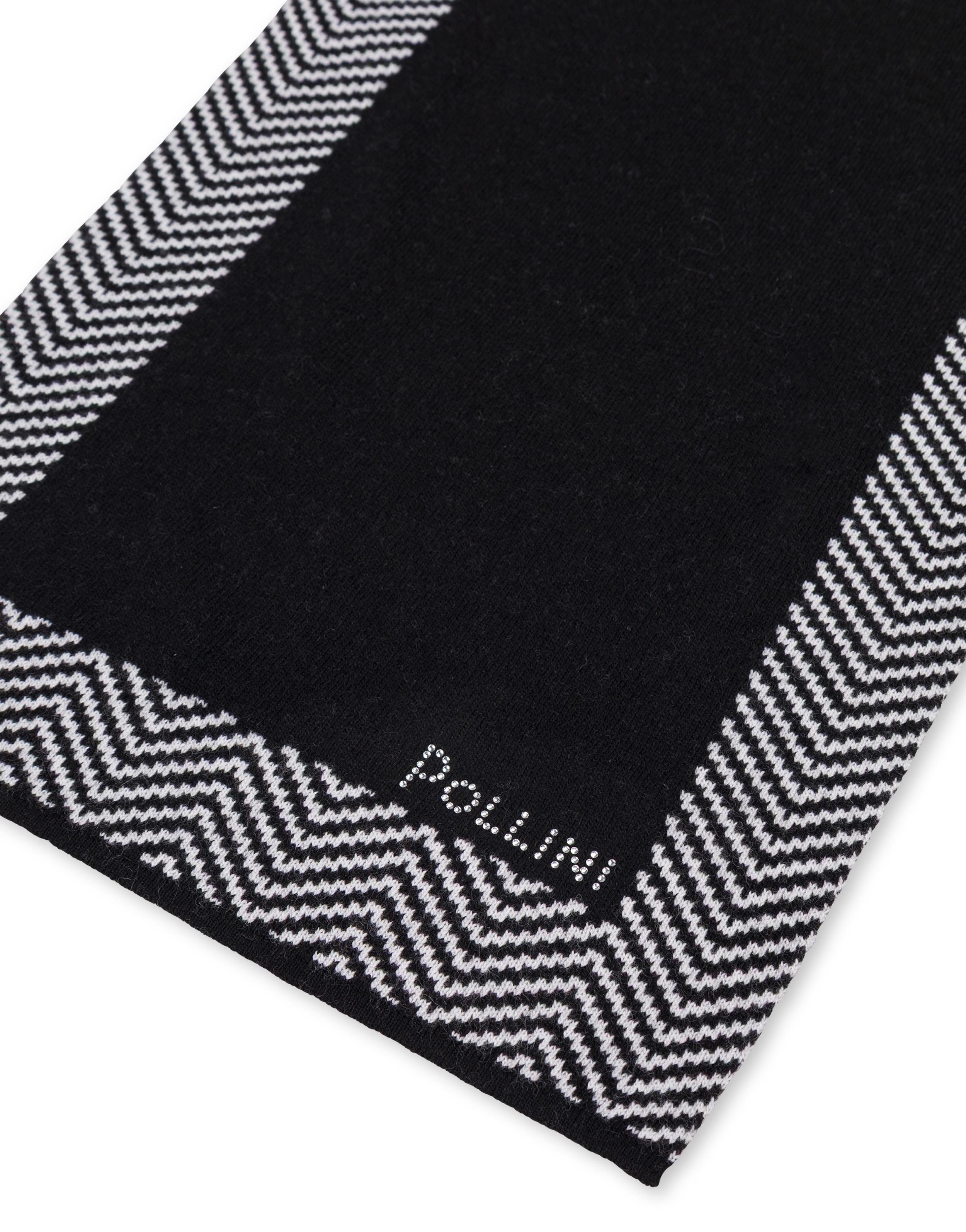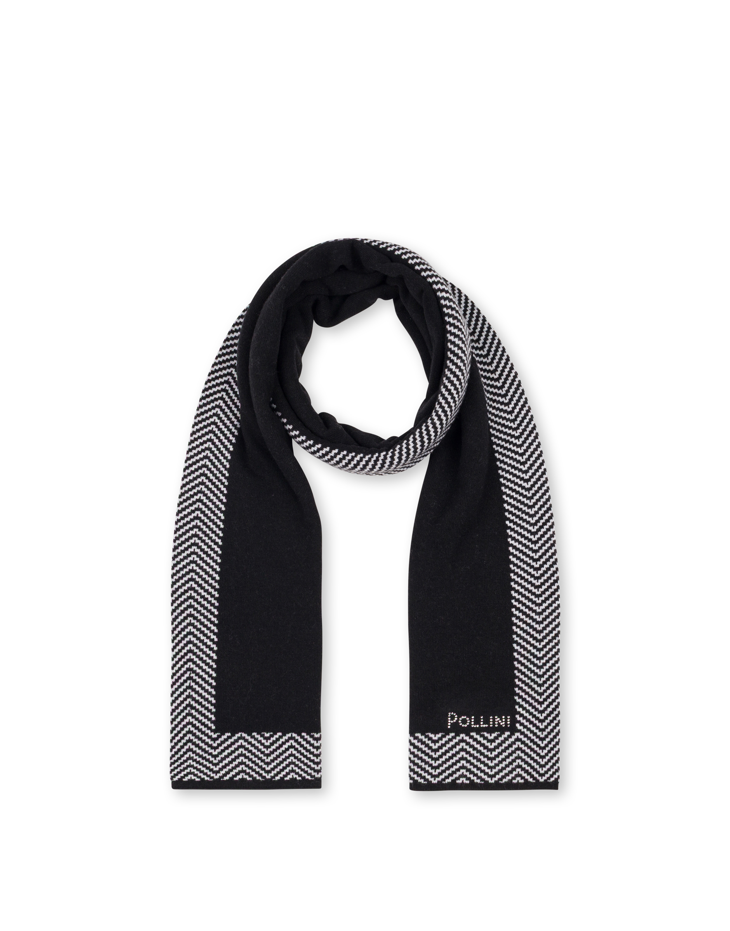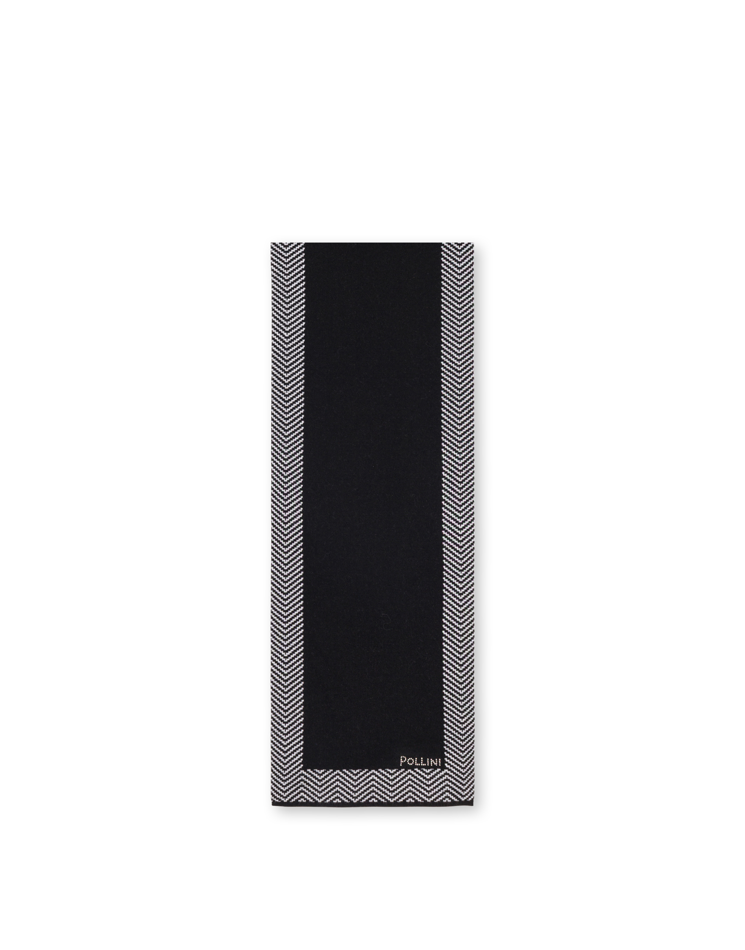 Sciarpa in misto lana tinta unita con bordi stampa chevron a contrasto. La stampa richiama i dettagli iconici della pelletteria Pollini. Il logo lettering formato da brillantini personalizza la stampa.