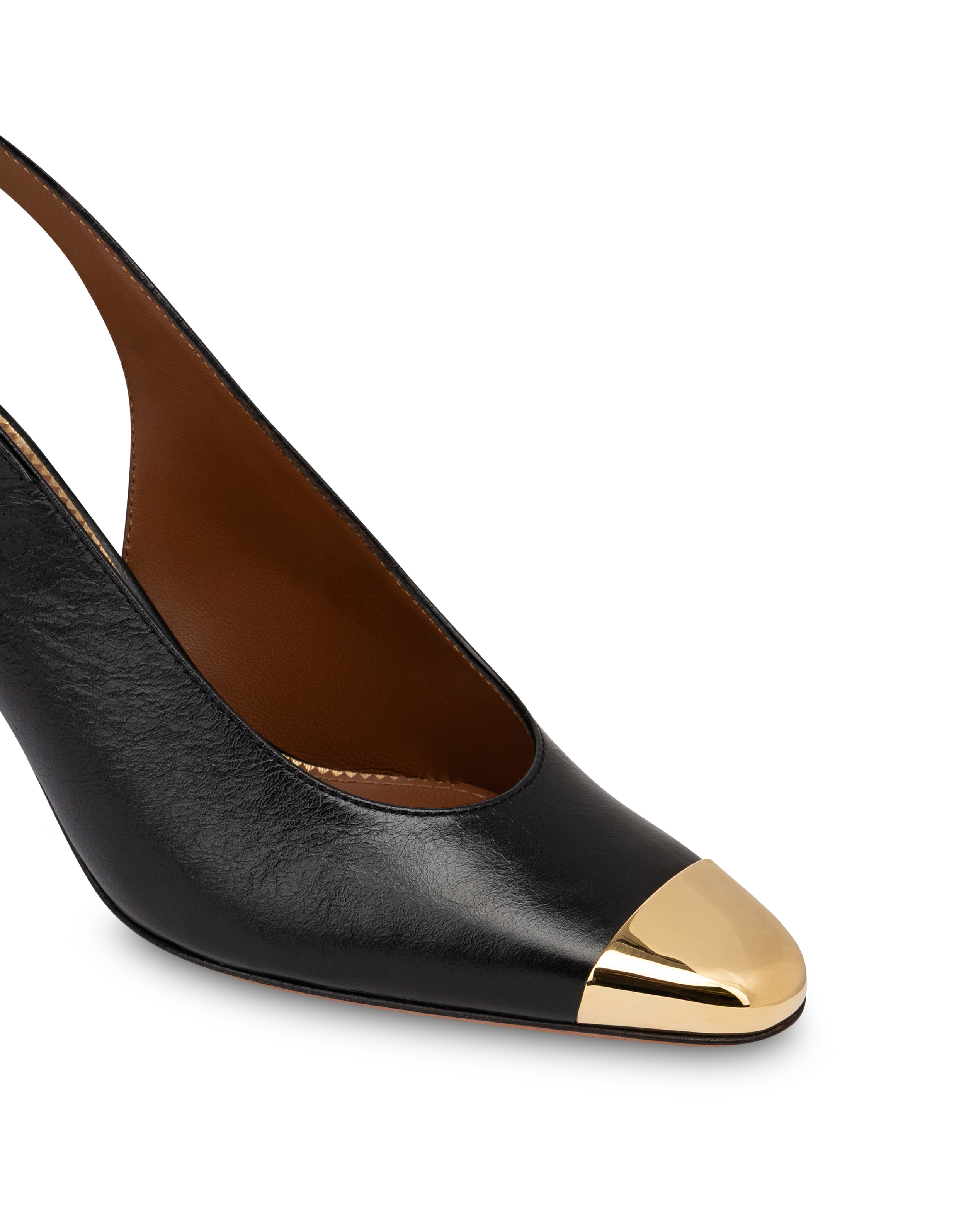 Linee essenziali e dettagli d’archivio definiscono la Sling Back Muse in morbida nappa. La punta affusolata e lo scollo a uovo valorizzano la silhouette del piede, mentre il puntale in metallo dona un accento grafico contemporaneo. Completano il design la fodera in pelle e la suola in cuoio, per una calzata raffinata e confortevole.