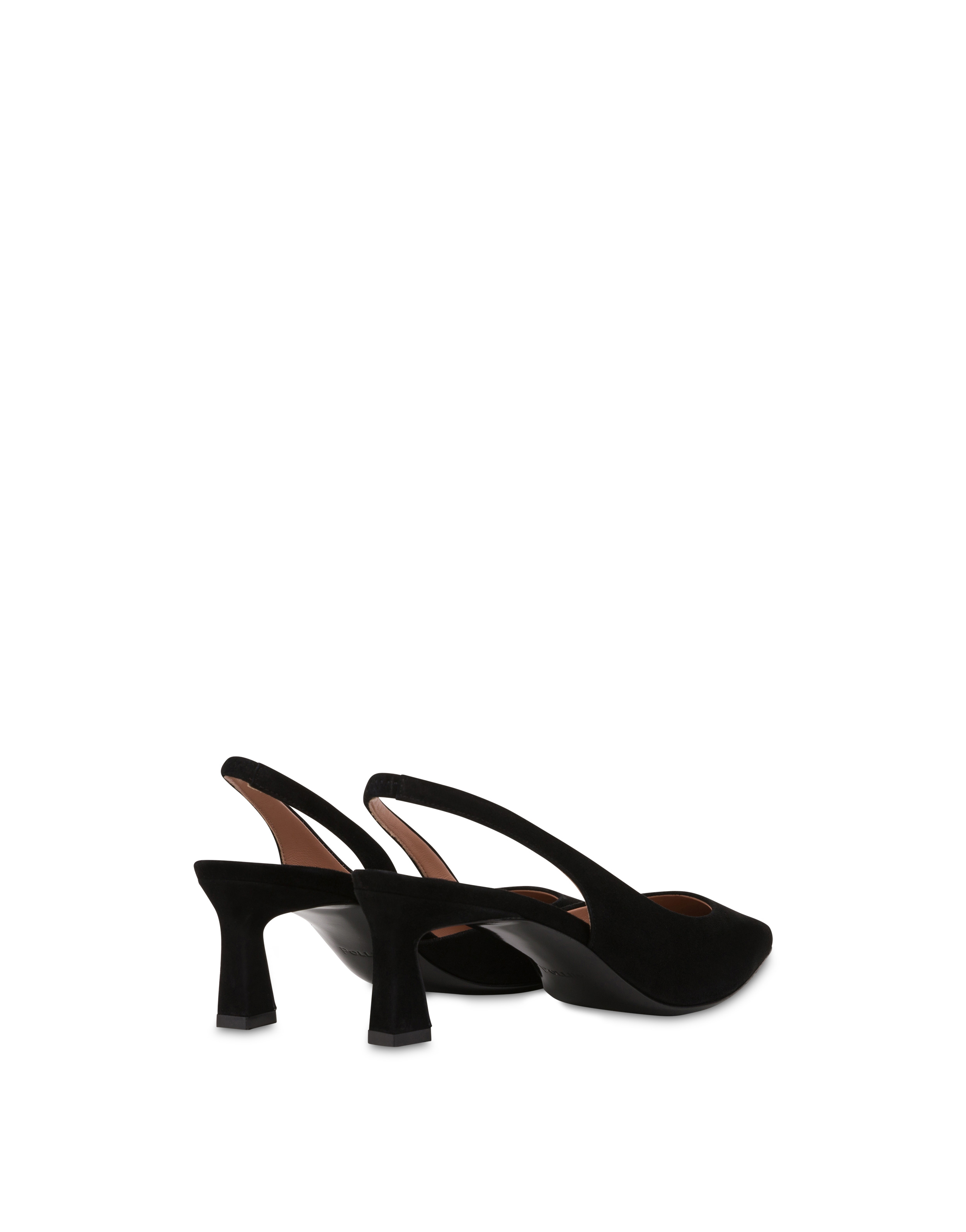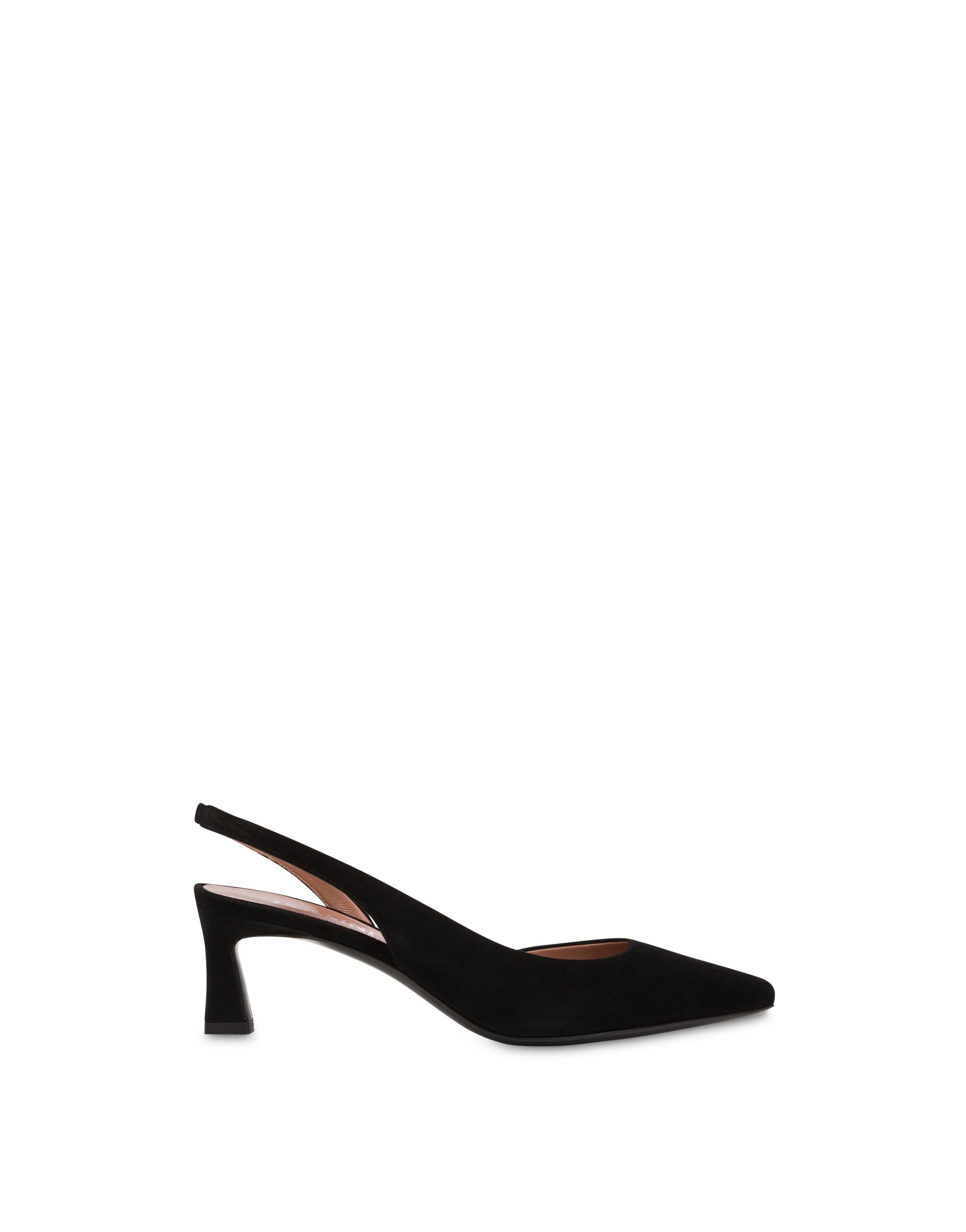 Slingback in camoscio dalla silhouette moderna dal velato gusto retrò. Punta a scalpello ed elegante tacco a colonna dalle linee geometriche.