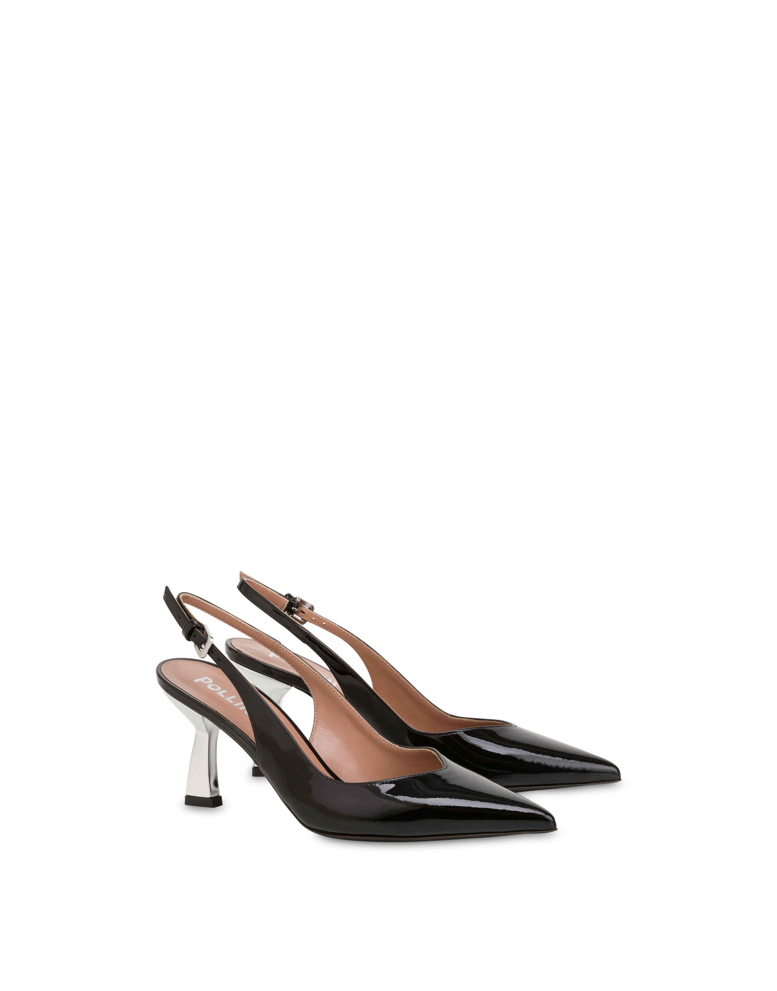 Slingback in vernice dalla nuova forma sfilata, che trova la sua unicità nel tacco metallizzato dal design contemporaneo. La tomaia è essenziale, caratterizzata da scollo a V, estremamente moderno e sensuale.