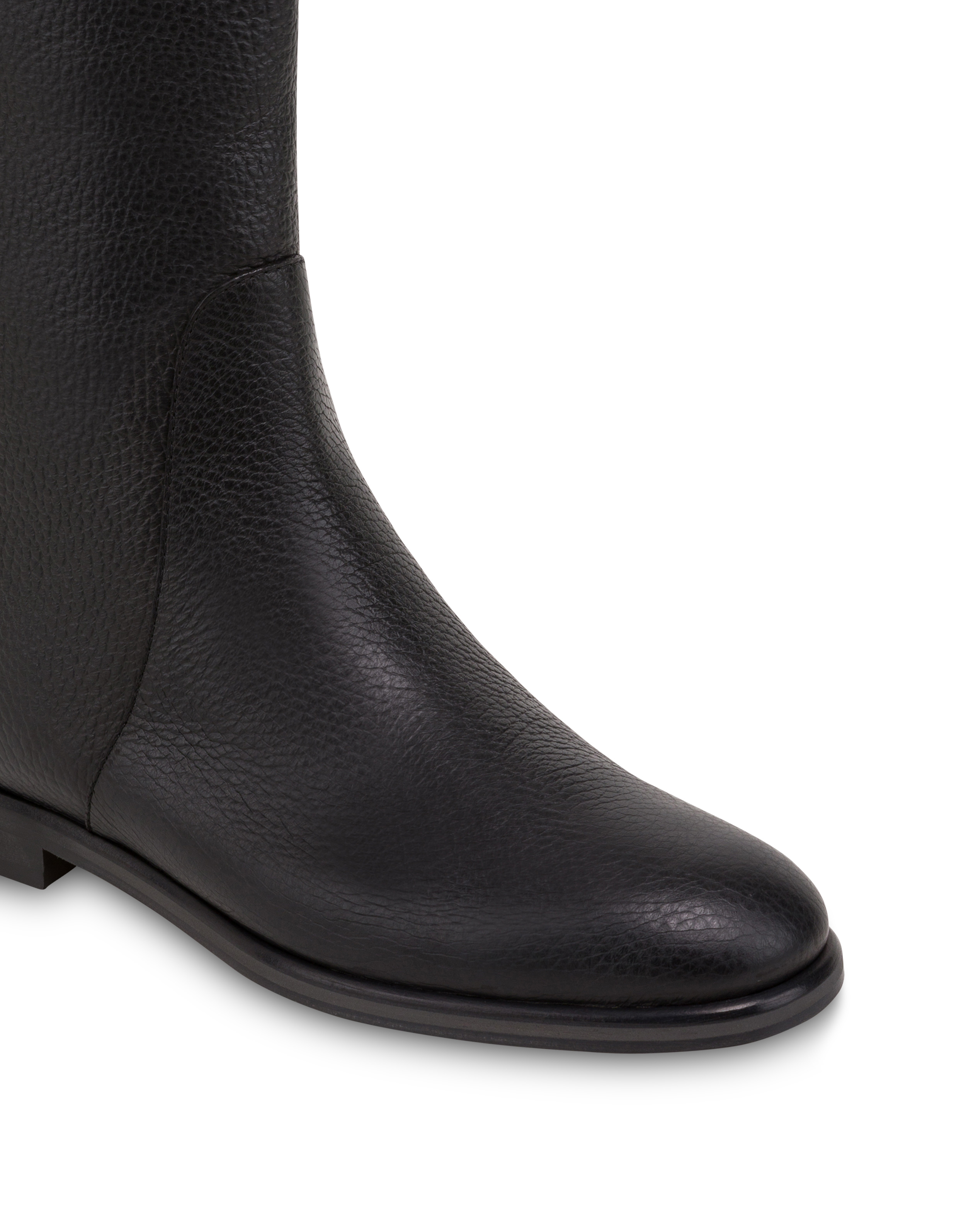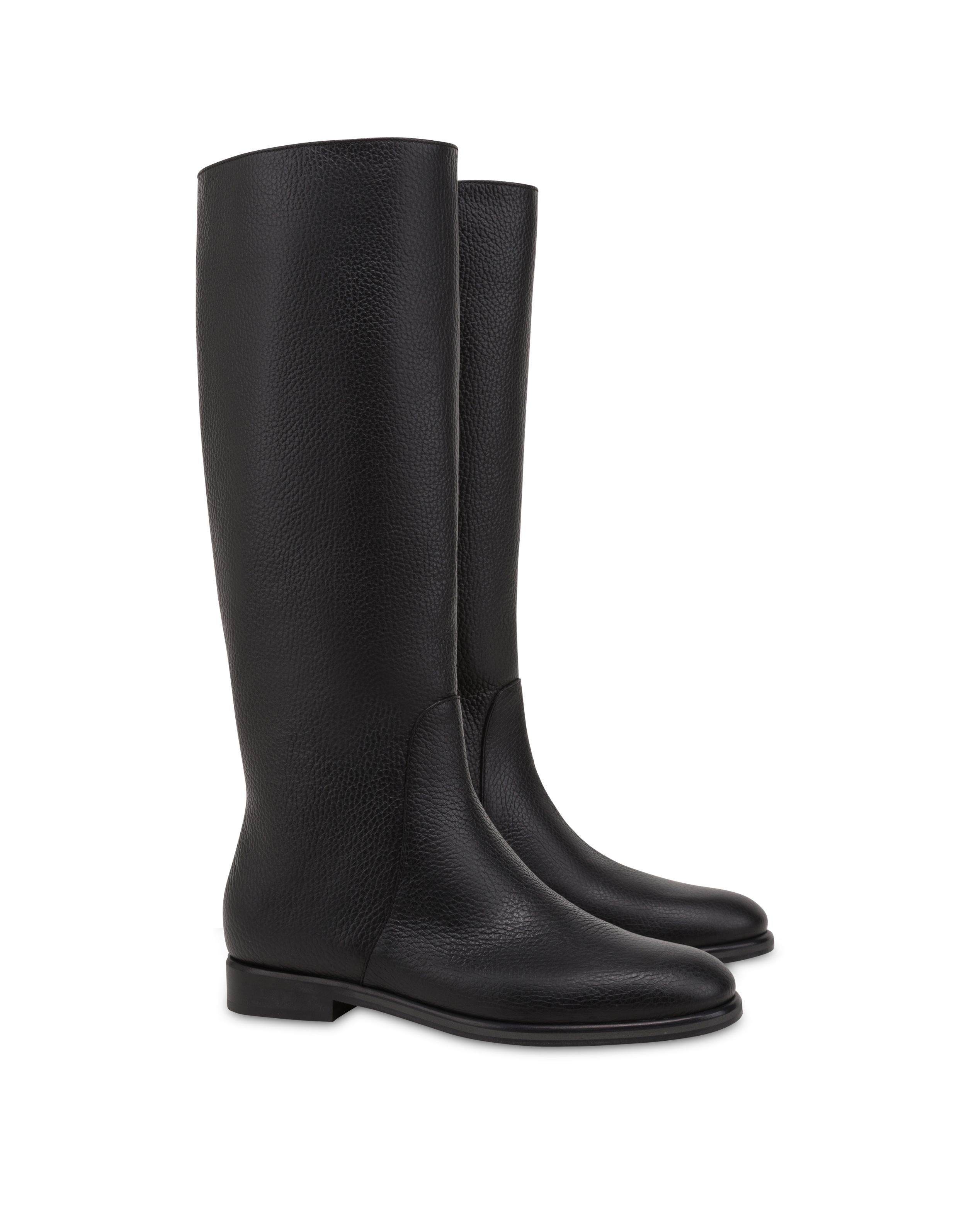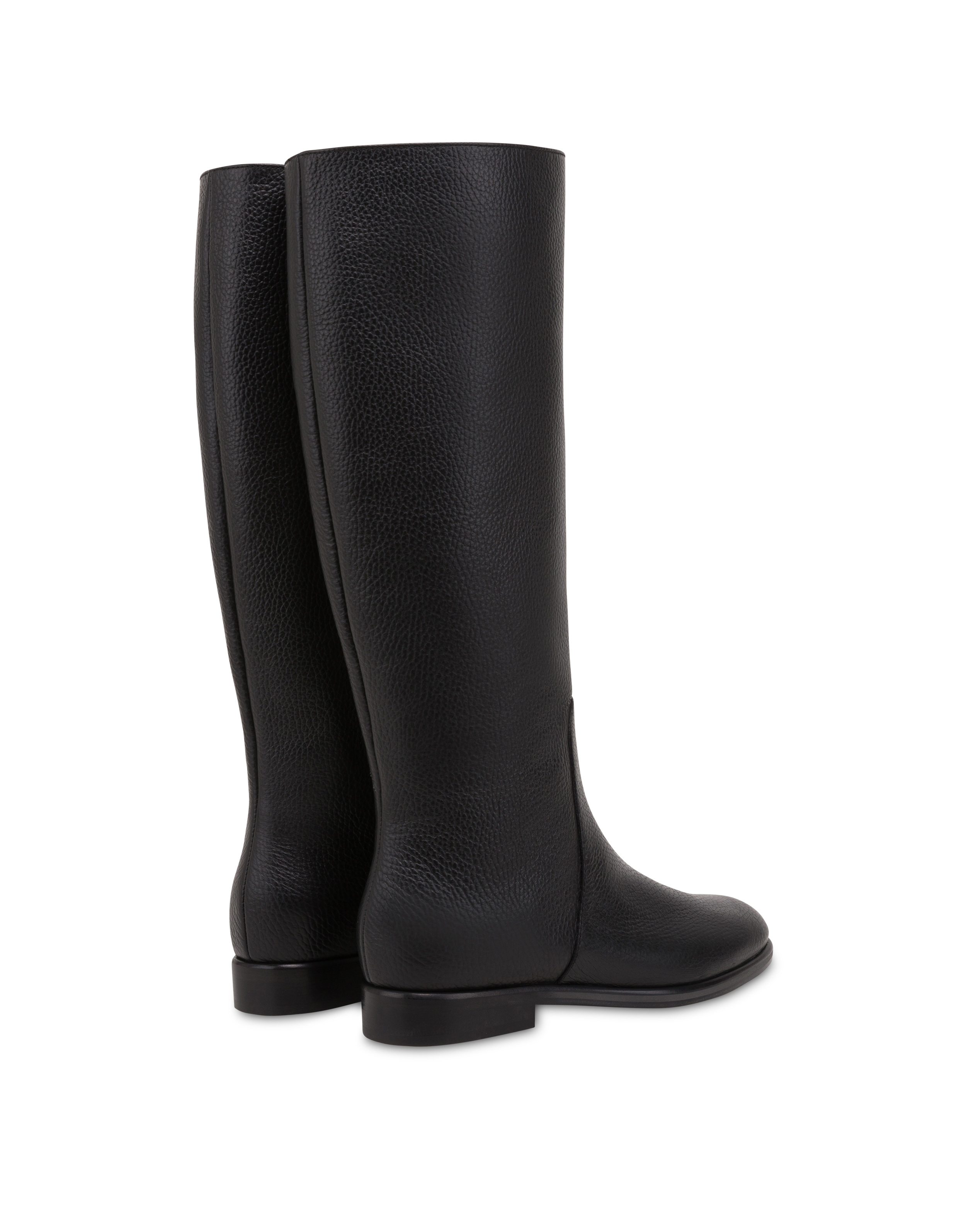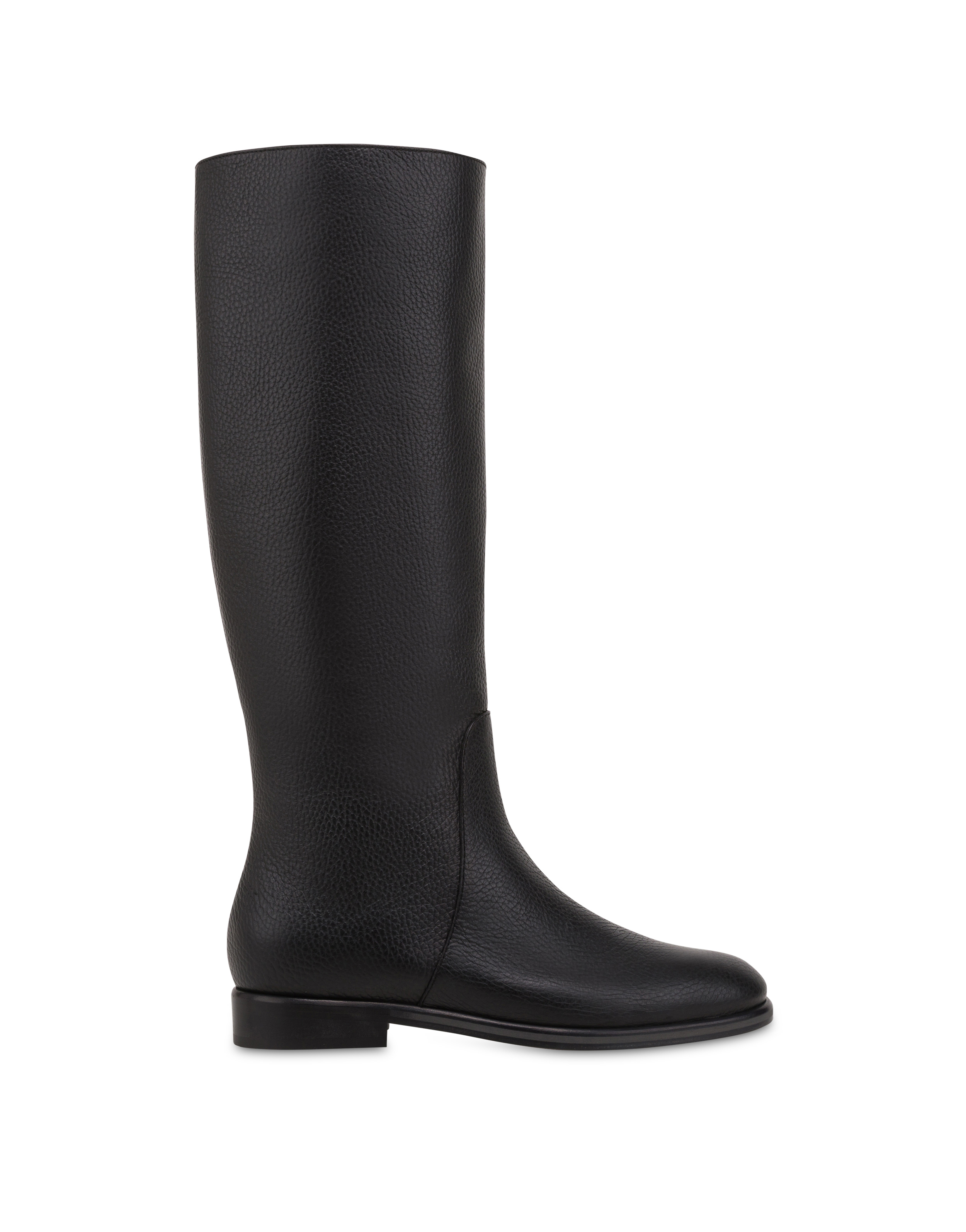 Stivale Cavaliere flat in vitello stampa alce, dai tagli minimal ed essenziali. La tradizionale suola 'cremino' completa ed esalta la tomaia pulita. Il colore classico del pellame si combina all'iconico fondo, creando piacevoli accostamenti cromatici.