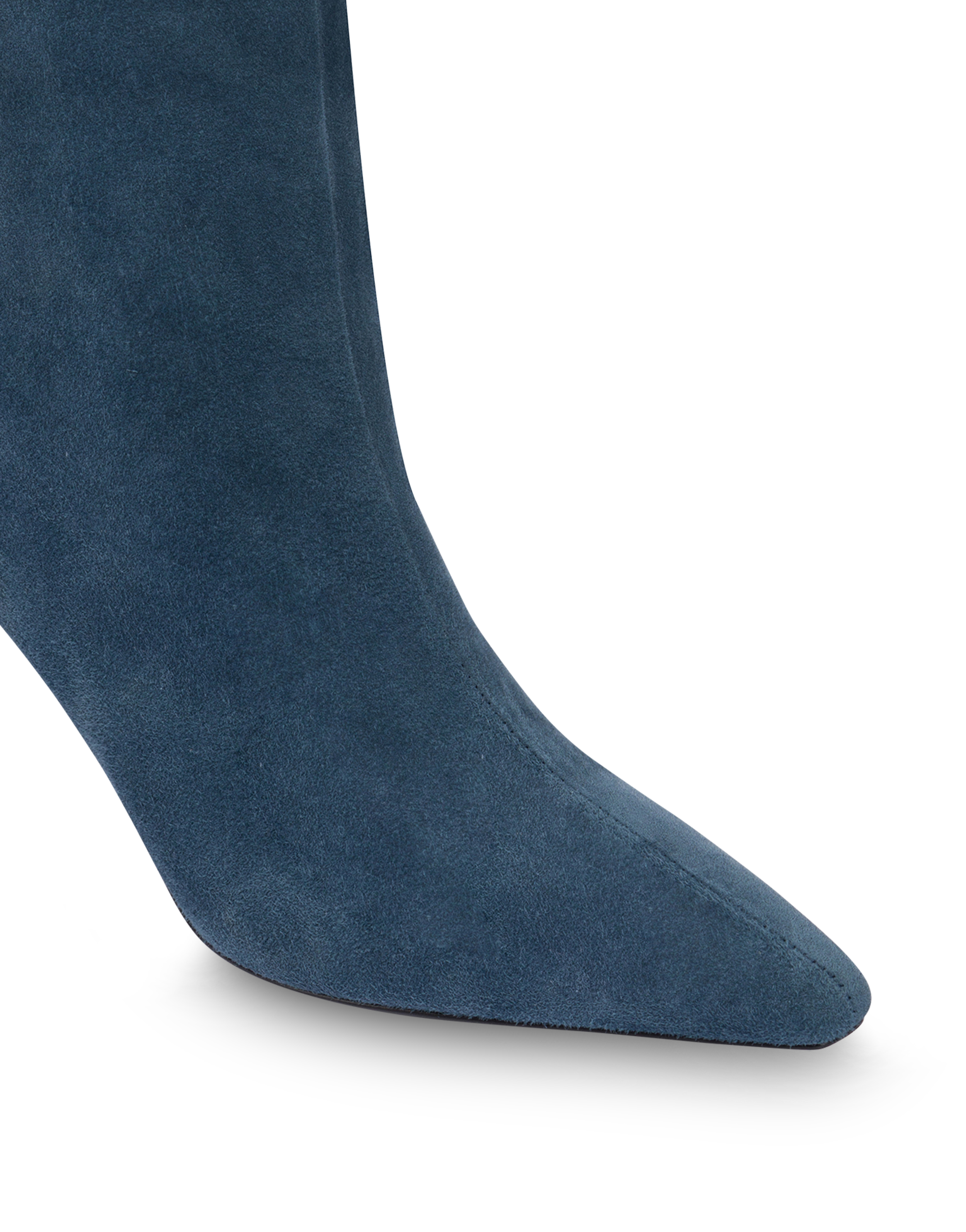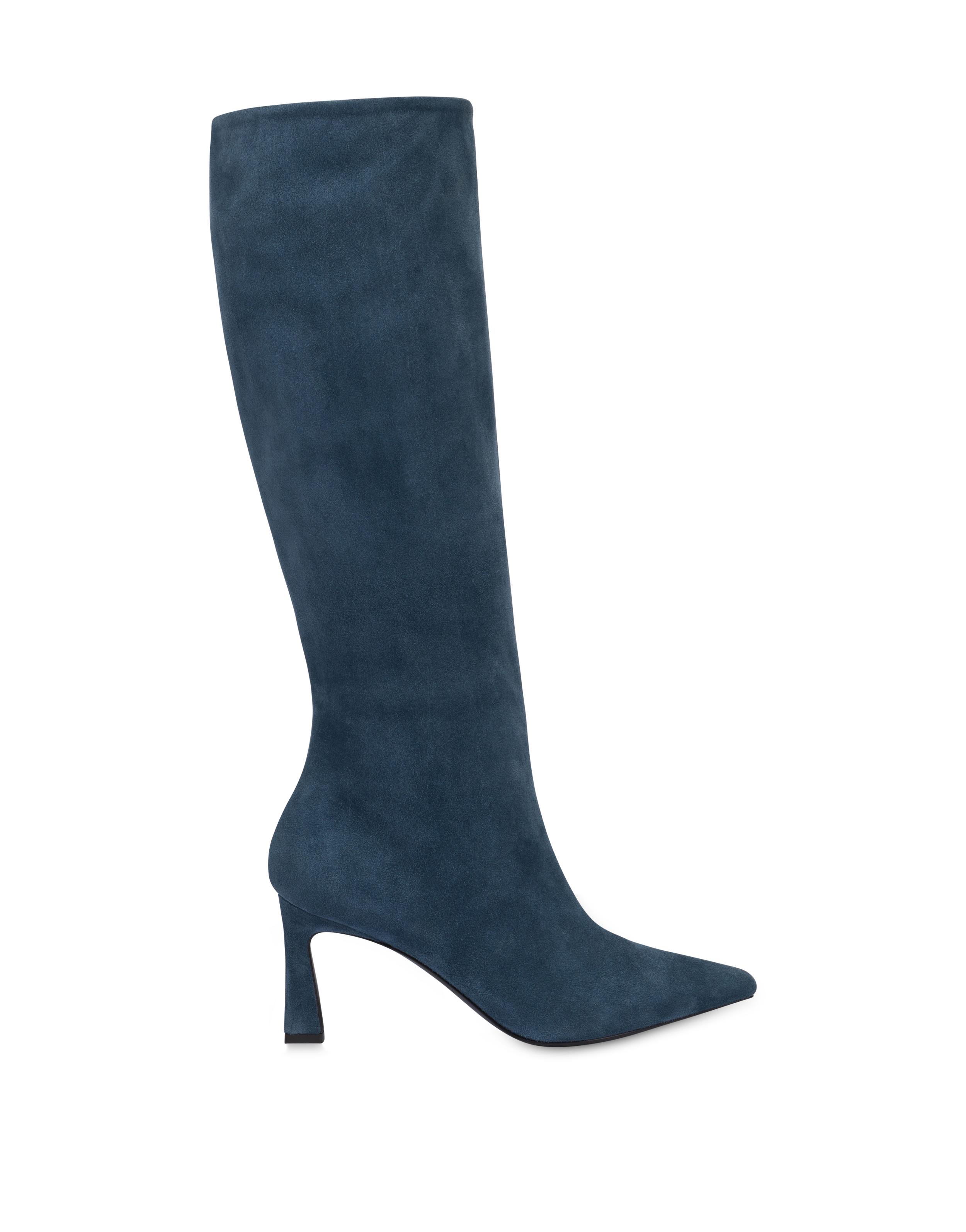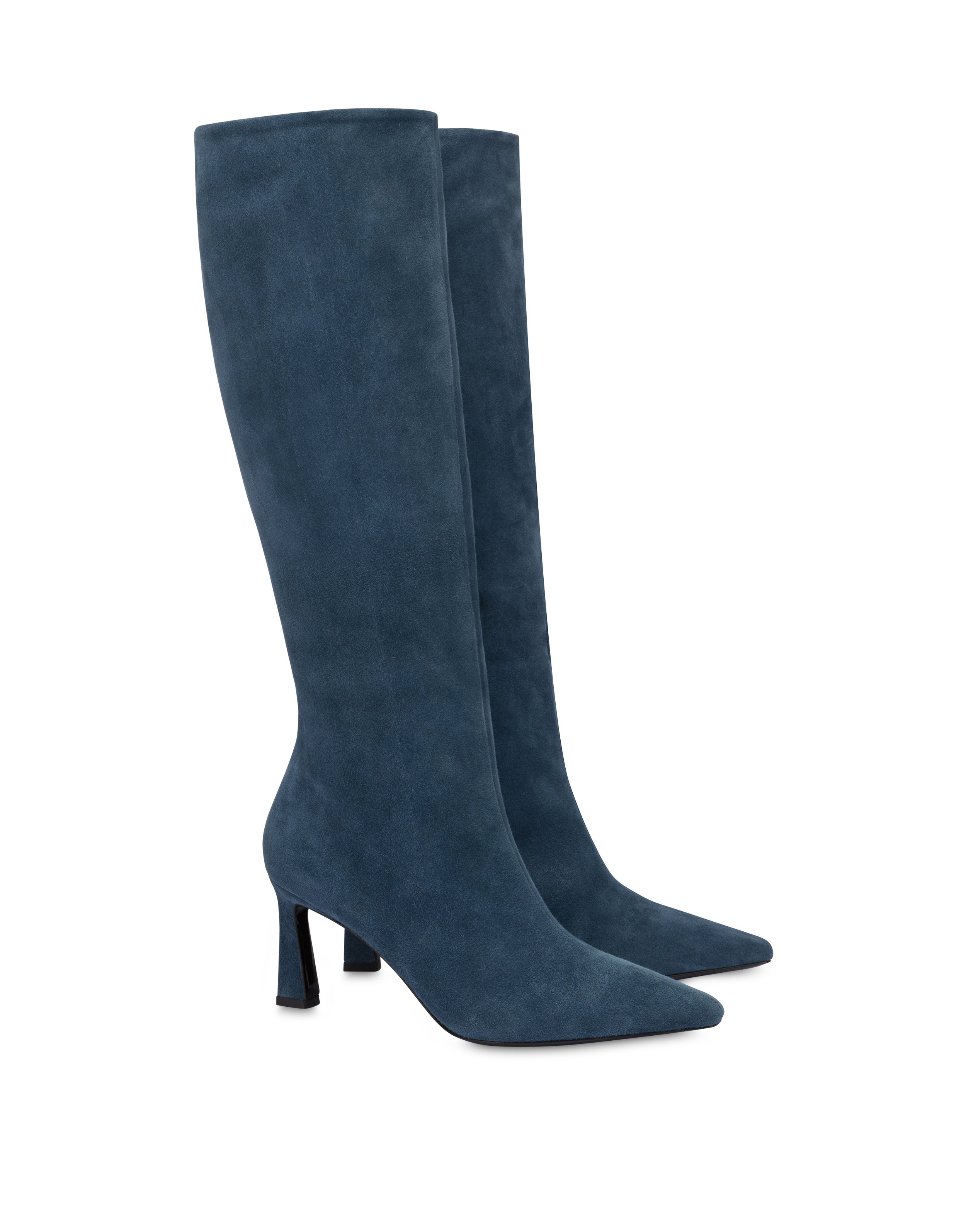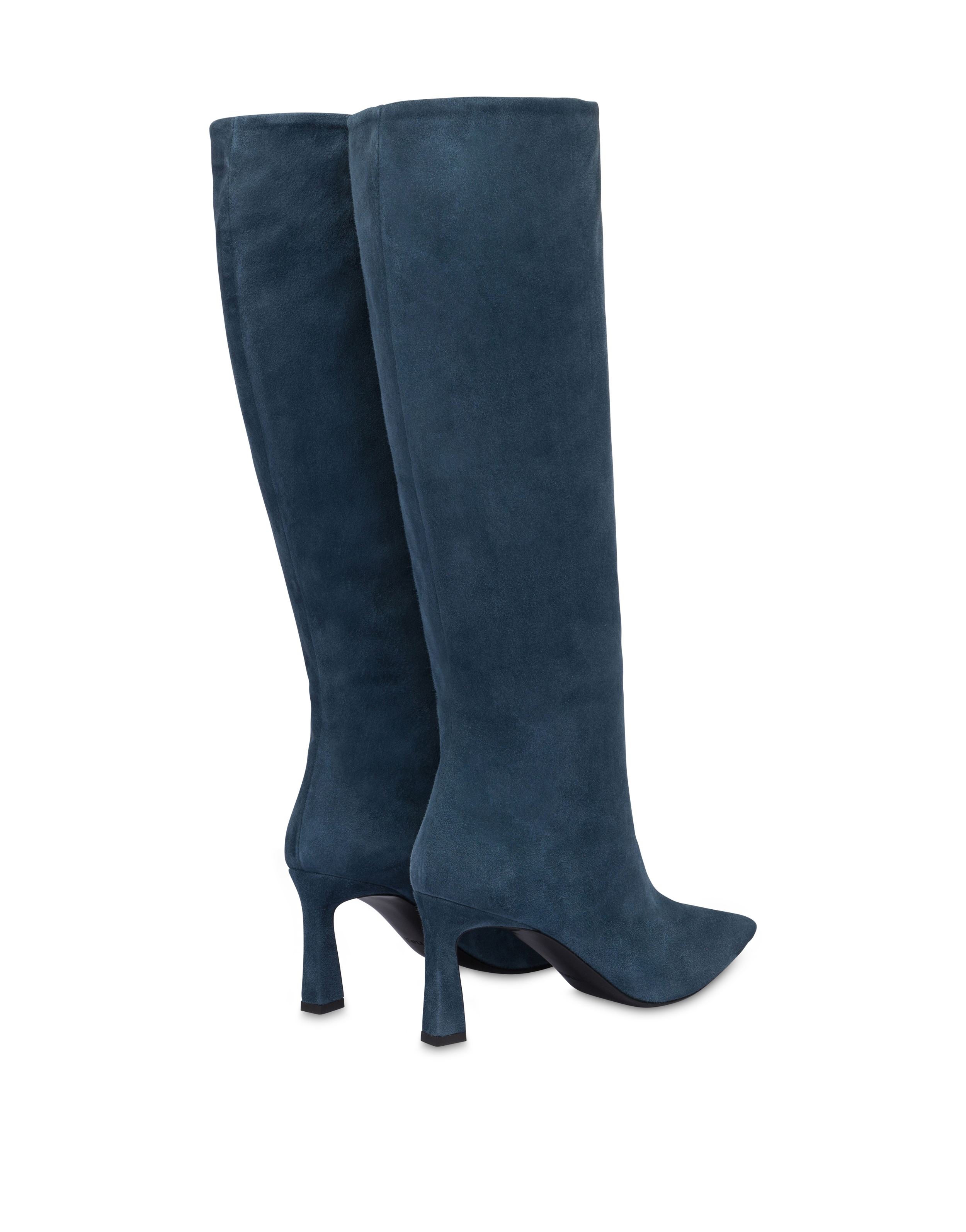 Stivali a tubo in morbido camoscio dalla silhouette moderna dal velato gusto retrò. Punta a scalpello ed elegante tacco a colonna dalle linee geometriche.
