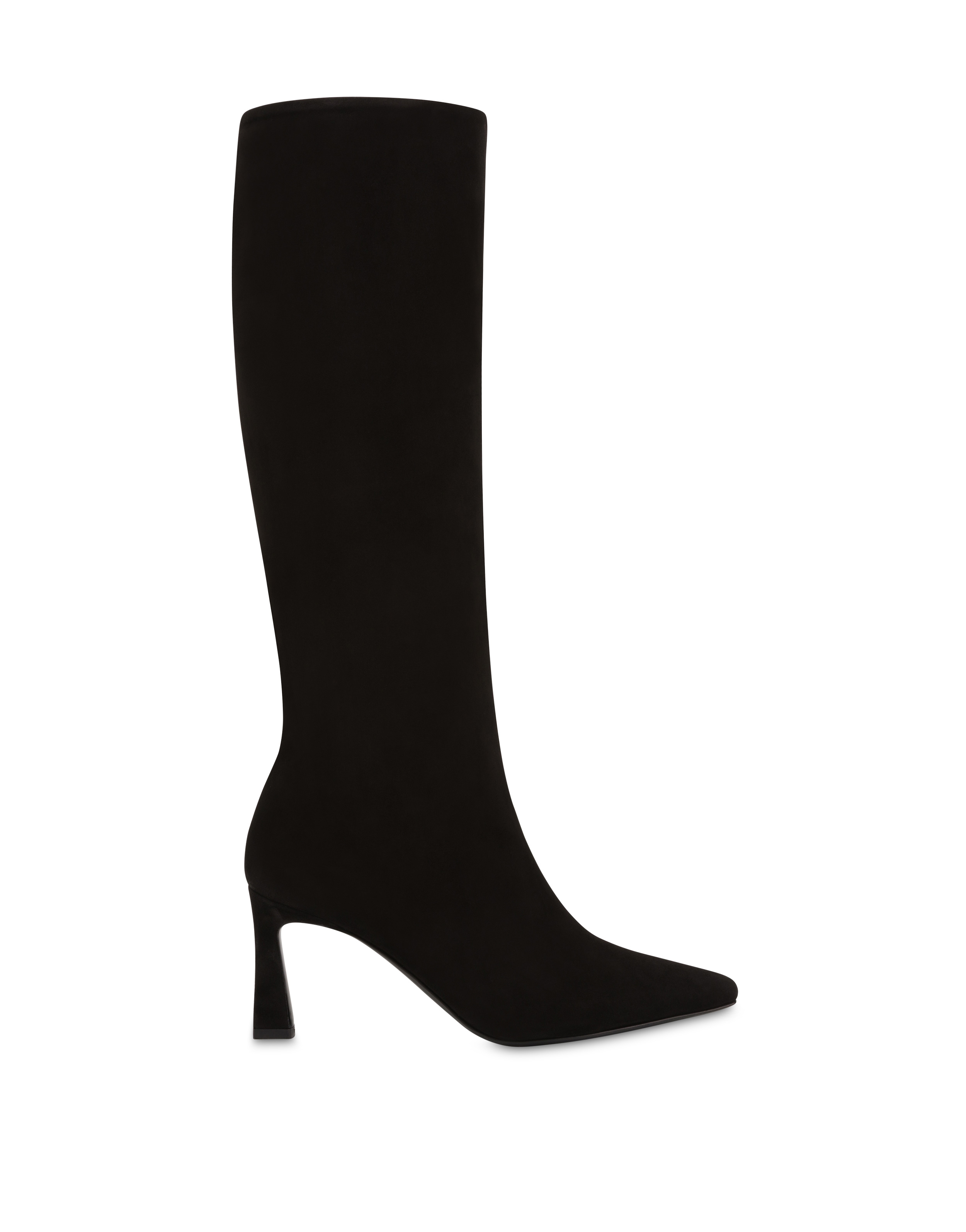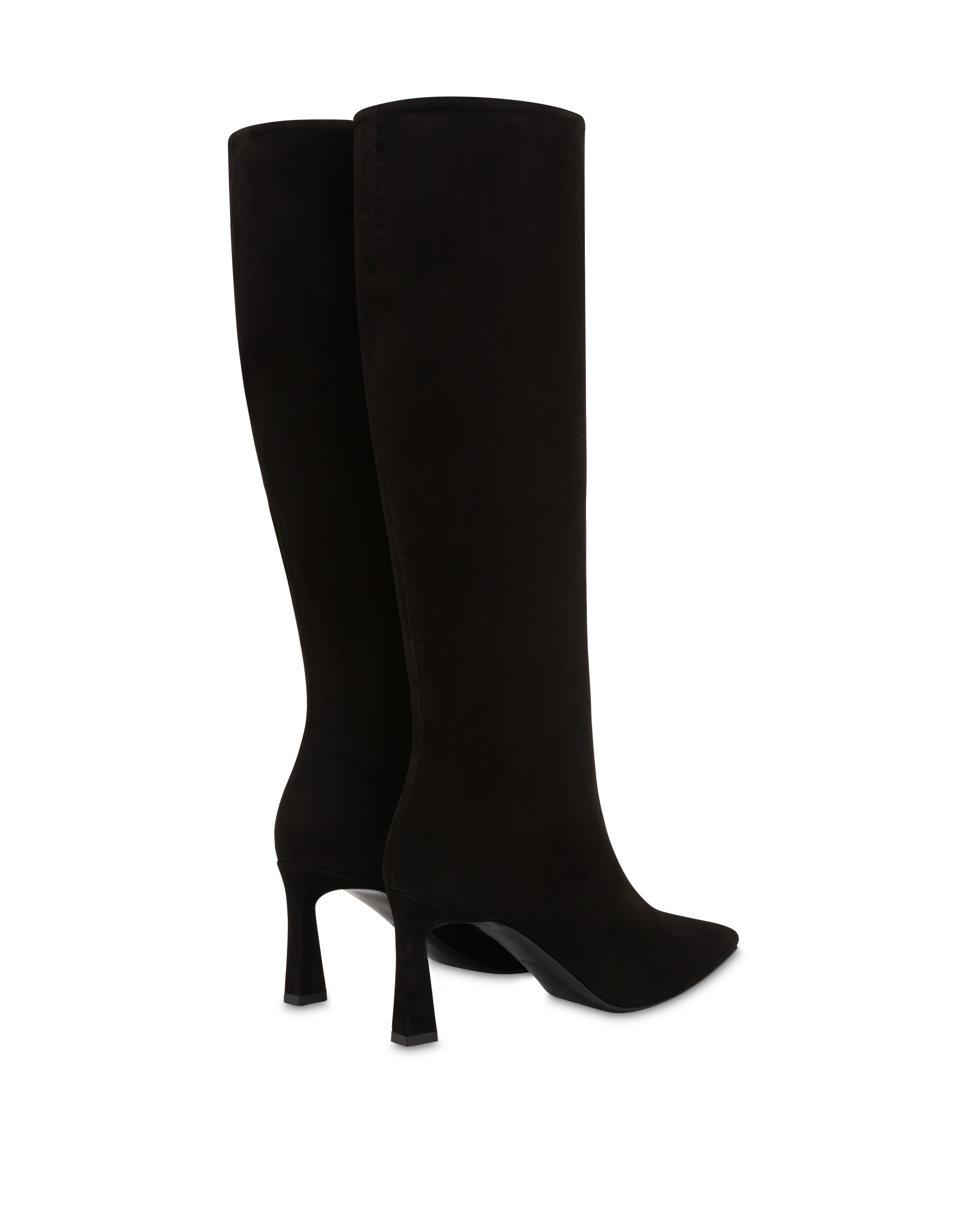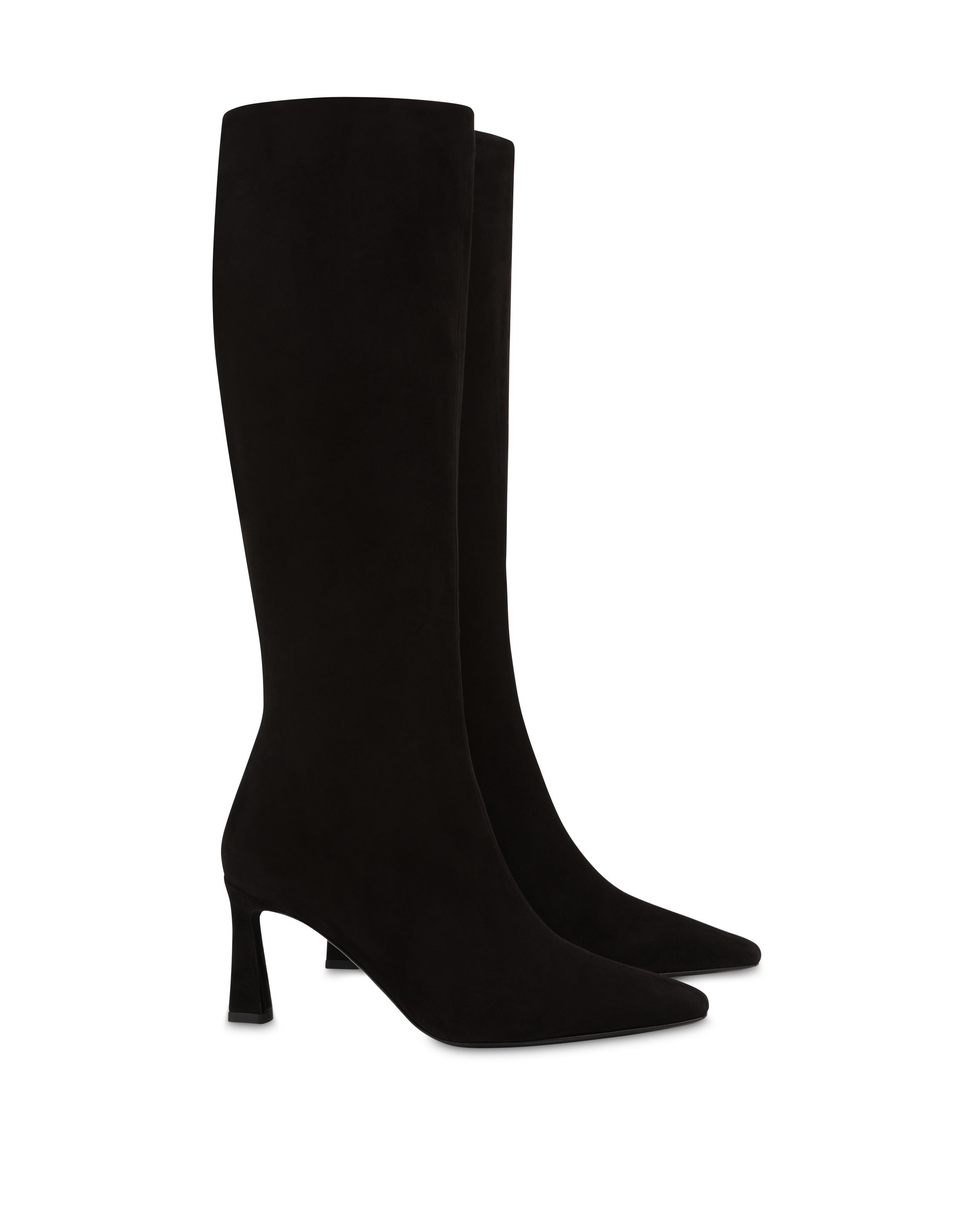 Stivali a tubo in morbido camoscio dalla silhouette moderna dal velato gusto retrò. Punta a scalpello ed elegante tacco a colonna dalle linee geometriche.