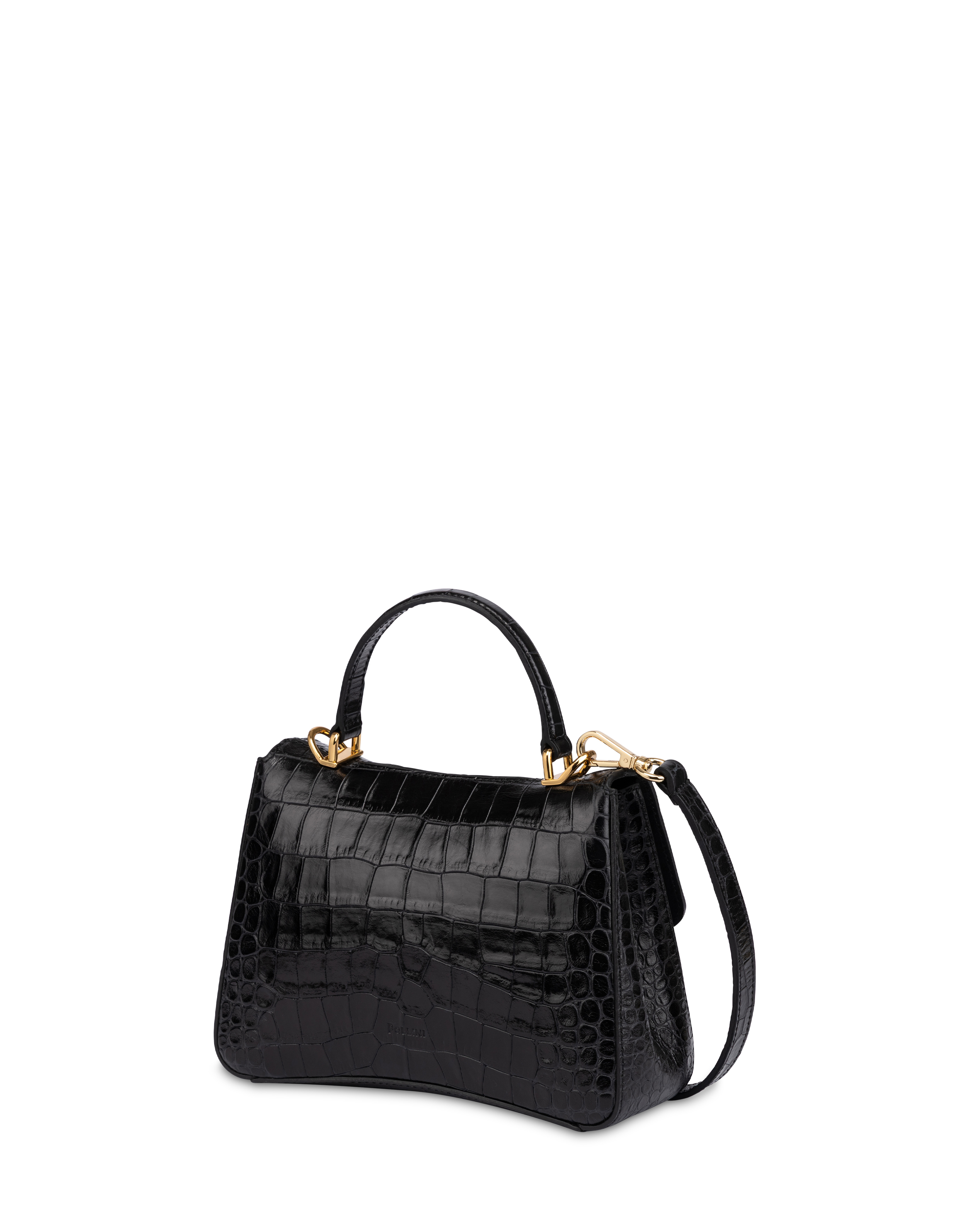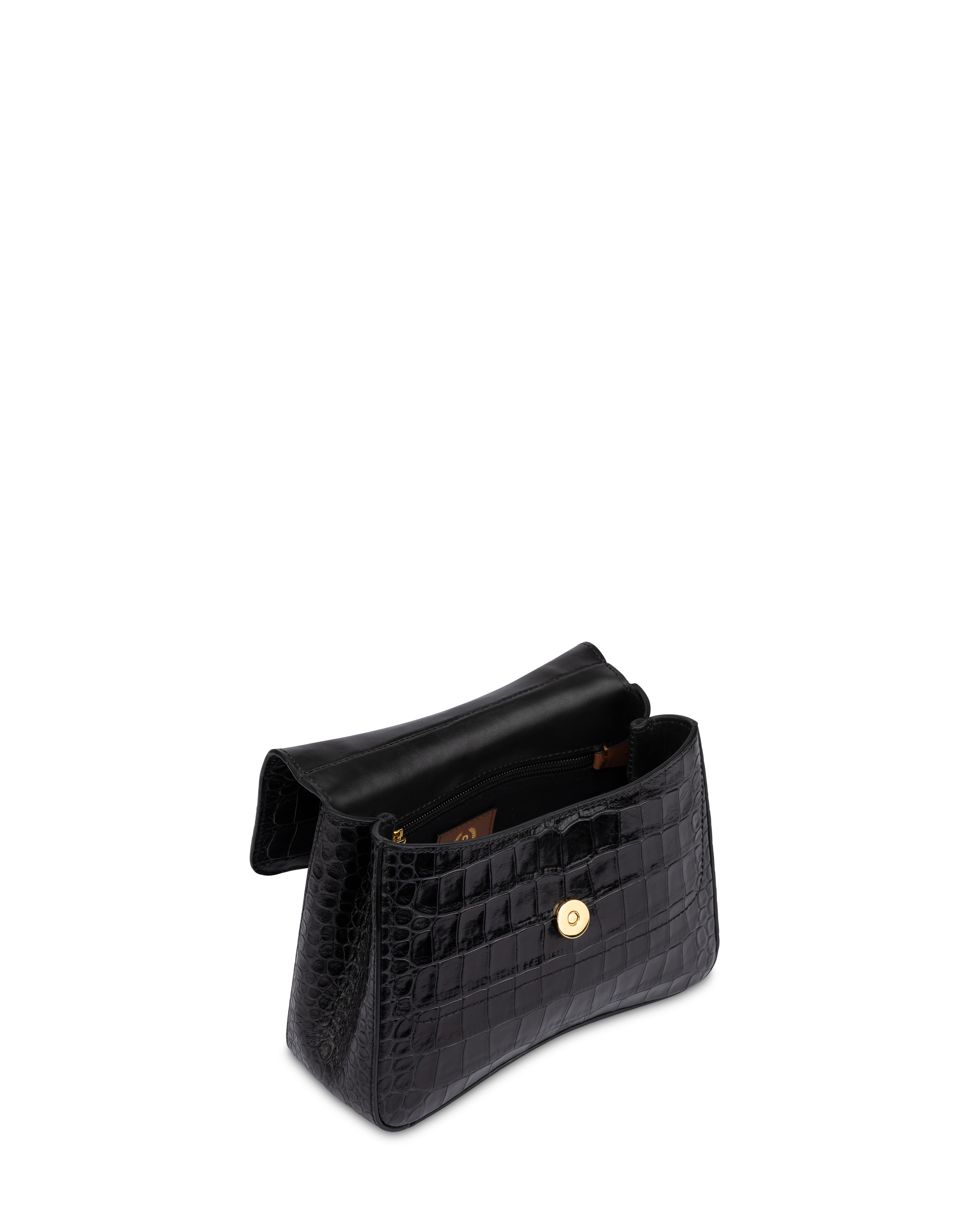 Un’icona di stile raffinato, la Top Handle Bag Muse si distingue per la sua silhouette strutturata e il fascino senza tempo. In questa versione in vitello stampa cocco, la texture esotica dona un carattere deciso e sofisticato, esaltato dalla finitura lucida e dai dettagli in galvanica gold.Il manico e la tracolla in pelle permettono un’elegante doppia portabilità. La chiusura magnetica rivela un interno foderato con tasca con zip e label logata in pelle. Il tocco finale è l’accessorio metallico frontale, impreziosito dal logo inciso “P Alloro”, segno distintivo della Maison.