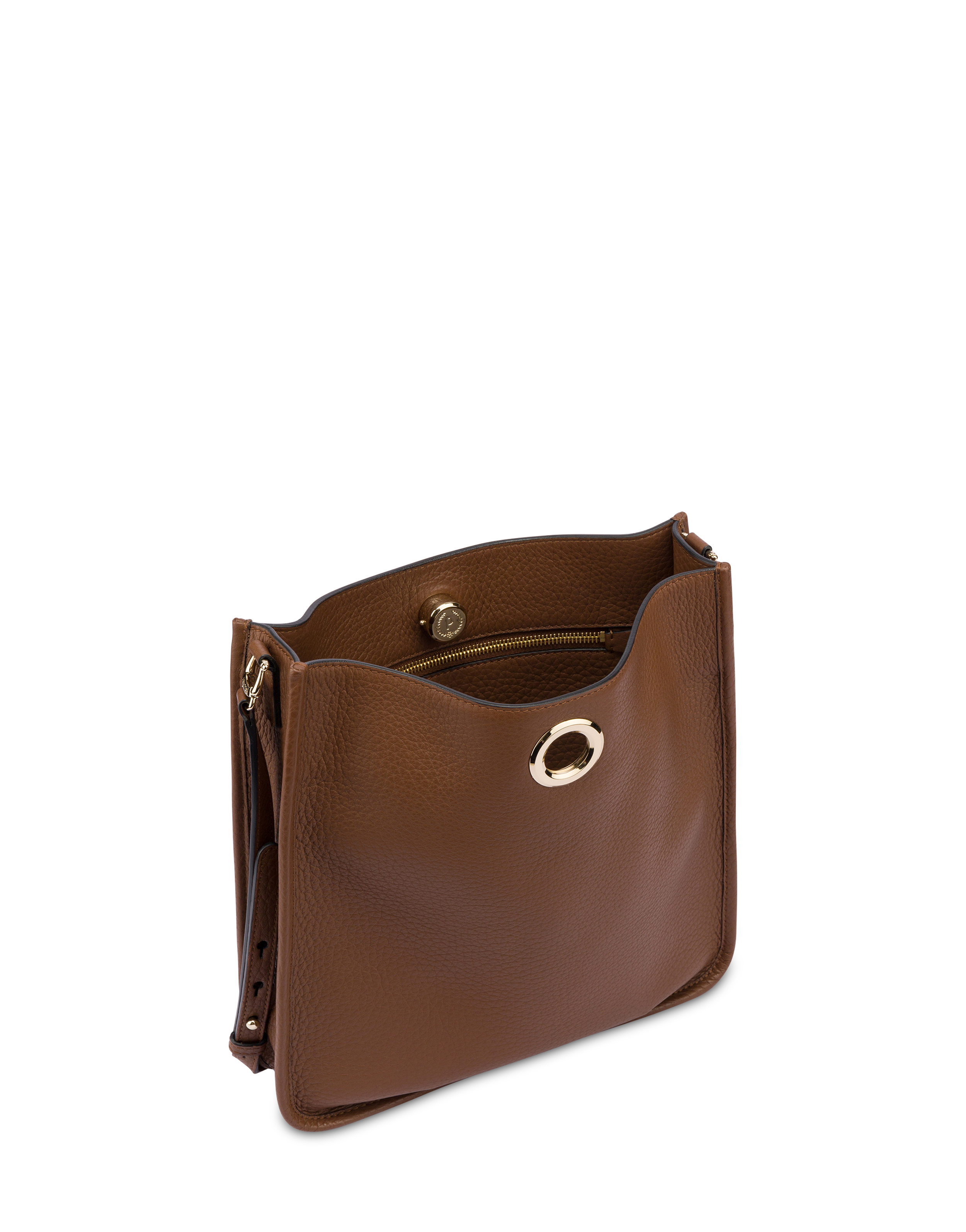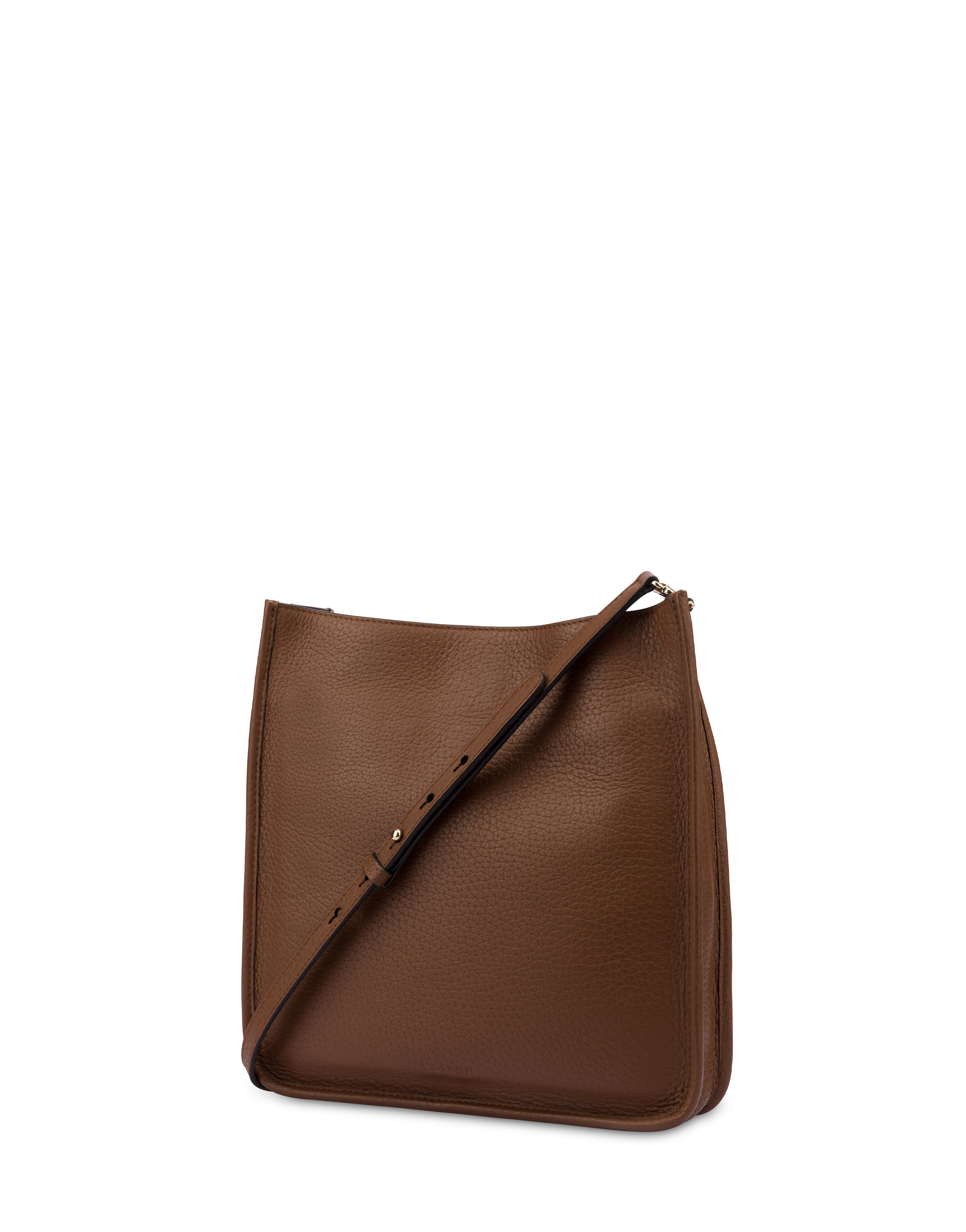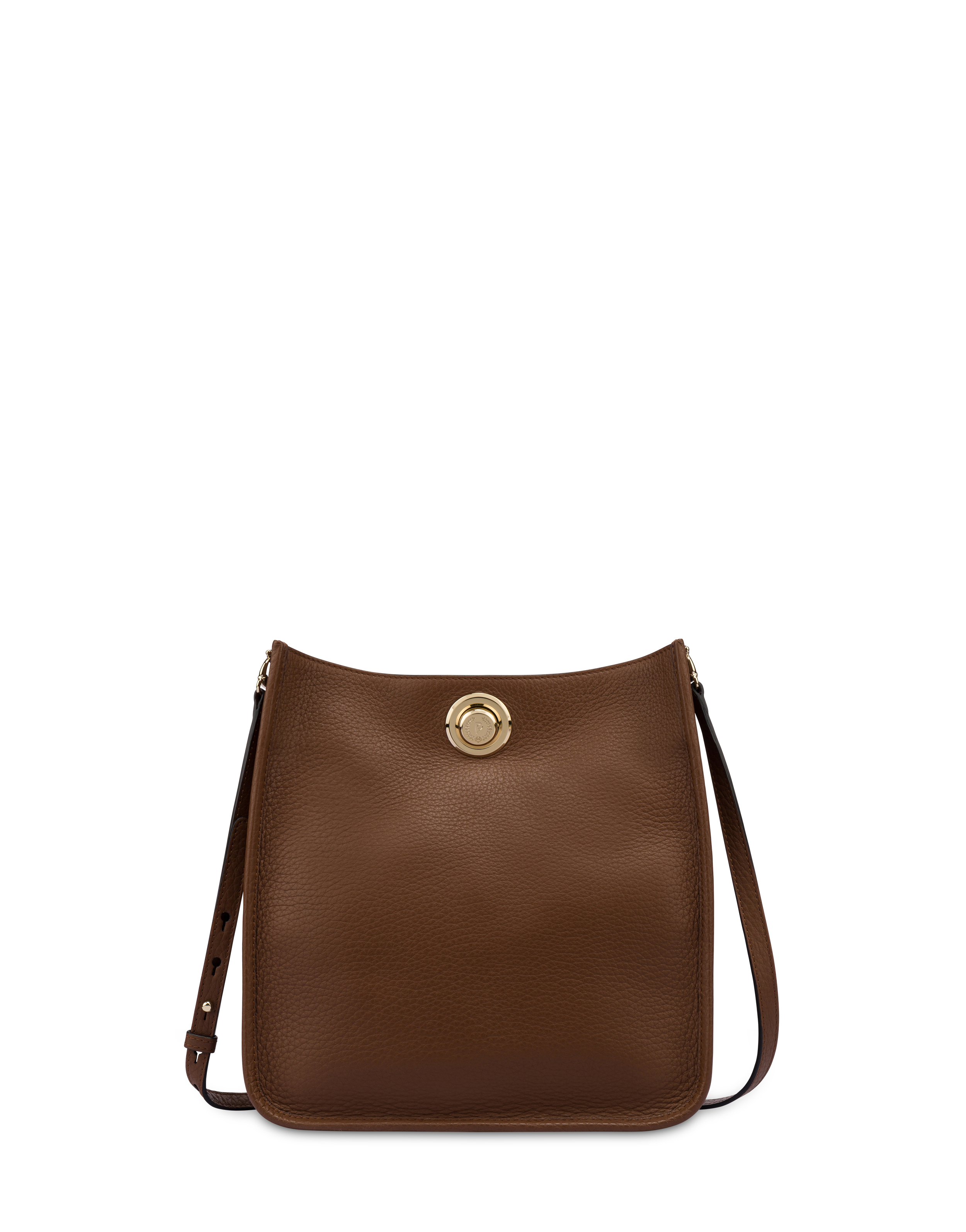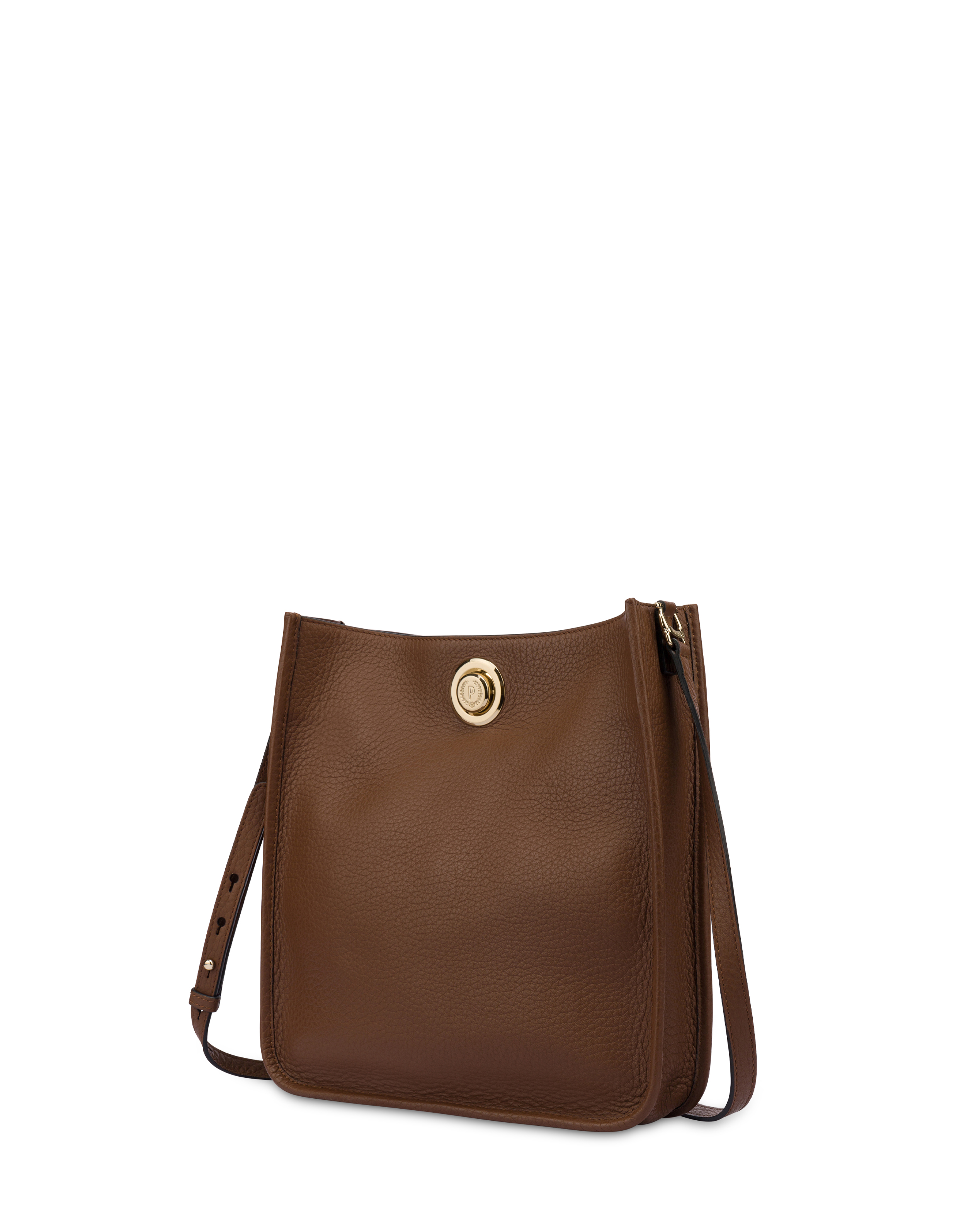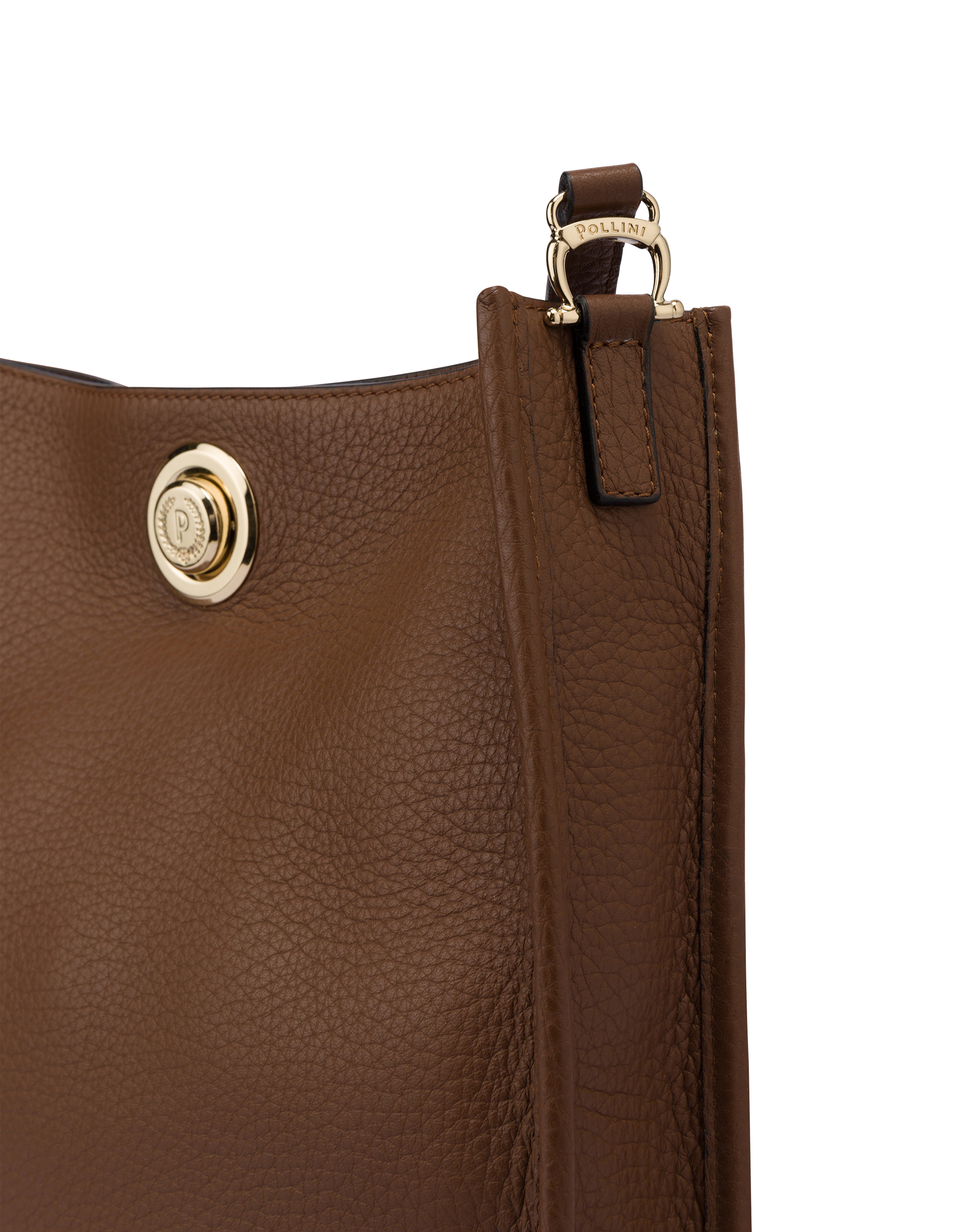 Borsa a tracolla impreziosita dalla chiusura bottone logato. Realizzata in morbido vitello bottalato double, è caratterizzata da linee stondate e giochi di bombature. Tracolla impreziosita da fibbie ornamentali Pollini Archive.