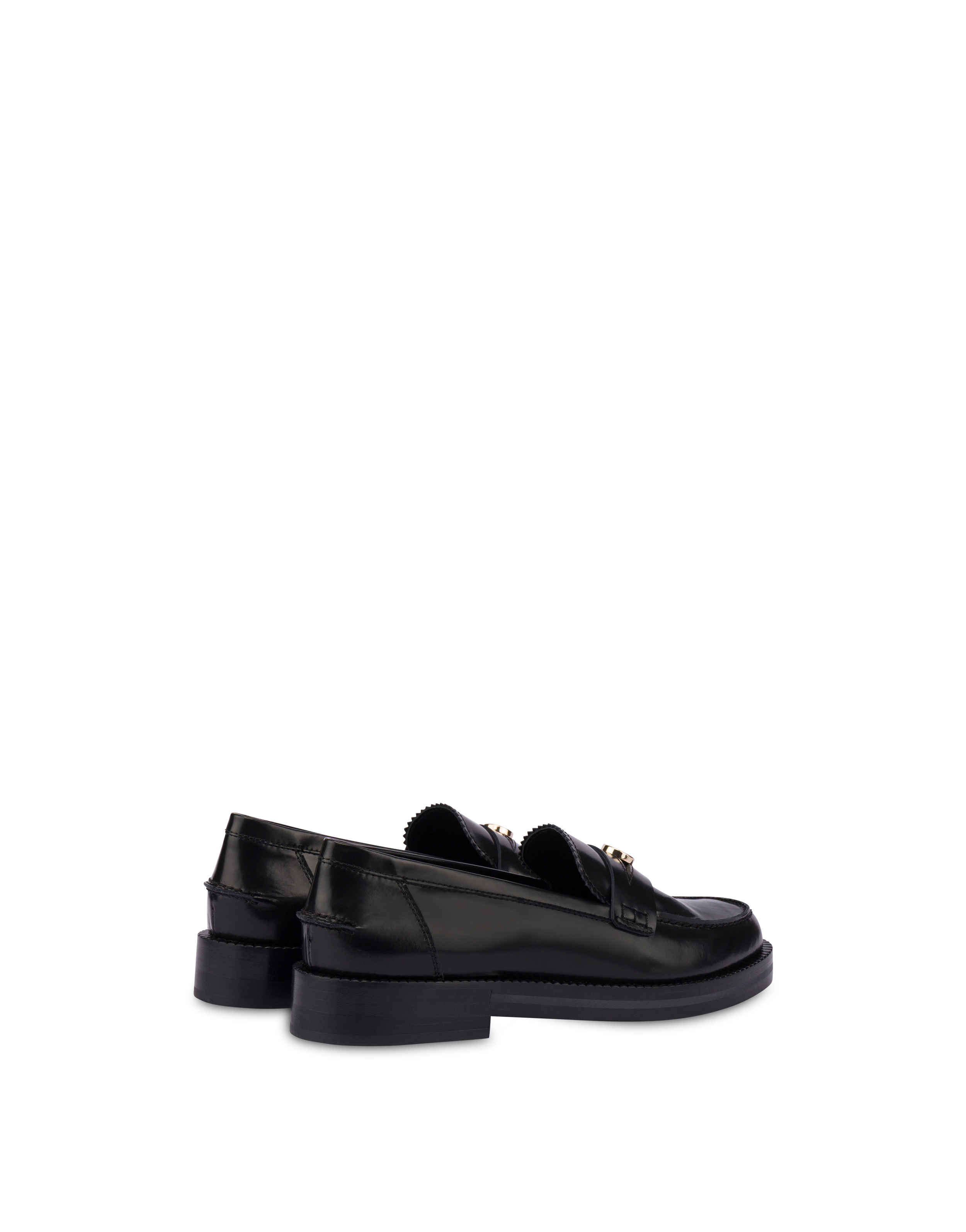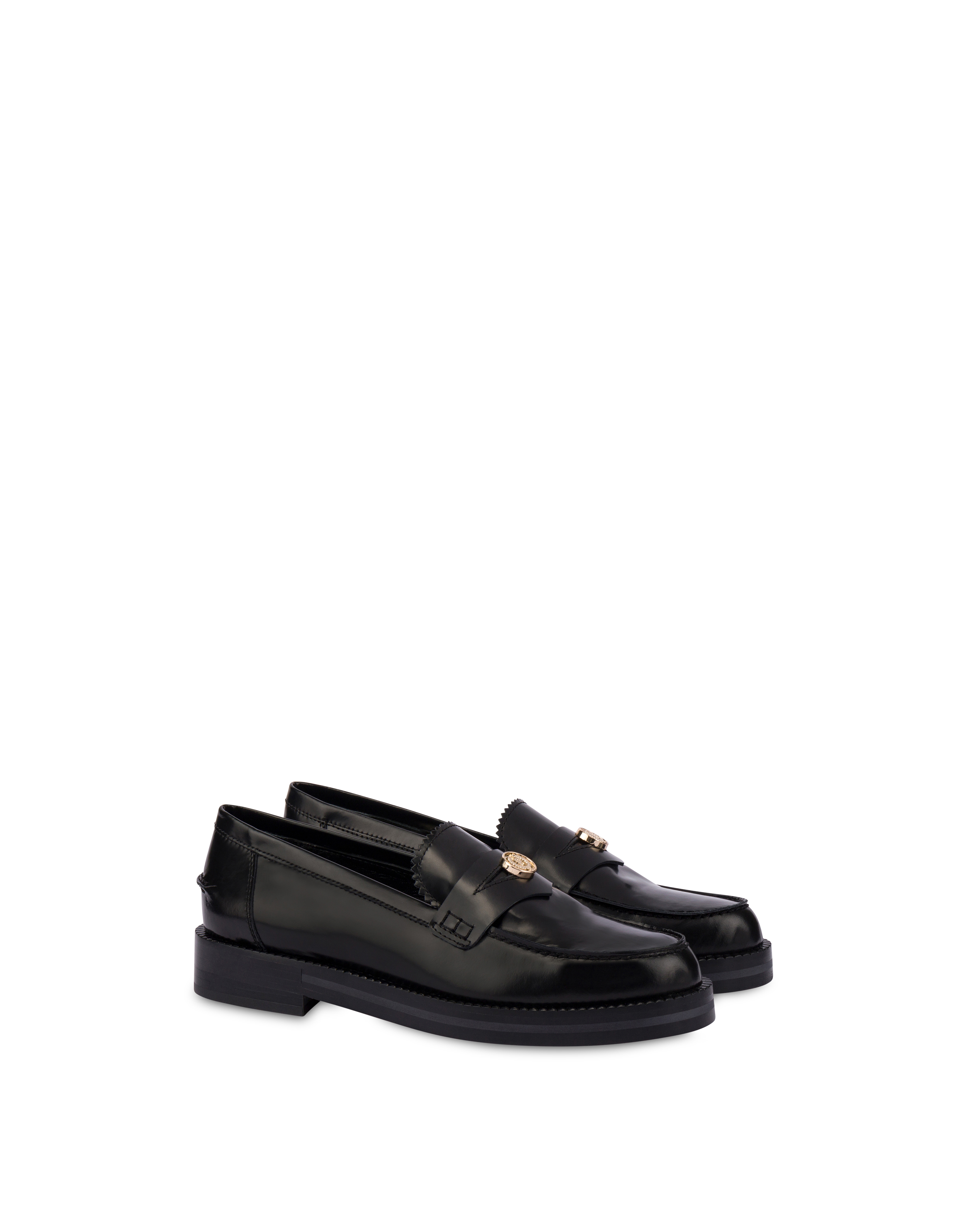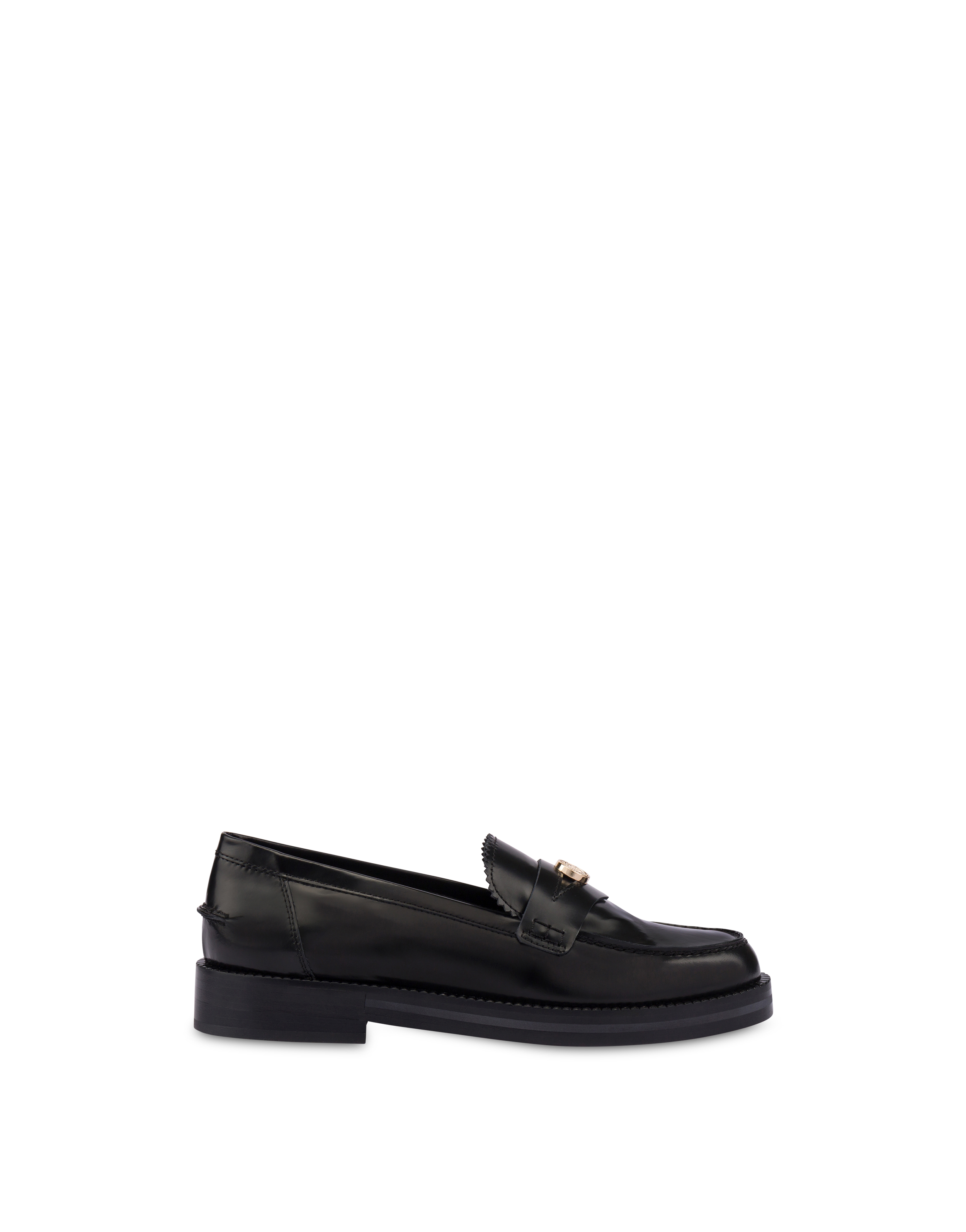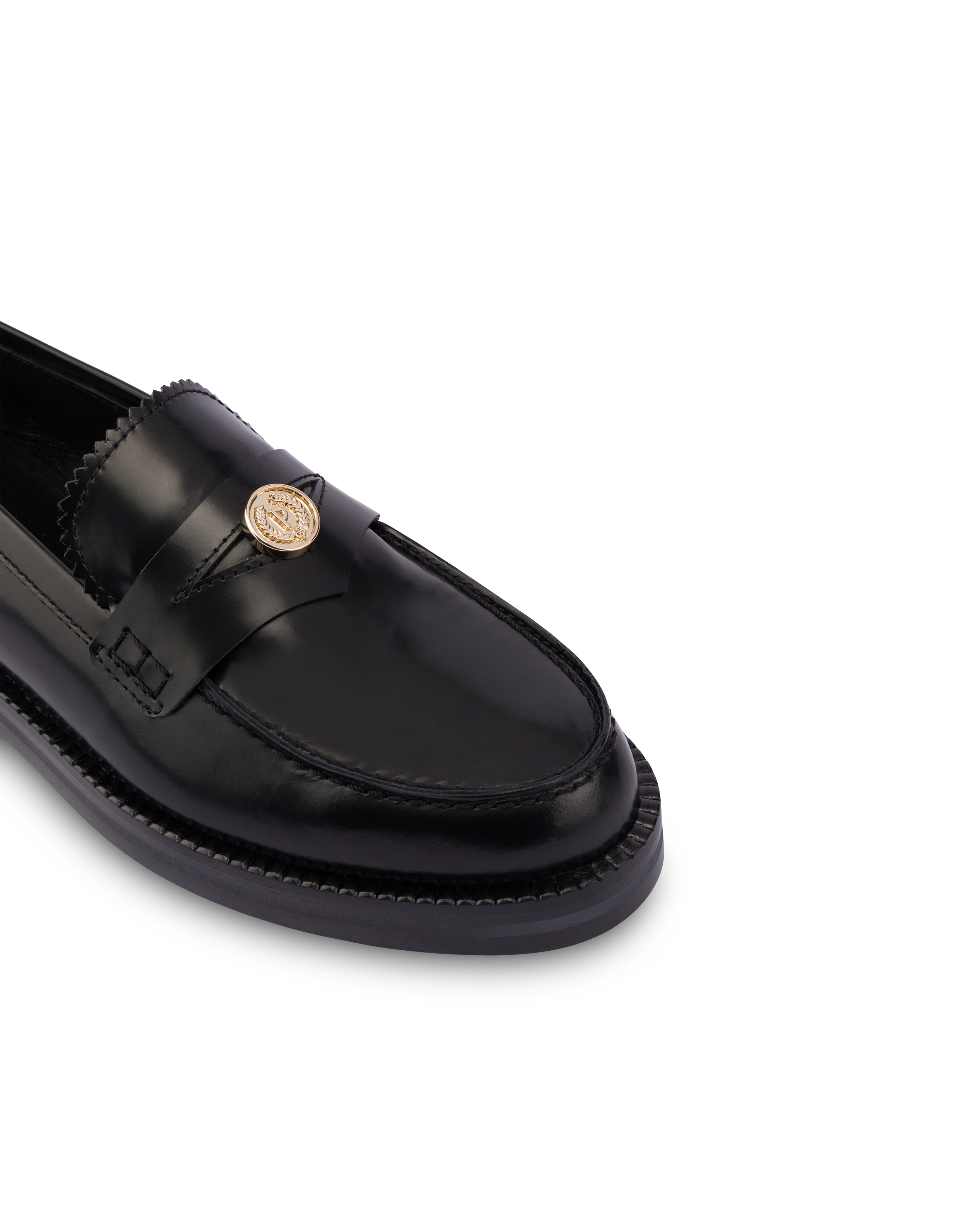 Loafer in vitello abrasivato asportabile adornato dalla borchia con logo P-alloro in galvanica oro chiaro. Tagli vivi, cuciture sportive e bordone di pelle si fondono con la nuova suola in cuoio, rinnovata nel volume e nelle linee con un prominente guardolo rotellato.