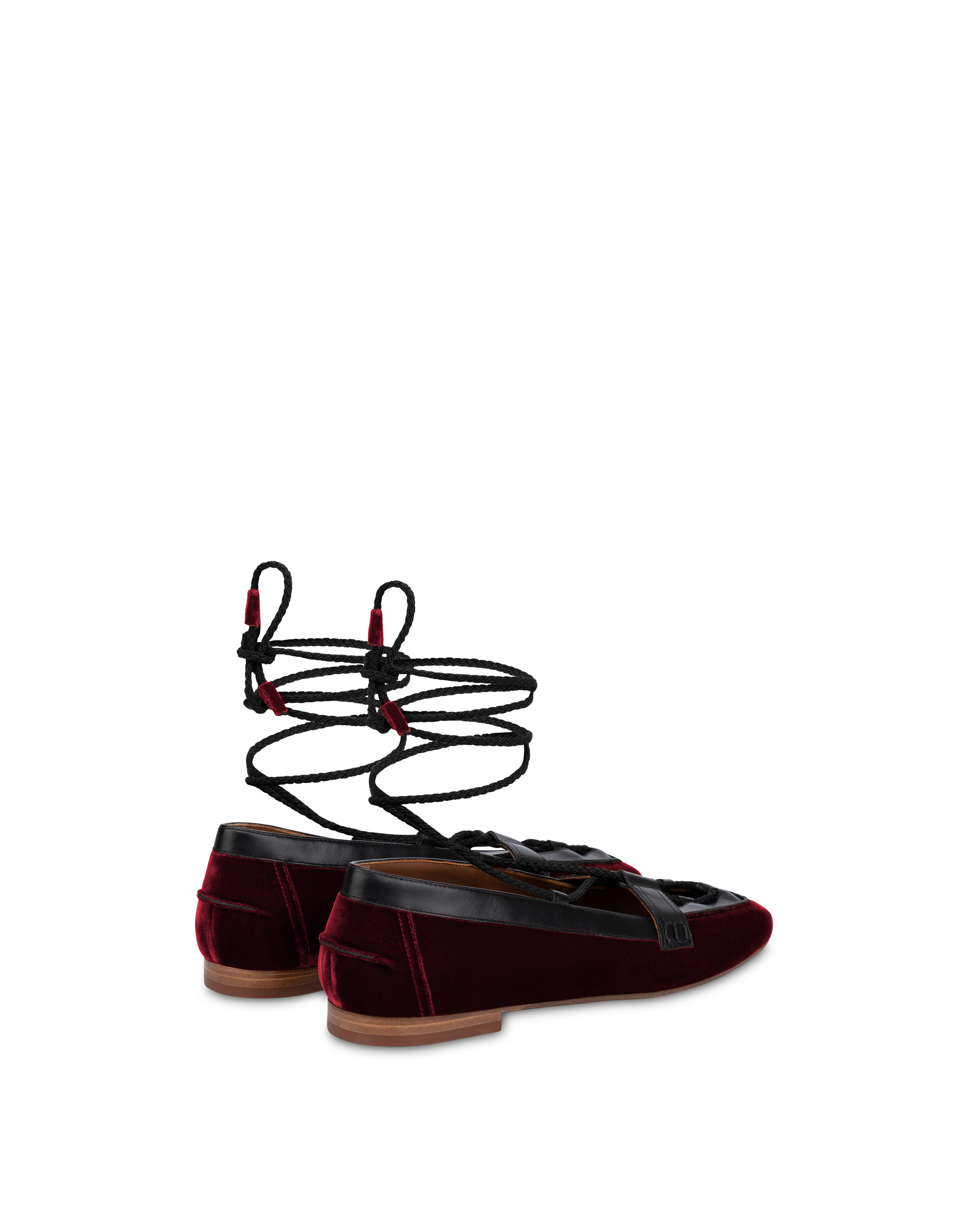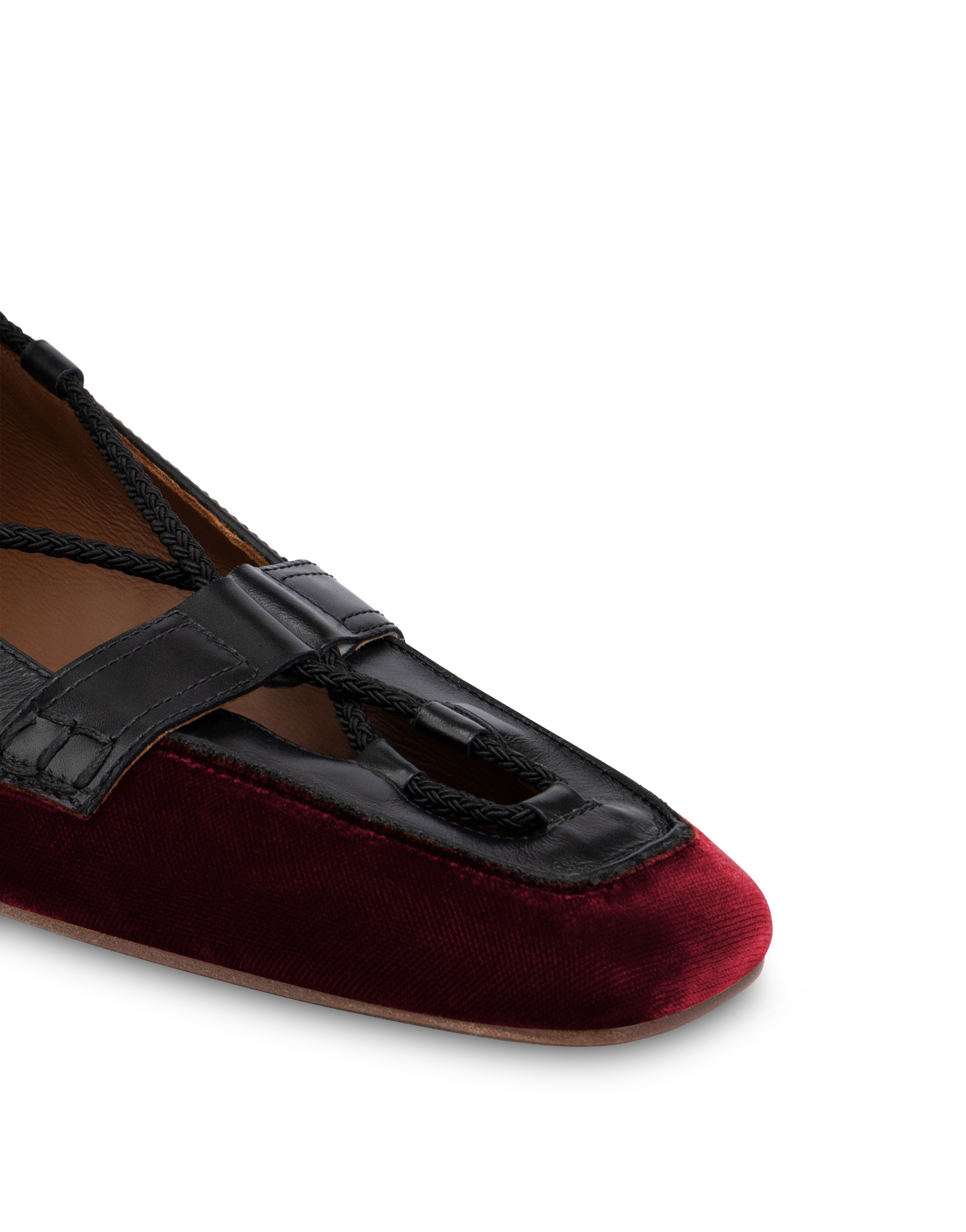 Un’interpretazione inedita e contemporanea del classico mocassino Pollini, il mocassino Malibù si distingue per il suo design sofisticato e sorprendente. Realizzato in velluto e vitello con fodera in pelle, presenta un tacco flat e suola in cuoio, unendo comfort e artigianalità.La vaschetta con morsetto in pelle è reinventata come una sequenza di passanti attraversati da un mignon in passamaneria a contrasto, creando un raffinato effetto corsetto che lascia intravedere il piede. L’allacciatura alla caviglia aggiunge un tocco femminile e grafico.La costruzione a sacchetto e la morbidezza dei materiali donano a questo modello un'attitude rilassata, ideale per chi desidera un look comodo ma di forte personalità.