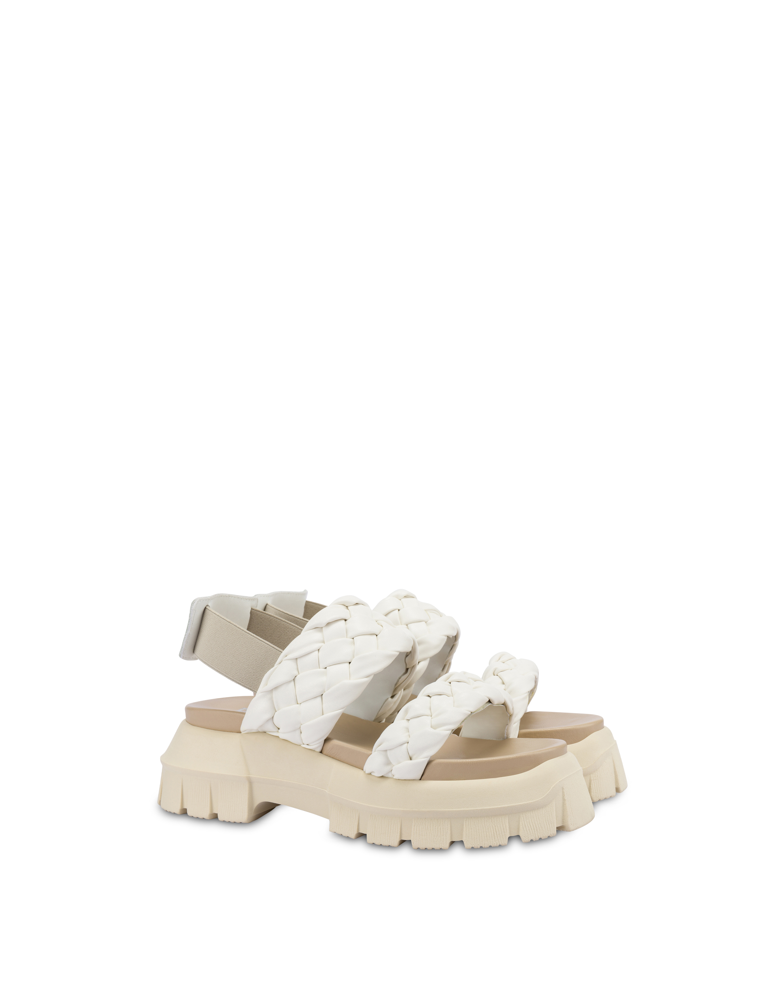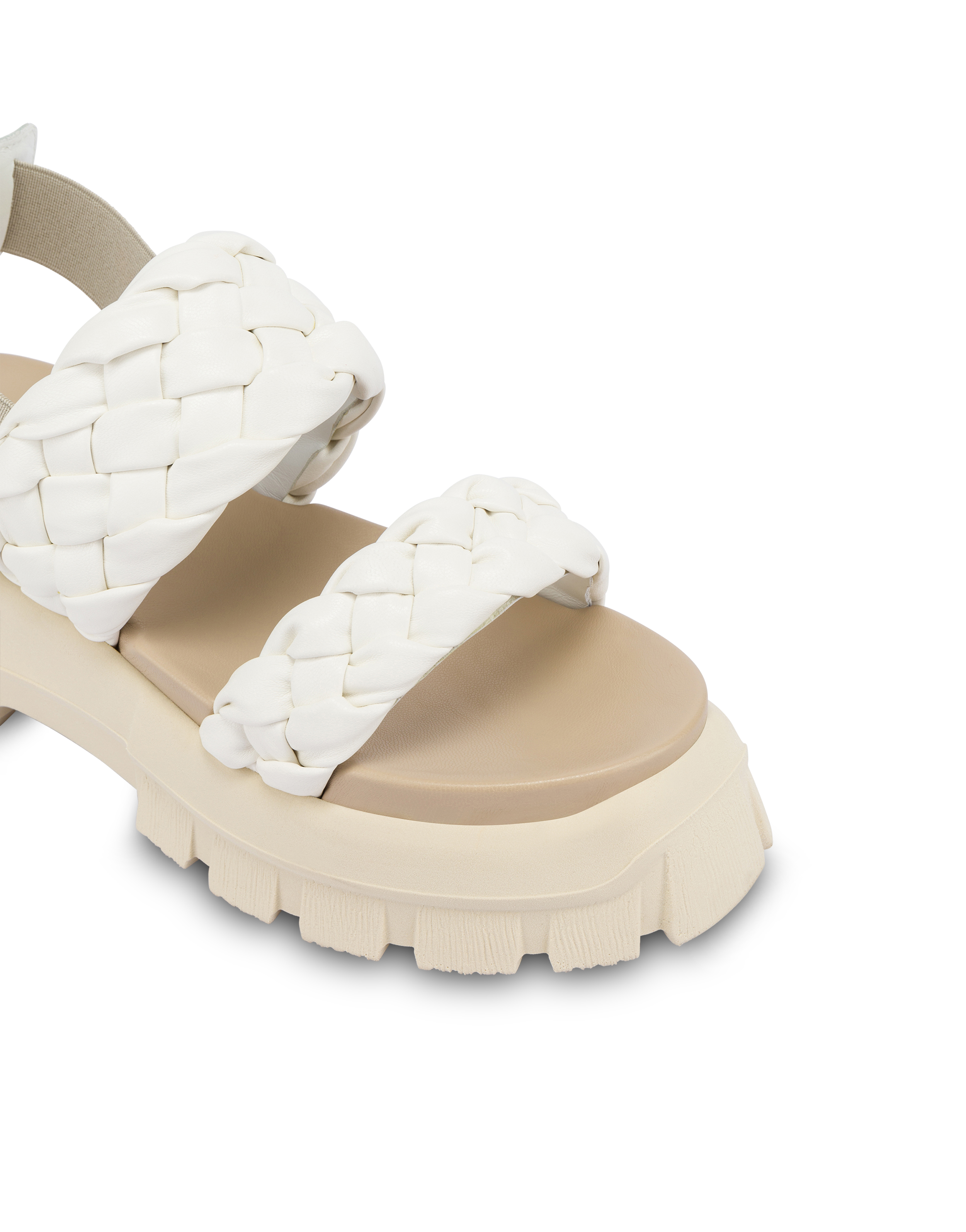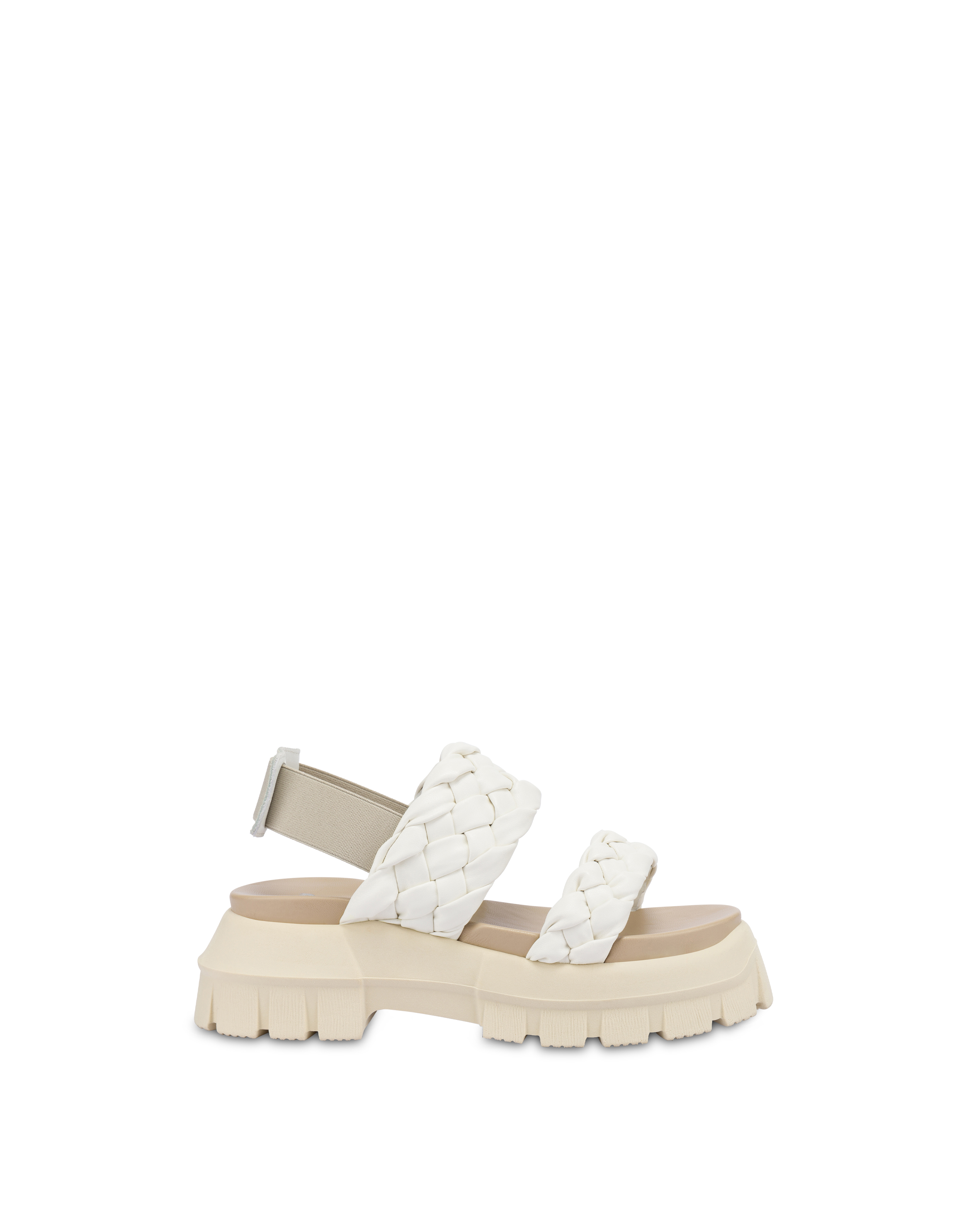 Sandalo con fasce realizzate con un morbido maxi intreccio dai volumi importanti. Elastico sul tallone per una calzata più confortevole. Fondo carrarmato estremamente leggero altezza 60 mm.