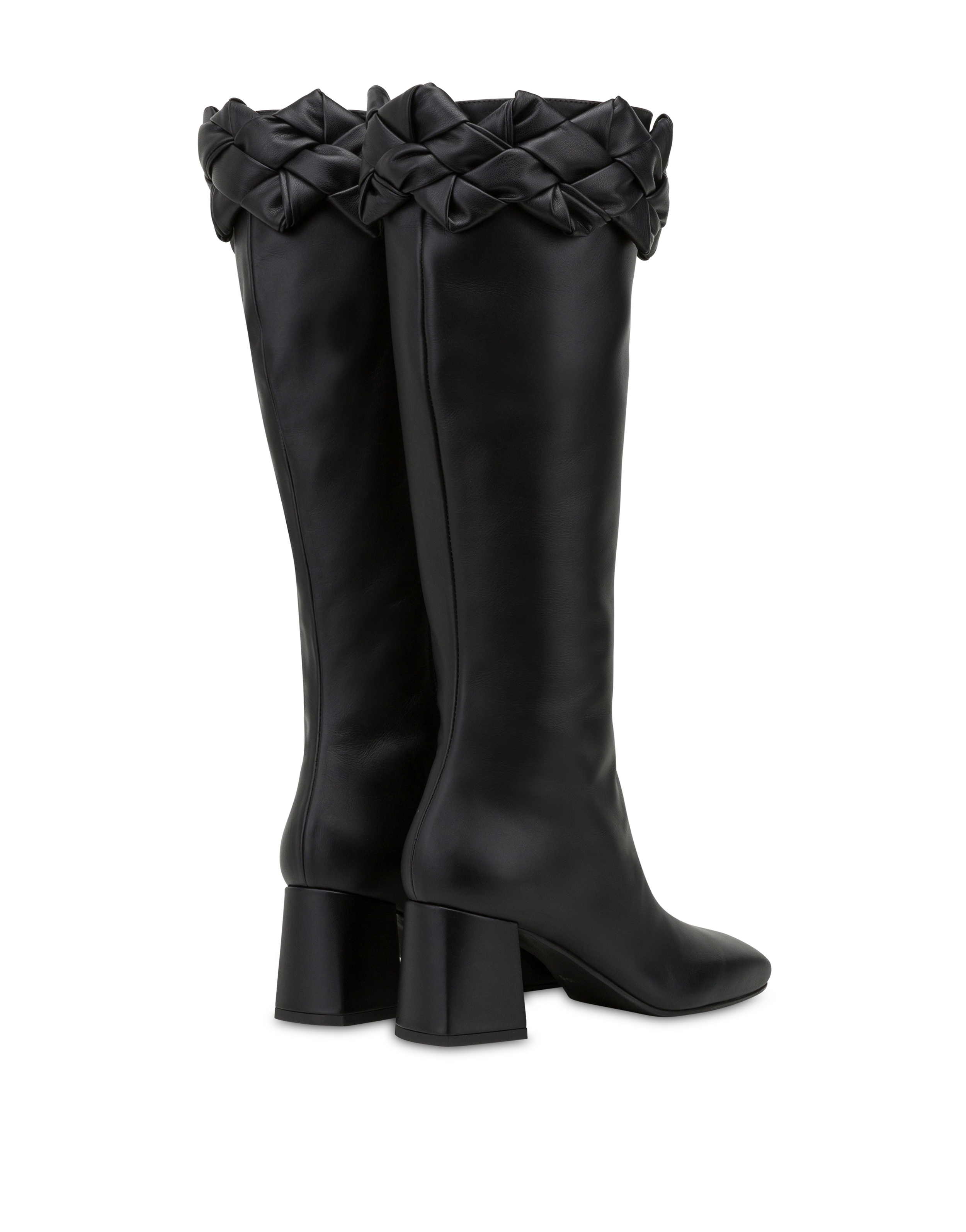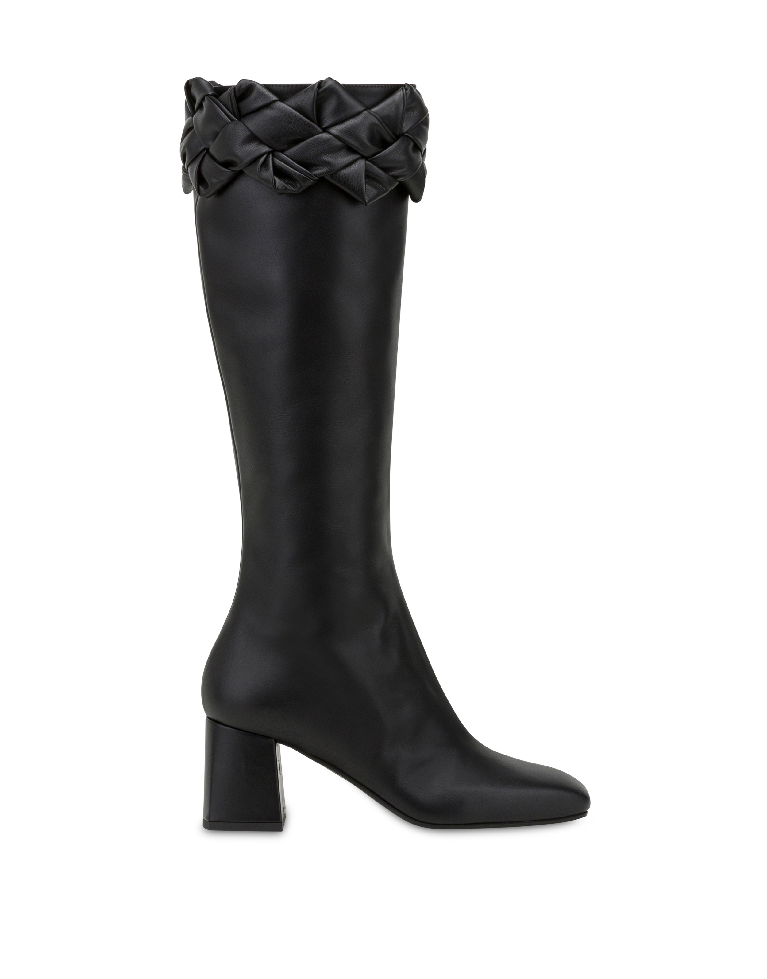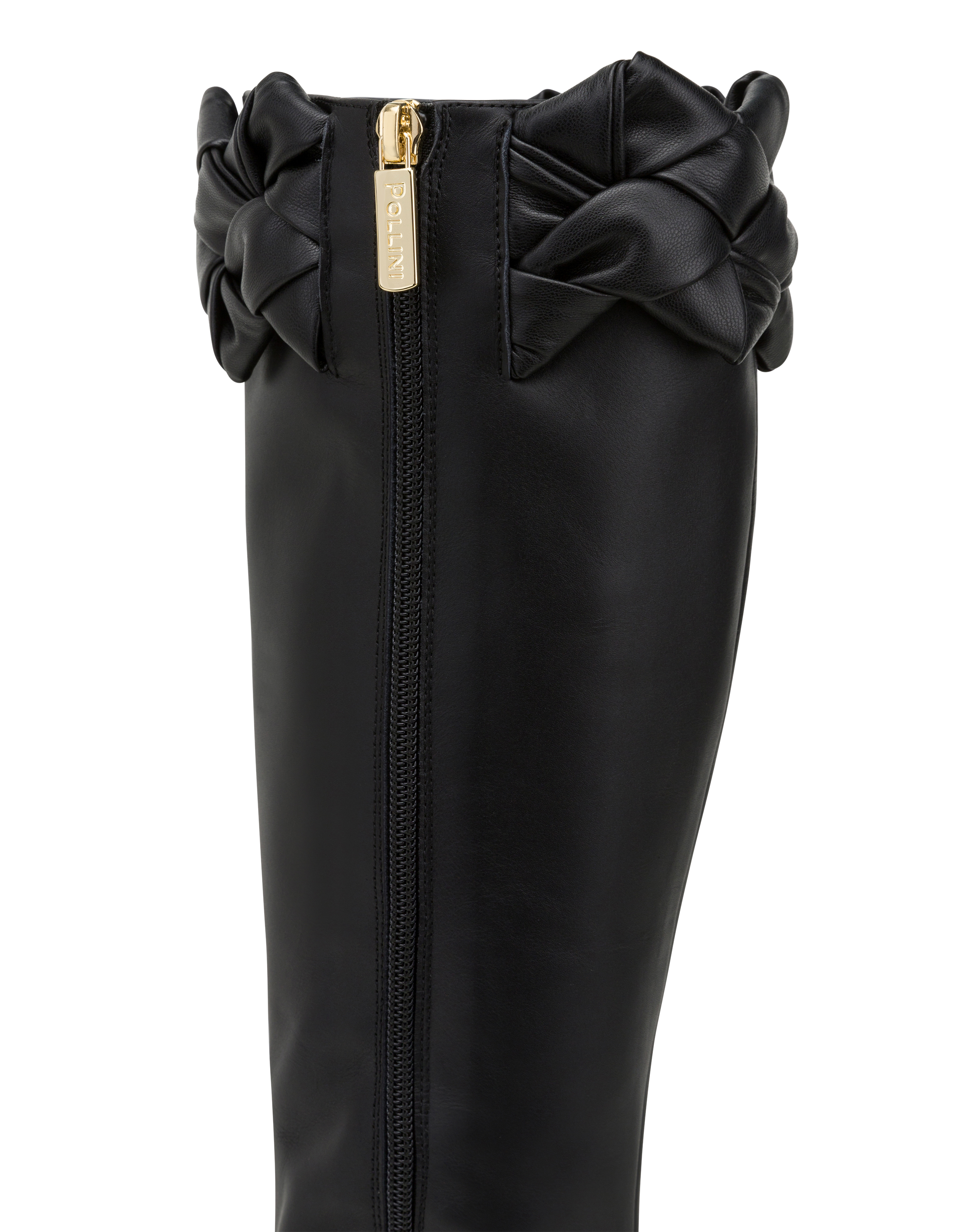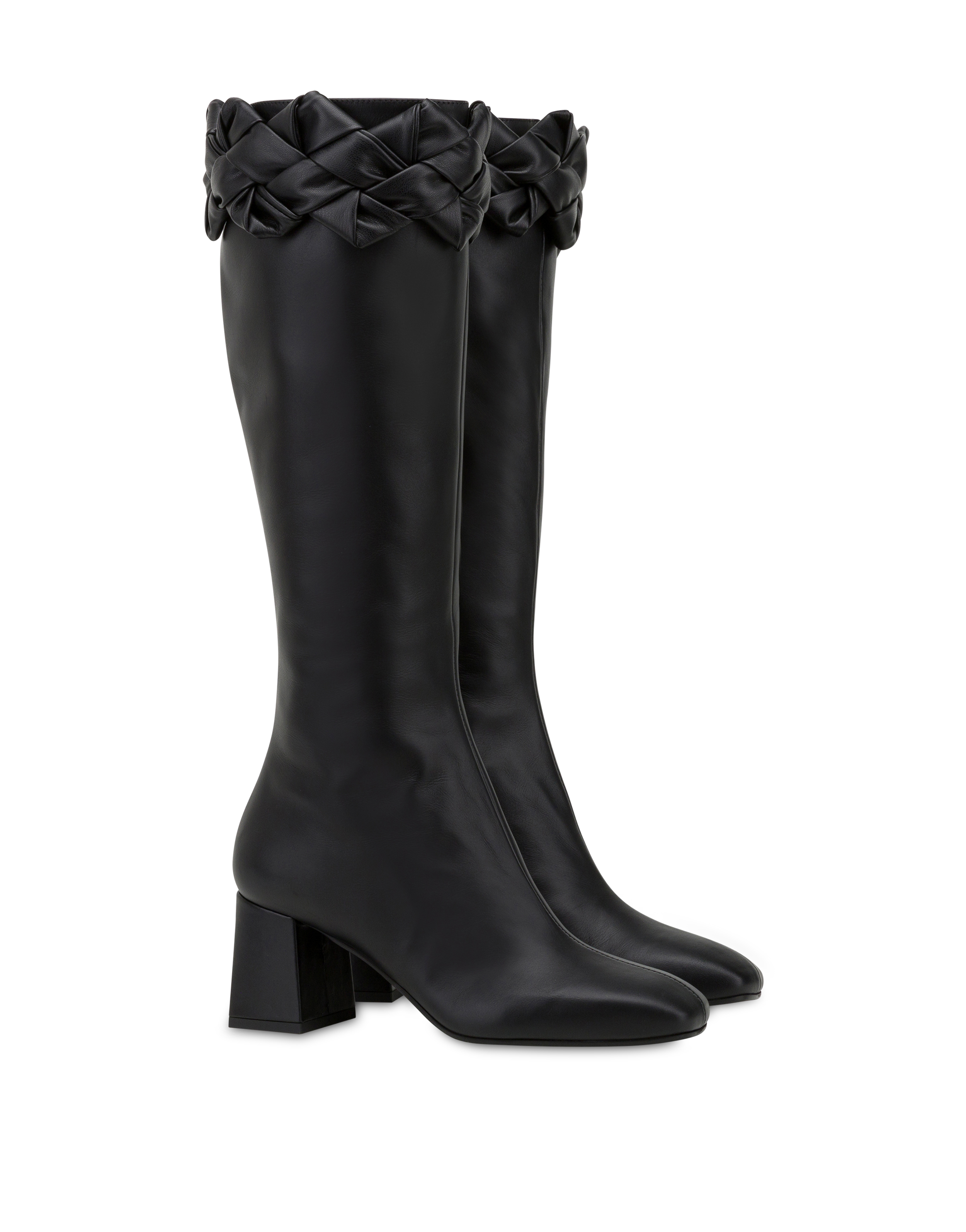 Stivale in vitello su tacco chunky. La tomaia è arricchita da un sofisticato intreccio che conferisce al modello un appeal raffinato e deciso allo stesso tempo.