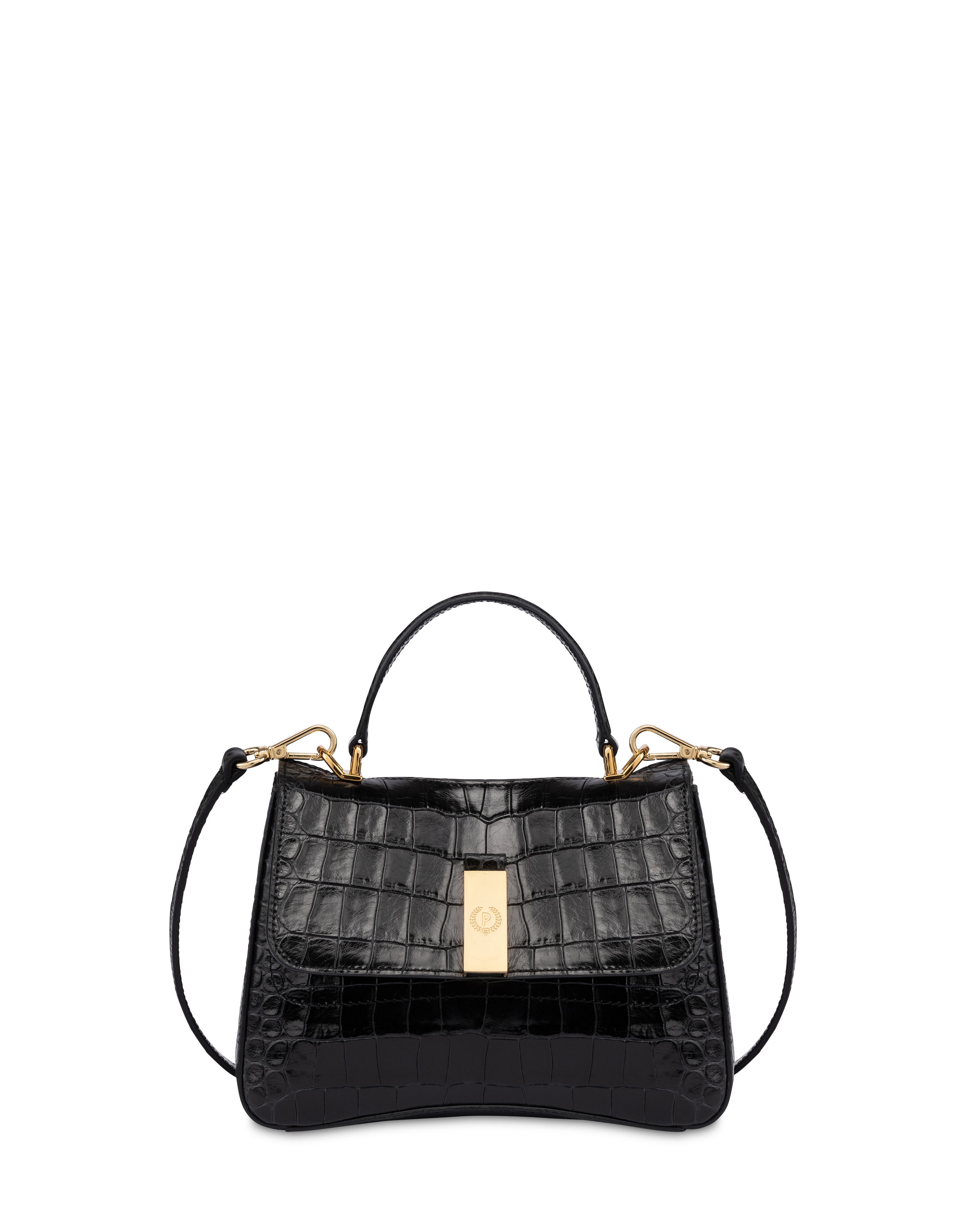 Un’icona di stile raffinato, la Top Handle Bag Muse si distingue per la sua silhouette strutturata e il fascino senza tempo. In questa versione in vitello stampa cocco, la texture esotica dona un carattere deciso e sofisticato, esaltato dalla finitura lucida e dai dettagli in galvanica gold.Il manico e la tracolla in pelle permettono un’elegante doppia portabilità. La chiusura magnetica rivela un interno foderato con tasca con zip e label logata in pelle. Il tocco finale è l’accessorio metallico frontale, impreziosito dal logo inciso “P Alloro”, segno distintivo della Maison.
